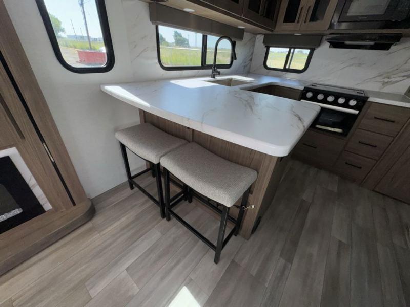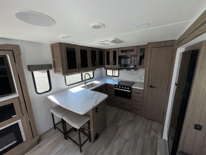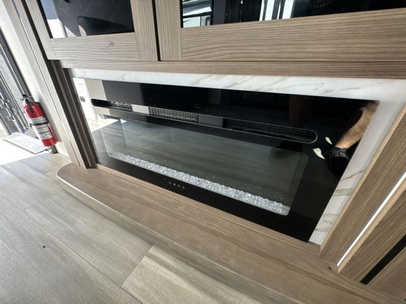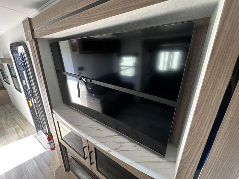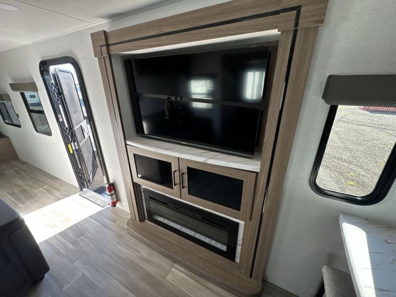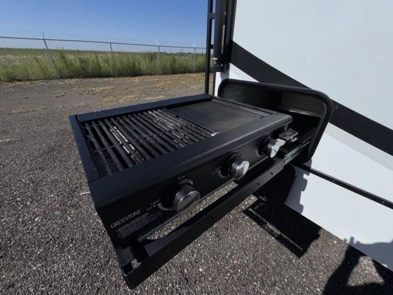 Start camping in luxury with this travel trailer! Prepare your best home cooked meals in the rear kitchen with the three burner cooktop, 10 cu. ft. 12V refrigerator, tip-out trash can, and even two bar stools to enjoy your morning coffee while reading the newspaper. Freshen up in the full bathroom with the 30" x 36" shower or head outside to relax under one of the two awnings. There is even an outdoor griddle/grill underneath one of the awnings to protect you while you grill up some juicy burgers, plus an outside 32" TV. The front private bedroom has a queen bed for you to lay your head on at night and has wardrobe nightstands for your items. Relax in true comfort each night on one of the two furniture spots in front of the entertainment center with a 50" class HDTV with a fireplace below it!