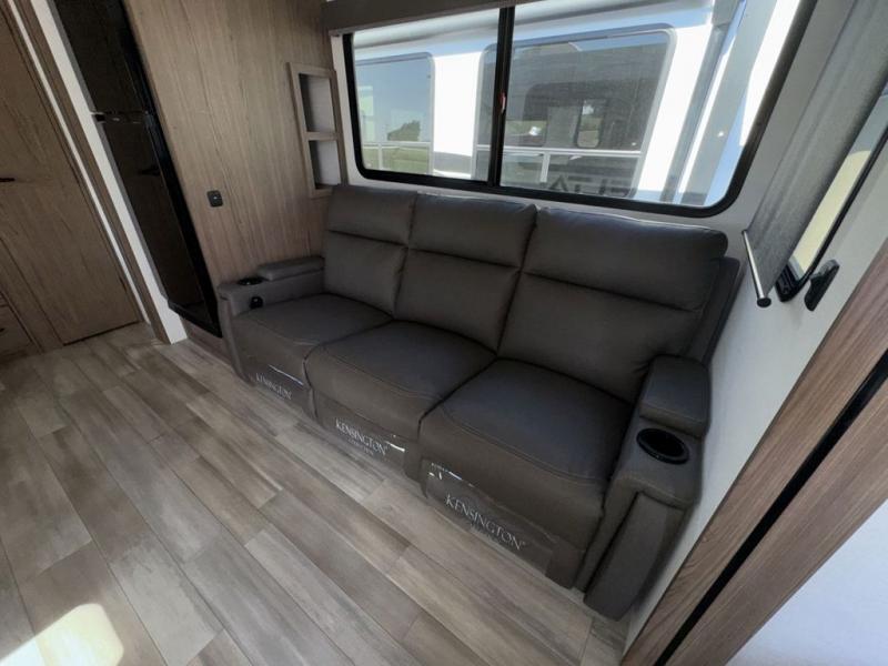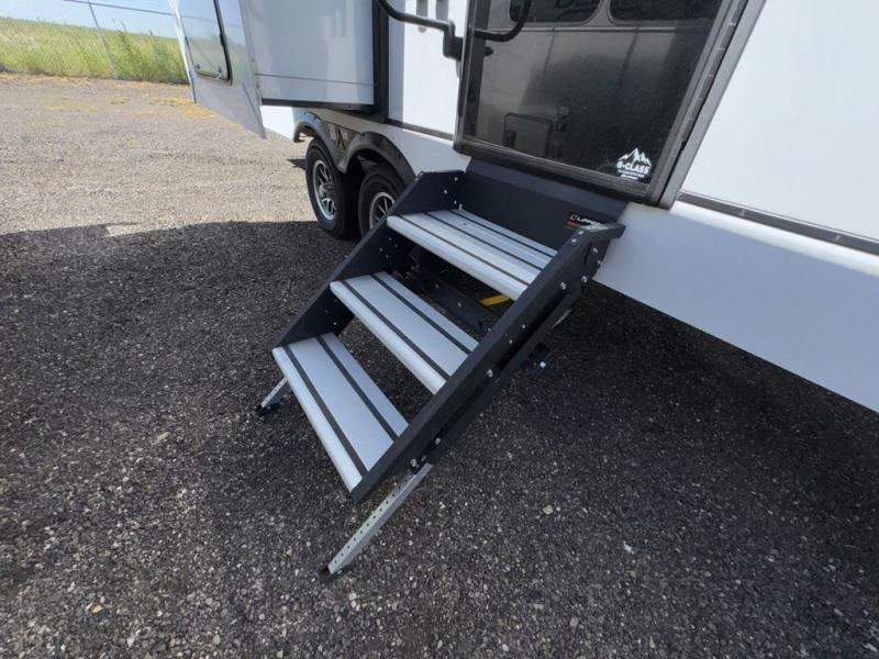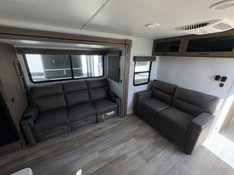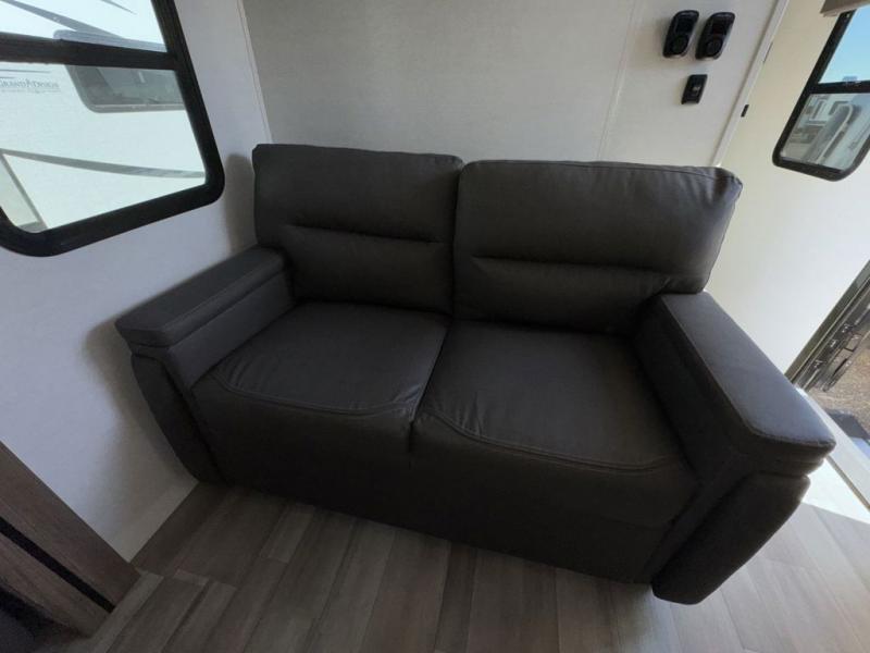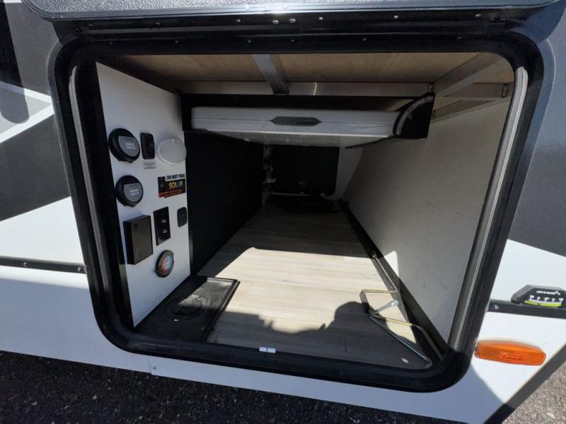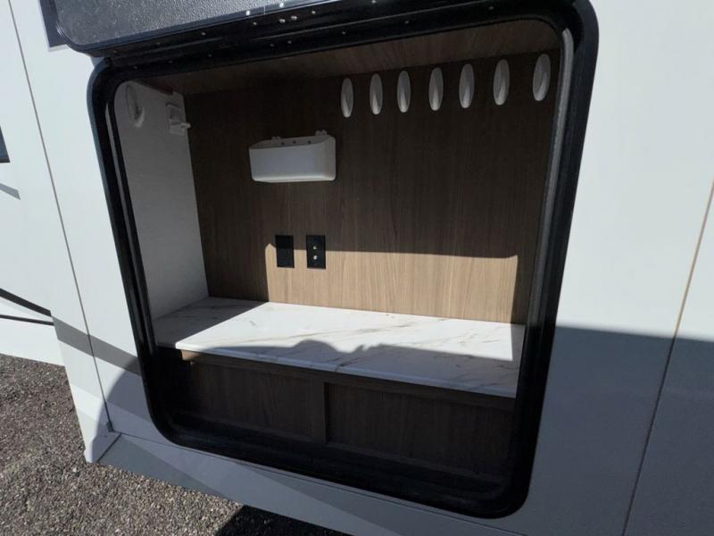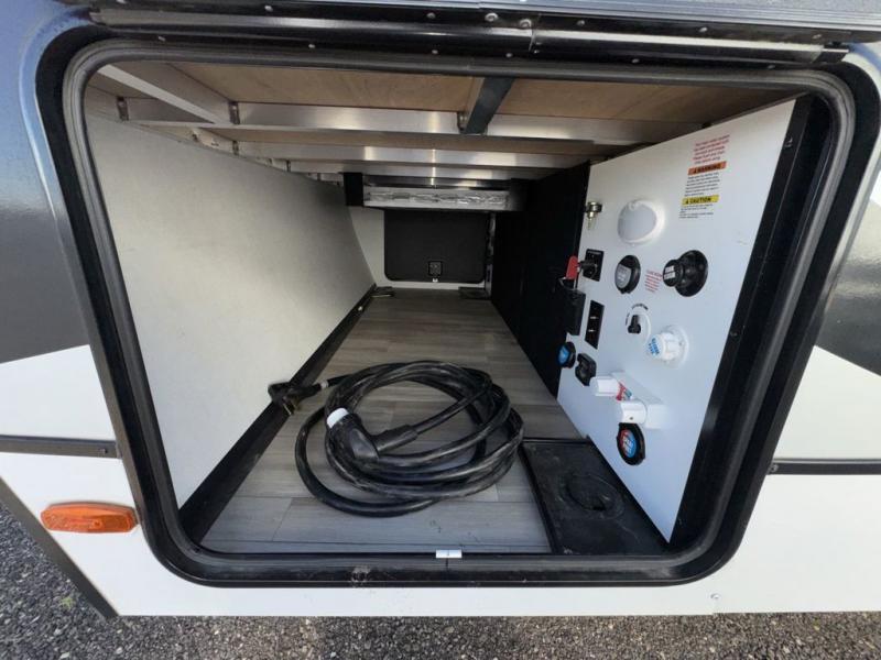 Start camping in luxury with this travel trailer! Prepare your best home cooked meals in the rear kitchen with the three burner cooktop, 10 cu. ft. 12V refrigerator, tip-out trash can, and even two bar stools to enjoy your morning coffee while reading the newspaper. Freshen up in the full bathroom with the 30" x 36" shower or head outside to relax under one of the two awnings. There is even an outdoor griddle/grill underneath one of the awnings to protect you while you grill up some juicy burgers, plus an outside 32" TV. The front private bedroom has a queen bed for you to lay your head on at night and has wardrobe nightstands for your items. Relax in true comfort each night on one of the two furniture spots in front of the entertainment center with a 50" class HDTV with a fireplace below it!