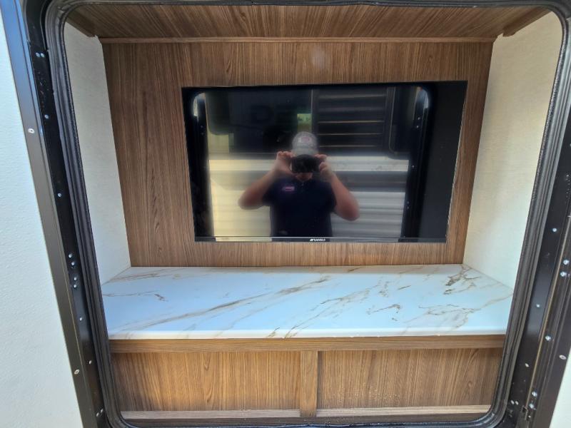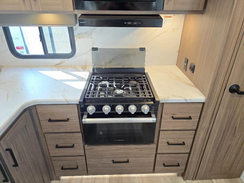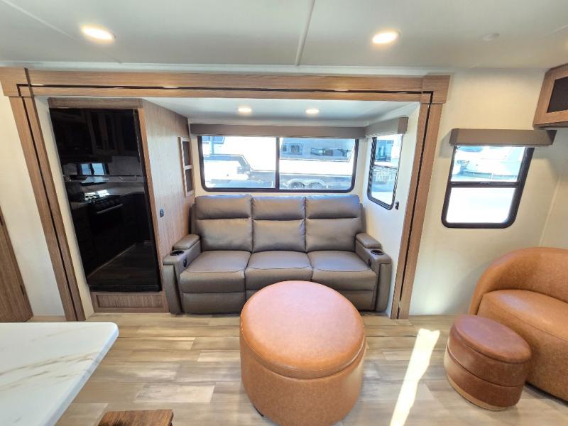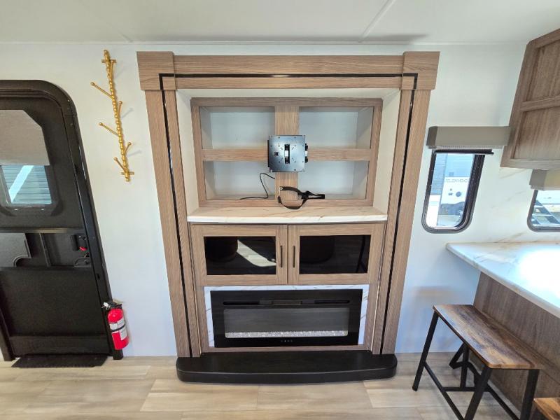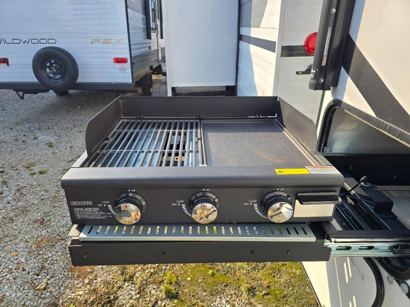 Start camping in luxury with this travel trailer! Prepare your best home cooked meals in the rear kitchen with the three burner cooktop, 10 cu. ft. 12V refrigerator, tip-out trash can, and even two bar stools to enjoy your morning coffee while reading the newspaper. Freshen up in the full bathroom with the 30" x 36" shower or head outside to relax under one of the two awnings. There is even an outdoor griddle/grill underneath one of the awnings to protect you while you grill up some juicy burgers, plus an outside 32" TV. The front private bedroom has a queen bed for you to lay your head on at night and has wardrobe nightstands for your items. Relax in true comfort each night on one of the two furniture spots in front of the entertainment center with a 50" class HDTV with a fireplace below it!
