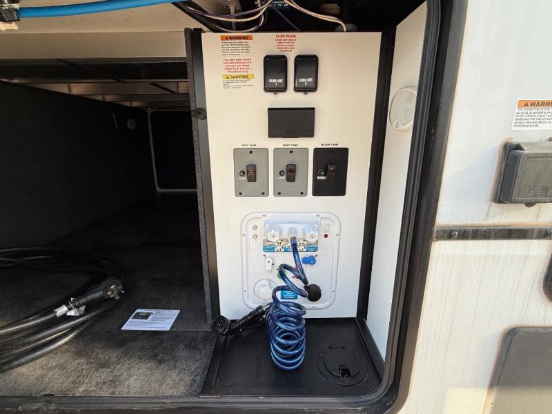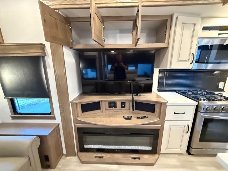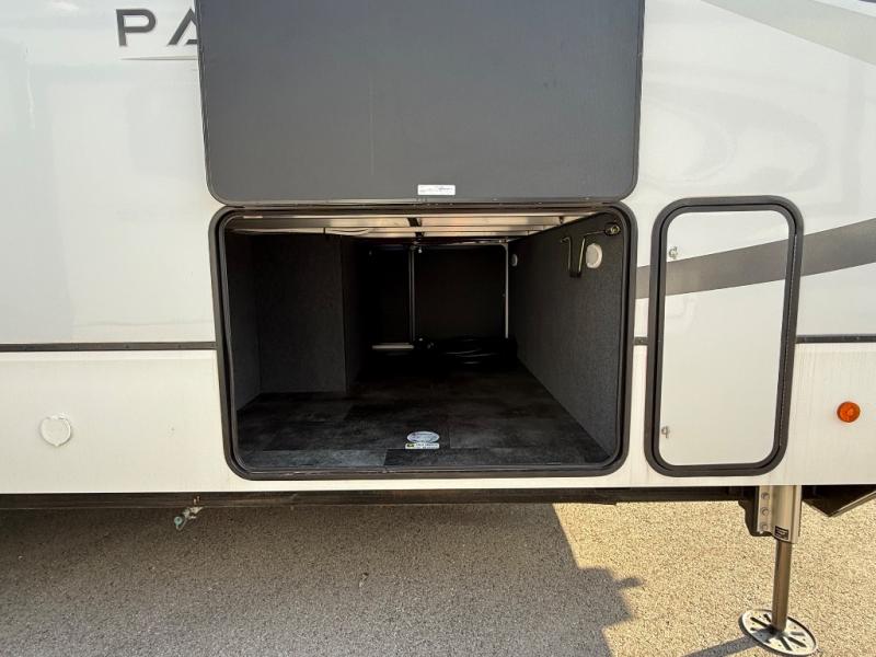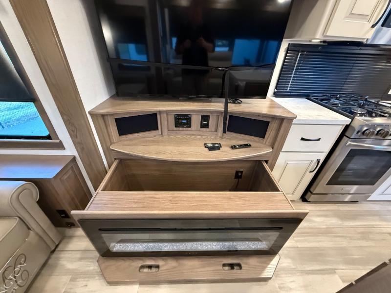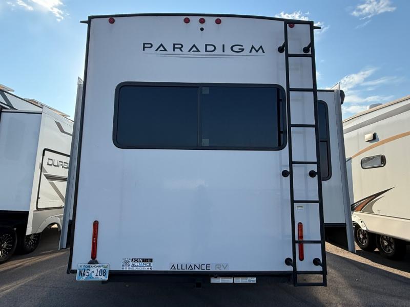 Search for the best views, the nicest RV park, or a place you haven't seen for years with this Paradigm in tow! There is a king bed slide in the master bedroom, a Smart TV, and a dresser with flip-up hidden storage for your belongings. The full bathroom offers a large residential shower, a porcelain toilet with a soft close seat, and storage for your linens, while the kitchen gives you two pantries, an island with a large undermount single basin sink and dishwasher prep if you want the option for easy clean up. You will also have an Insignia residential microwave and range, plus a 3.73 cu. ft. oven to make meals. When you're ready to relax for the evening, head to the rear living area to enjoy the dual recliner love seat across from the 50" Smart TV and fireplace!