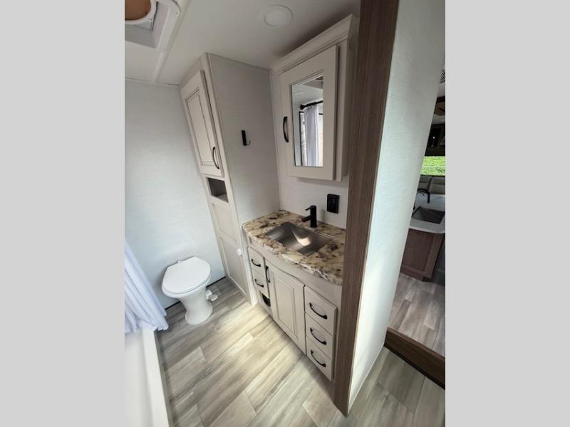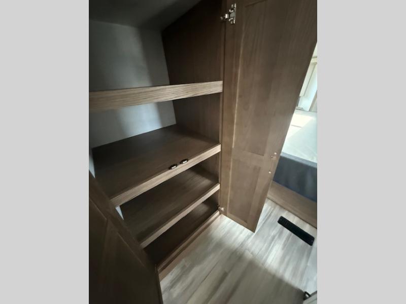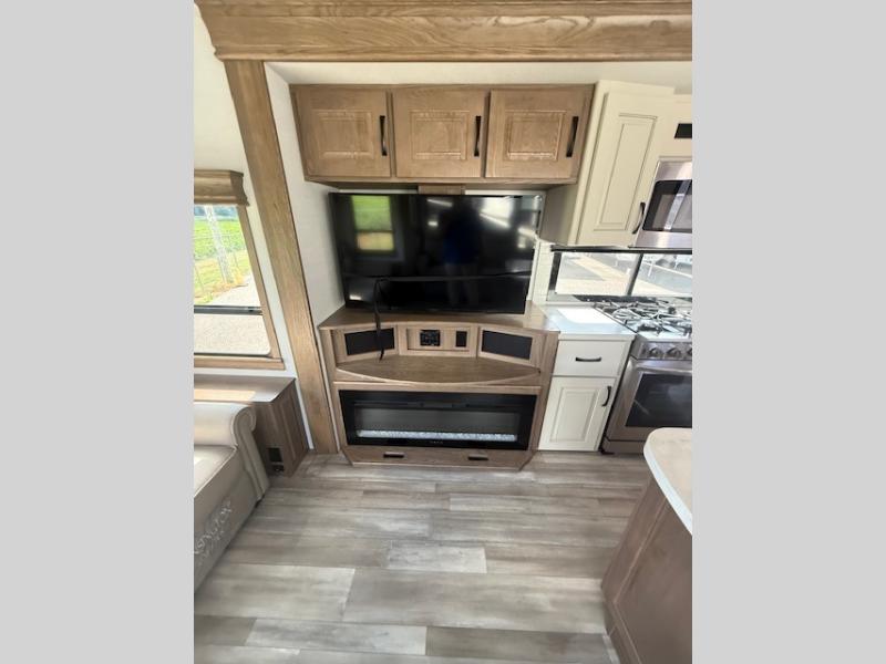 Travel to see family and friends while living in this RV or while on vacation! You will love the spacious rear living area thanks to the dual opposing slides which include the kitchen amenities and the 50" Smart TV with pull-out fireplace storage. There is a dual recliner love seat which is super comfortable and the floating dinette table with four chairs will be perfect to dine at. The kitchen island includes a sink and counter space to utilize many ways, plus there is dishwasher prep if you want to add that option. The full bathroom is up the steps towards the front bedroom and includes a 61" x 30" shower. You even have more floor space in the hallway thanks to the third slide out which includes shelf storage, plus more shelves and a king bed in the bedroom.