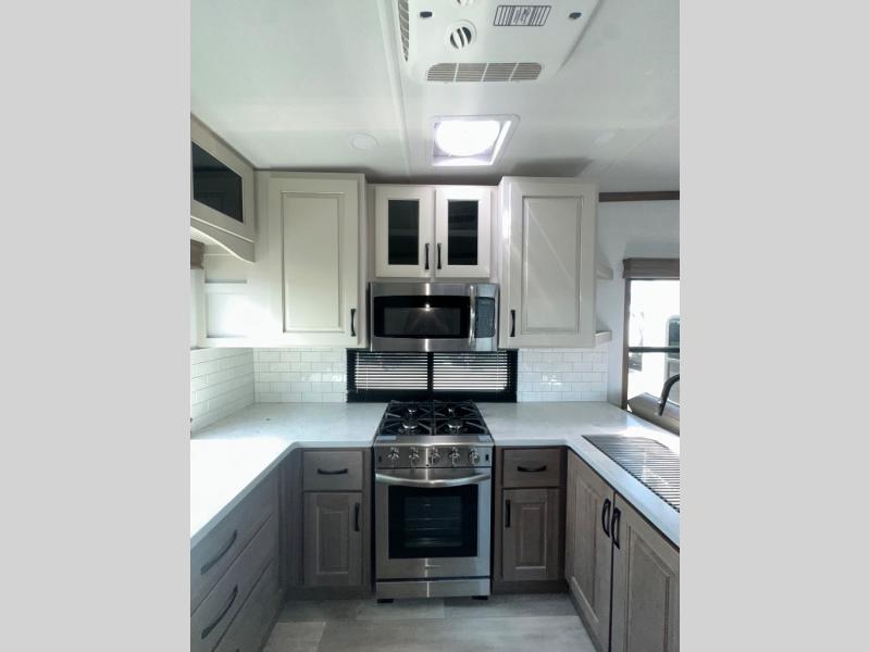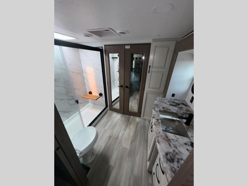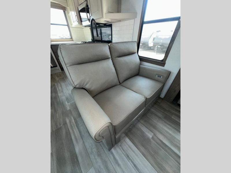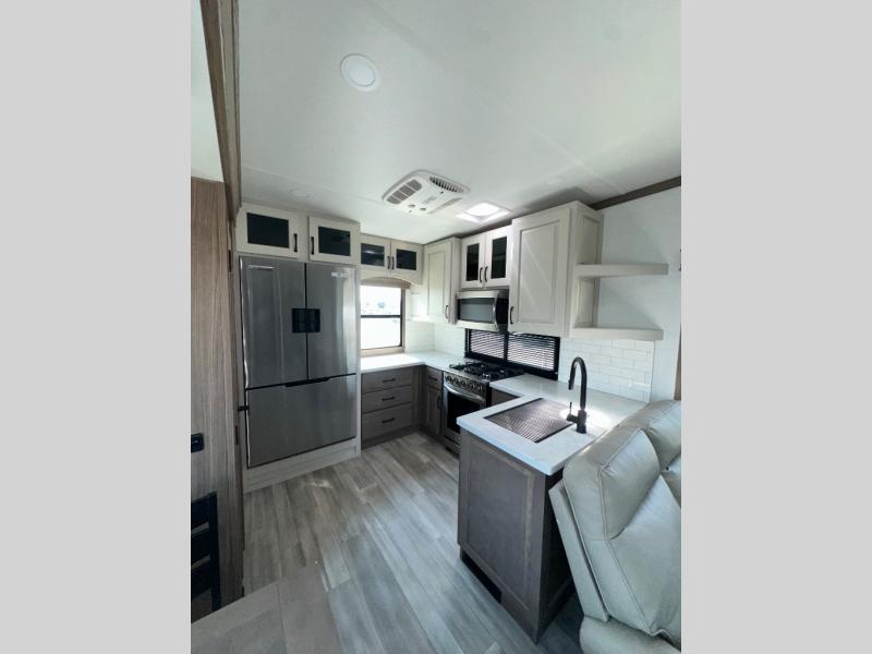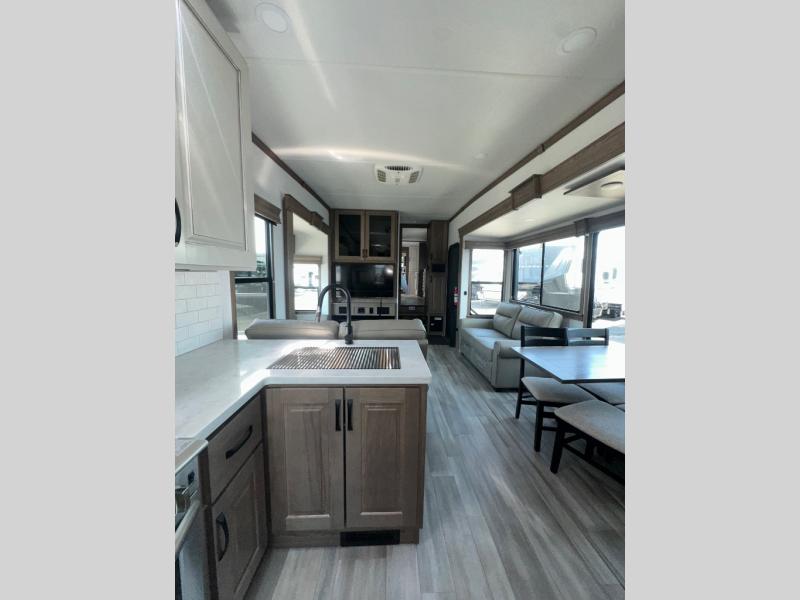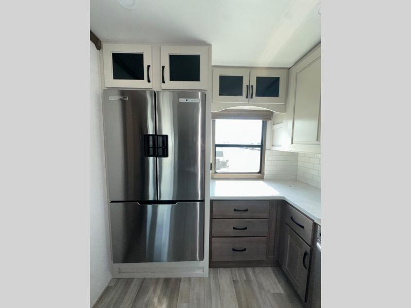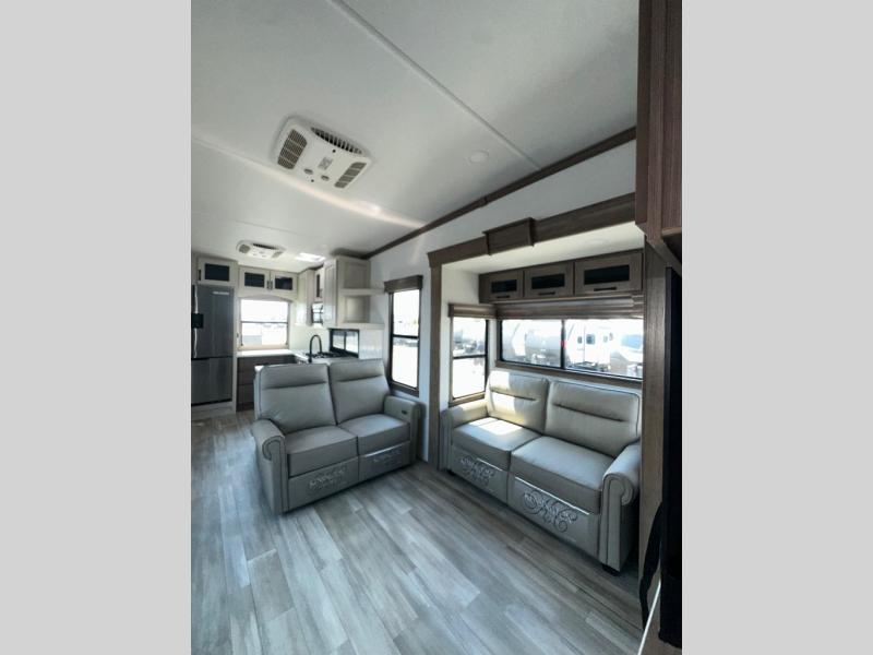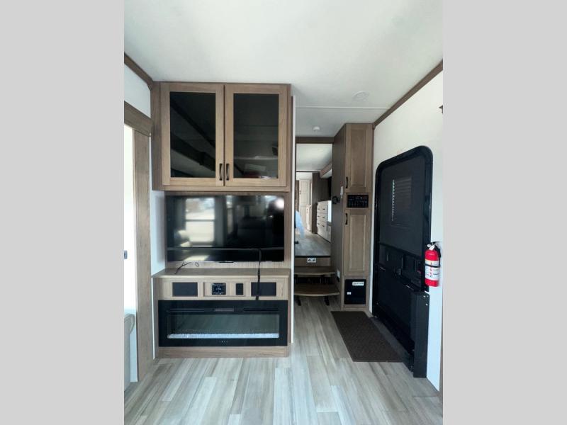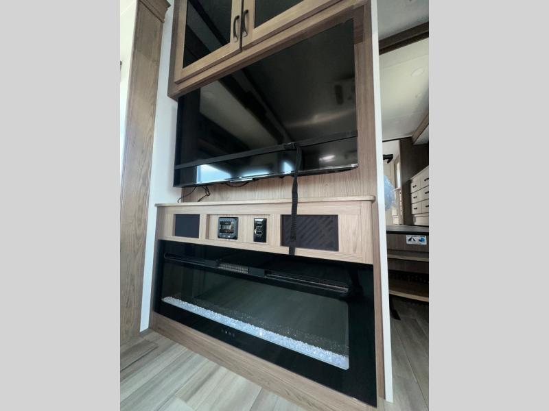 You won't want to camp any other way once you step inside this fifth wheel! the chef will enjoy all of the space in the rear kitchen with ample counter space, a 19 cu. ft. 12 volt residential refrigerator, and a pantry for snacks. Everyone will love to meet in the middle living area that includes dual sleeper sofas and a dual recliner loveseat across from the 50" Smart TV and fireplace. The half bathroom is nearby for quick bathroom breaks too. You will feel right at home in the master suite with a king bed slide to lay your head on at night, a flip top dresser with a Smart TV above it to watch your movies in true comfort, and a seat with storage, plus access to the front full bathroom. Inside the bathroom, you will find a 61" x 30" shower to freshen up in and a walk-in closet with a hamper, shelves, and washer and dryer prep for clean clothes throughout your entire trip!
