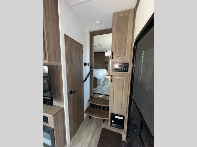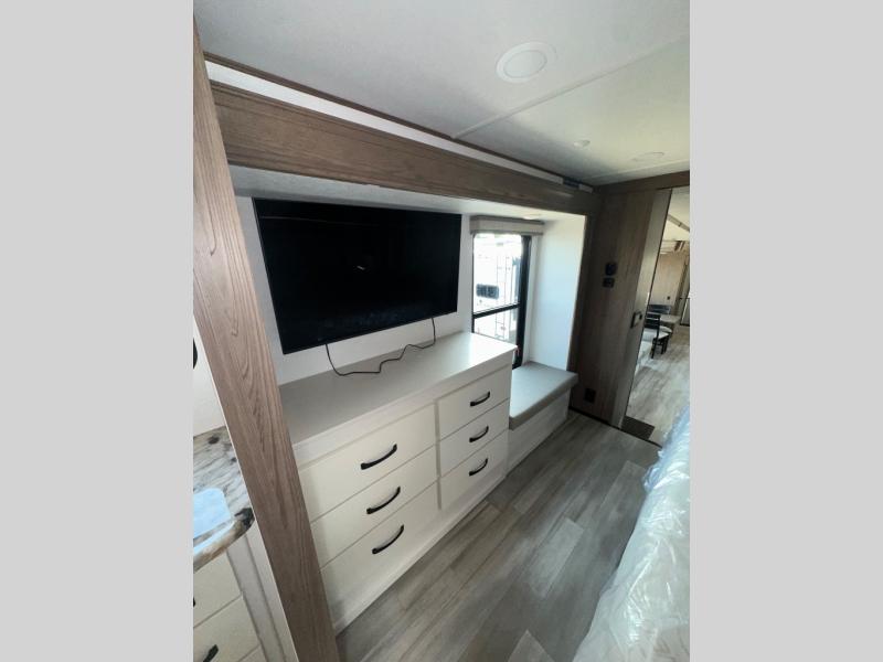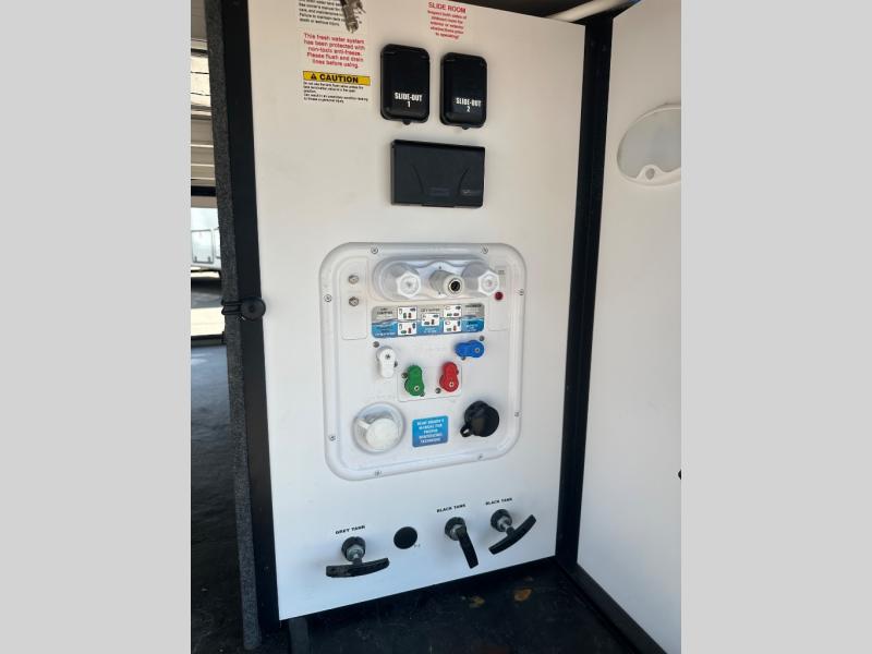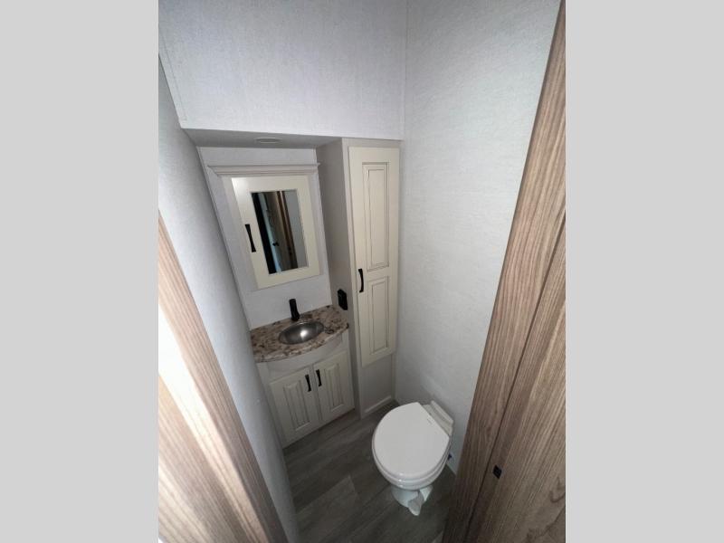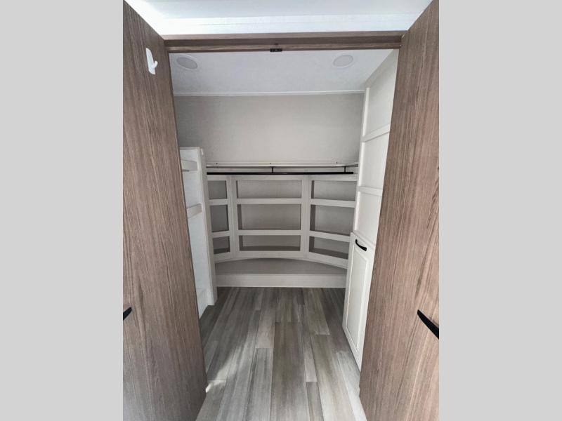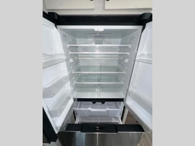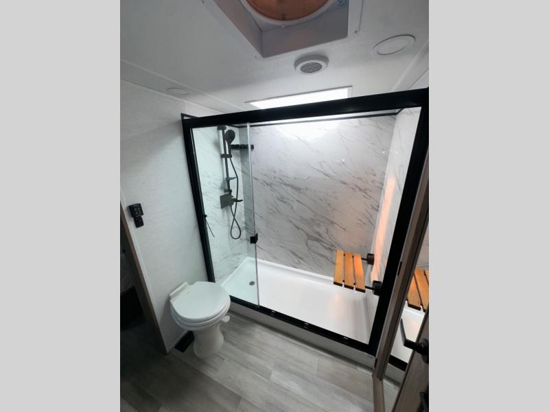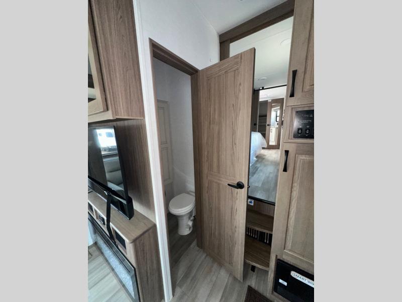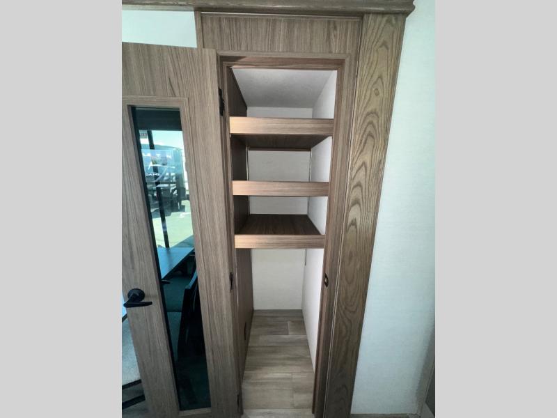 You won't want to camp any other way once you step inside this fifth wheel! the chef will enjoy all of the space in the rear kitchen with ample counter space, a 19 cu. ft. 12 volt residential refrigerator, and a pantry for snacks. Everyone will love to meet in the middle living area that includes dual sleeper sofas and a dual recliner loveseat across from the 50" Smart TV and fireplace. The half bathroom is nearby for quick bathroom breaks too. You will feel right at home in the master suite with a king bed slide to lay your head on at night, a flip top dresser with a Smart TV above it to watch your movies in true comfort, and a seat with storage, plus access to the front full bathroom. Inside the bathroom, you will find a 61" x 30" shower to freshen up in and a walk-in closet with a hamper, shelves, and washer and dryer prep for clean clothes throughout your entire trip!