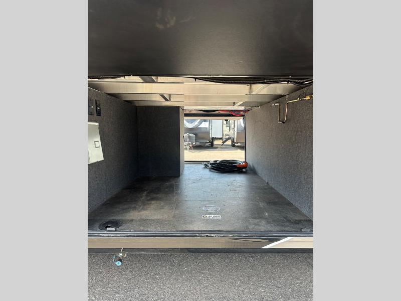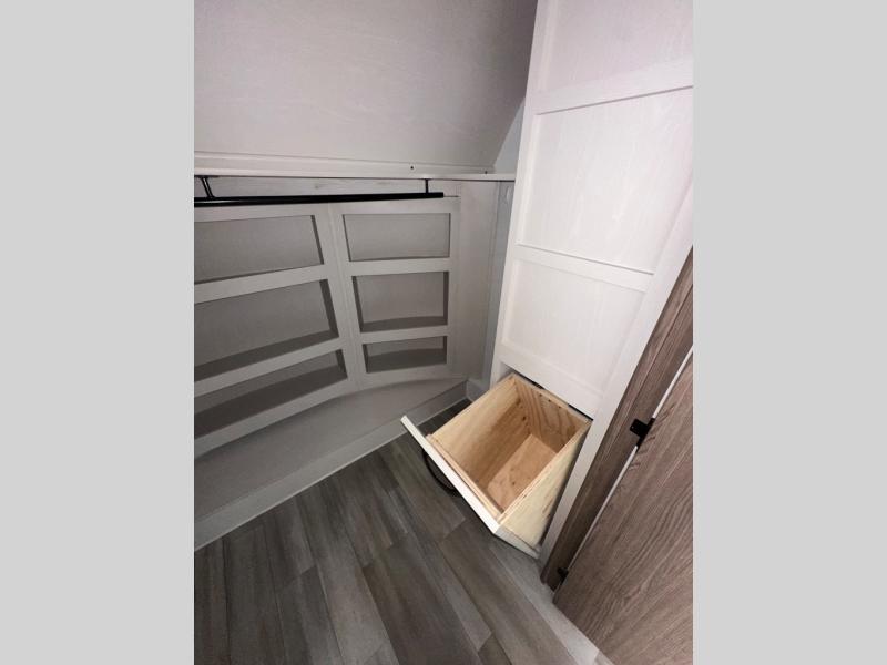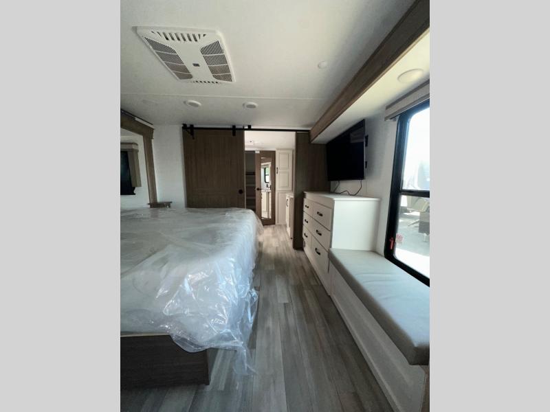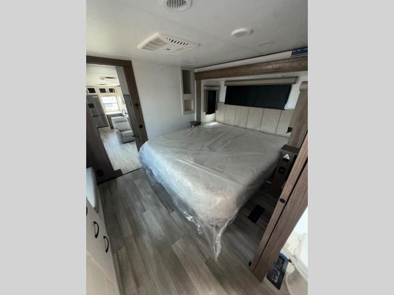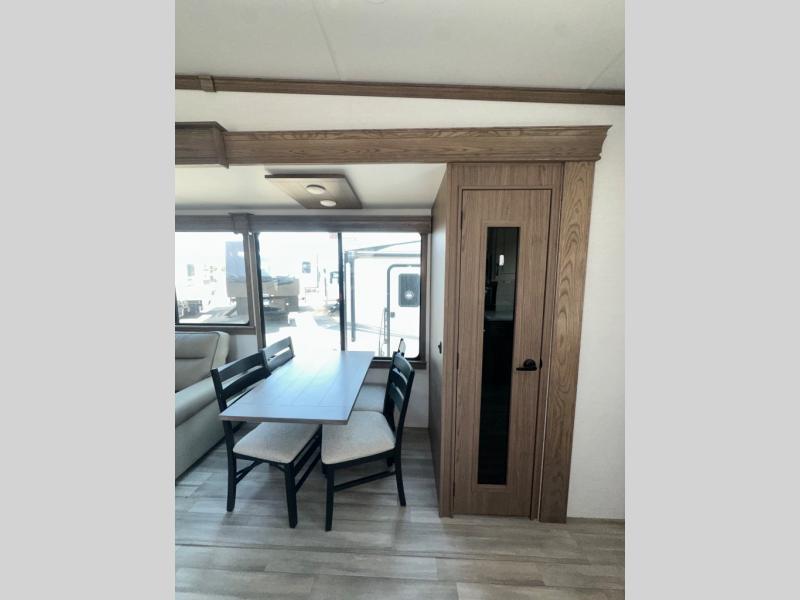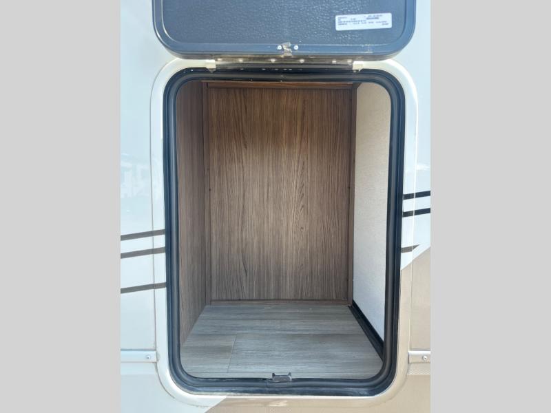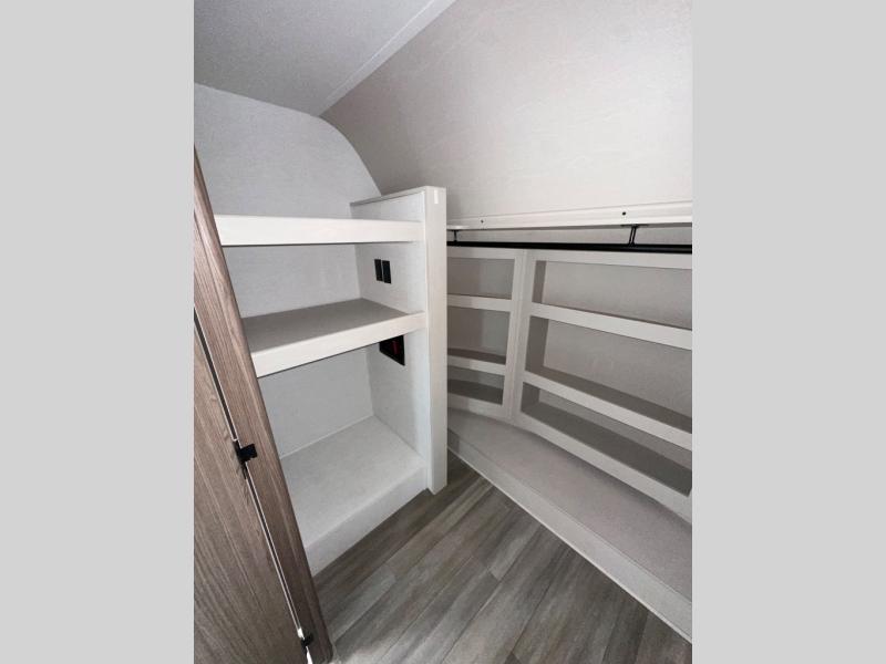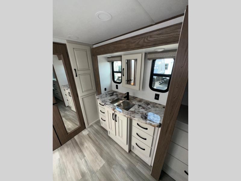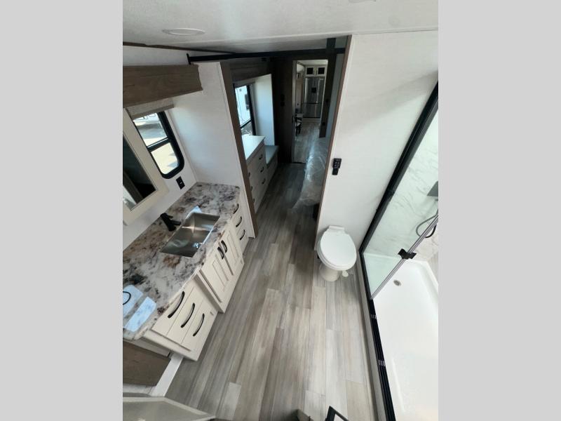 You won't want to camp any other way once you step inside this fifth wheel! the chef will enjoy all of the space in the rear kitchen with ample counter space, a 19 cu. ft. 12 volt residential refrigerator, and a pantry for snacks. Everyone will love to meet in the middle living area that includes dual sleeper sofas and a dual recliner loveseat across from the 50" Smart TV and fireplace. The half bathroom is nearby for quick bathroom breaks too. You will feel right at home in the master suite with a king bed slide to lay your head on at night, a flip top dresser with a Smart TV above it to watch your movies in true comfort, and a seat with storage, plus access to the front full bathroom. Inside the bathroom, you will find a 61" x 30" shower to freshen up in and a walk-in closet with a hamper, shelves, and washer and dryer prep for clean clothes throughout your entire trip!