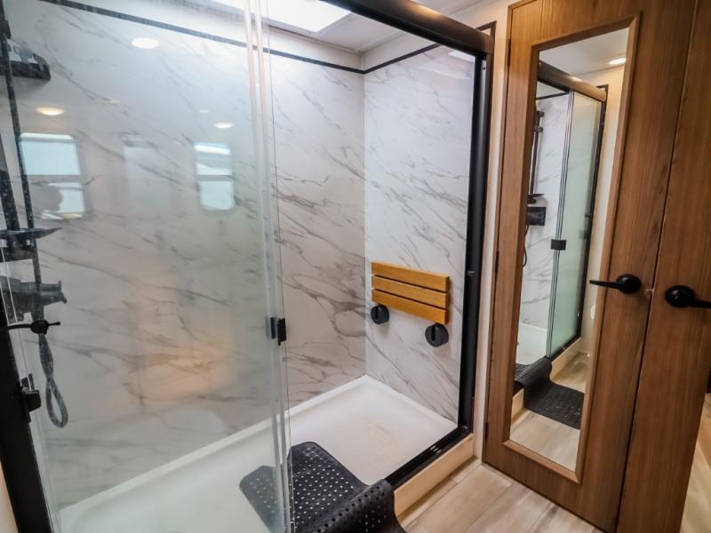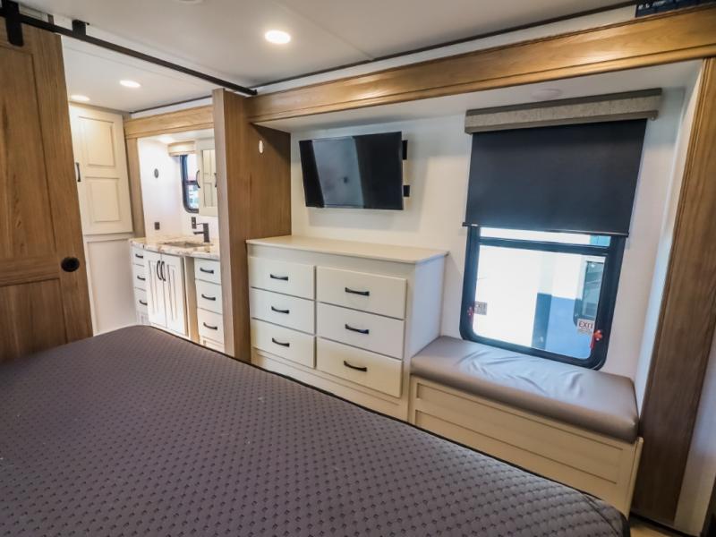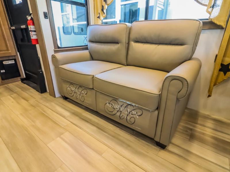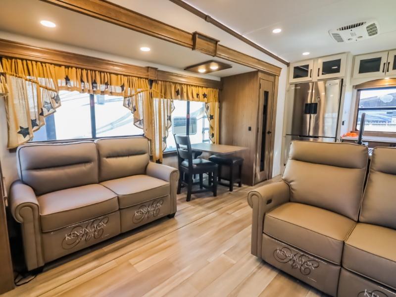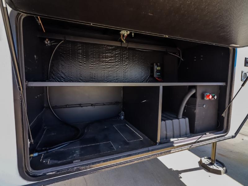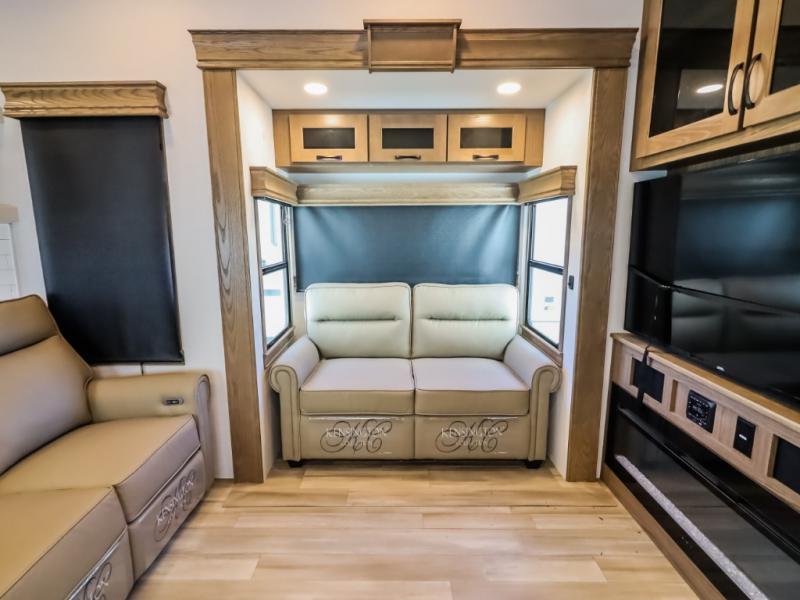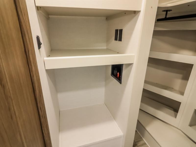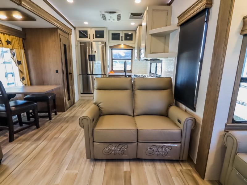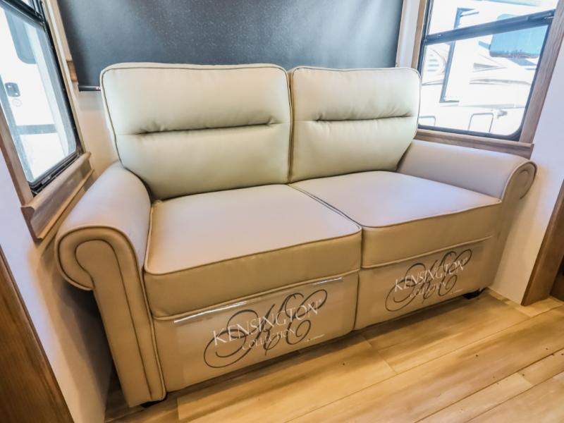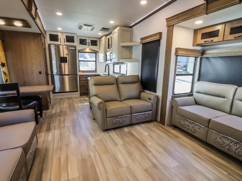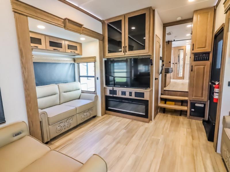 You won't want to camp any other way once you step inside this fifth wheel! the chef will enjoy all of the space in the rear kitchen with ample counter space, a 19 cu. ft. 12 volt residential refrigerator, and a pantry for snacks. Everyone will love to meet in the middle living area that includes dual sleeper sofas and a dual recliner loveseat across from the 50" Smart TV and fireplace. The half bathroom is nearby for quick bathroom breaks too. You will feel right at home in the master suite with a king bed slide to lay your head on at night, a flip top dresser with a Smart TV above it to watch your movies in true comfort, and a seat with storage, plus access to the front full bathroom. Inside the bathroom, you will find a 61" x 30" shower to freshen up in and a walk-in closet with a hamper, shelves, and washer and dryer prep for clean clothes throughout your entire trip!