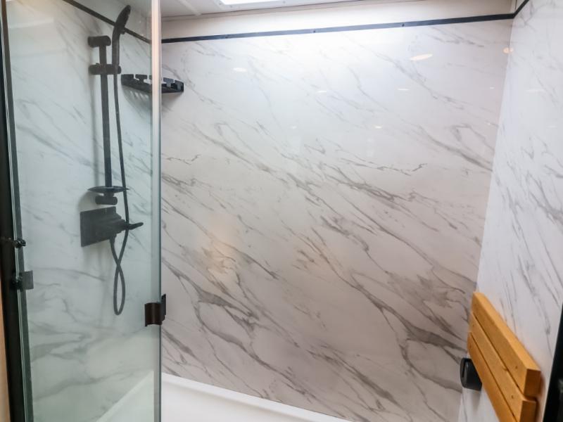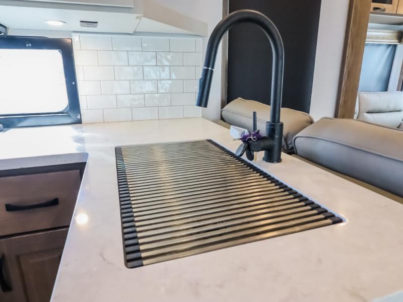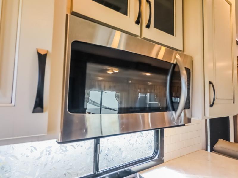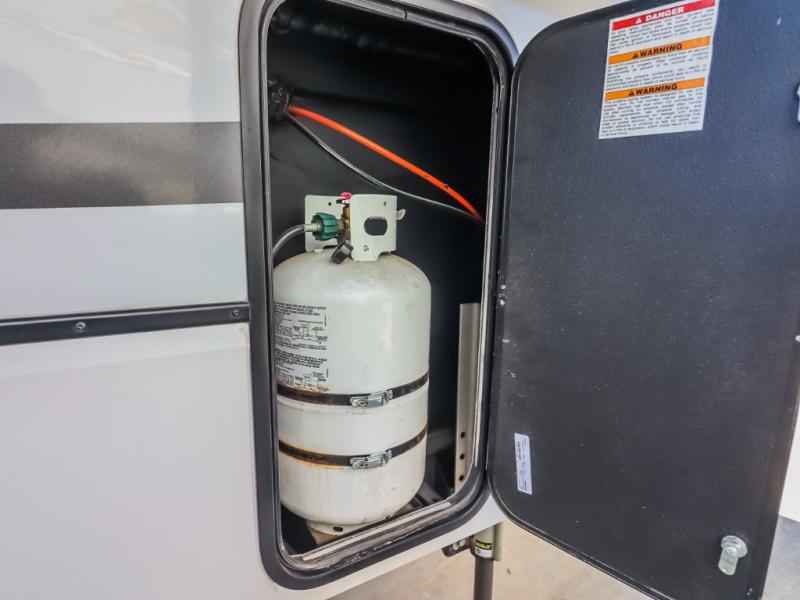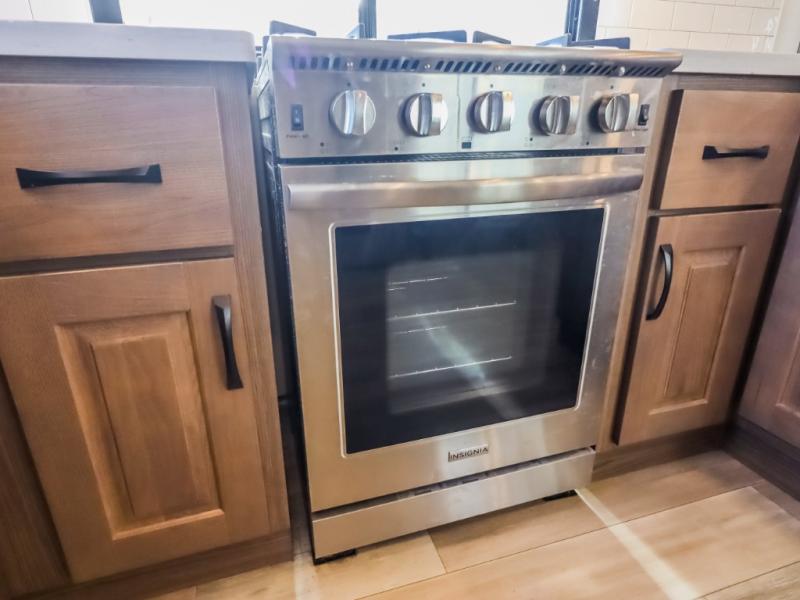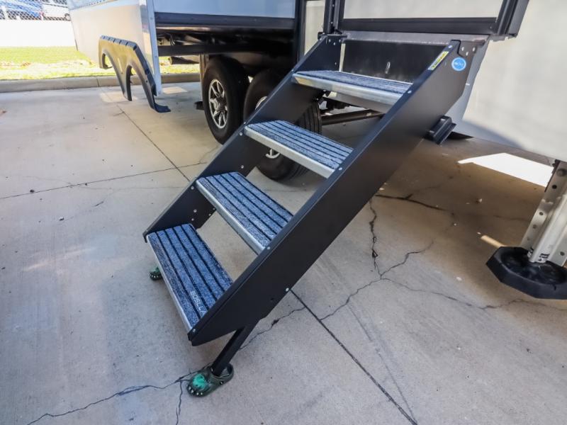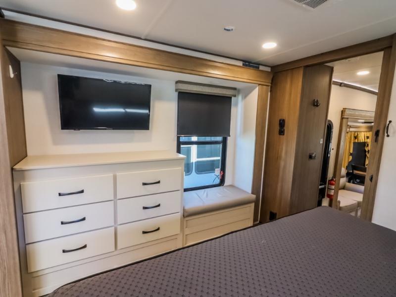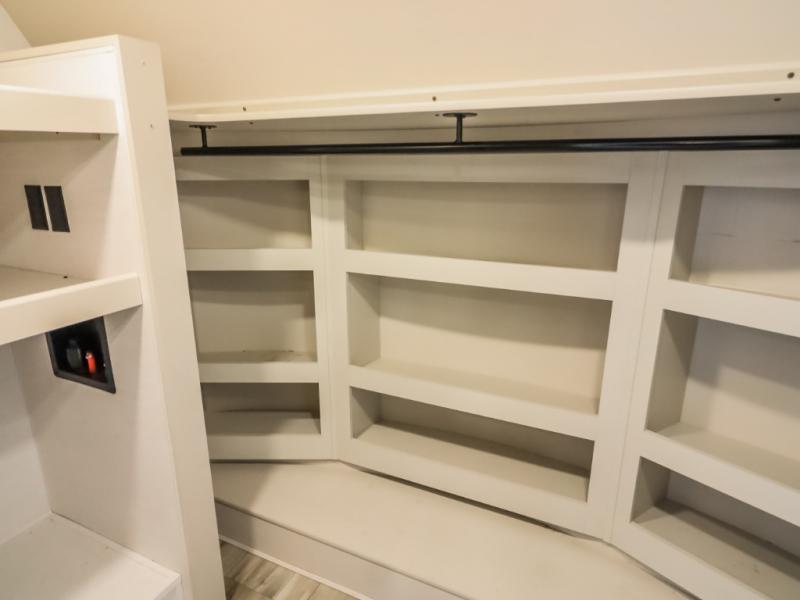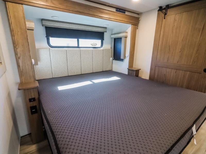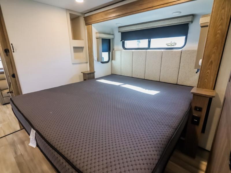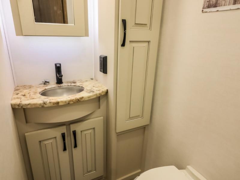 You won't want to camp any other way once you step inside this fifth wheel! the chef will enjoy all of the space in the rear kitchen with ample counter space, a 19 cu. ft. 12 volt residential refrigerator, and a pantry for snacks. Everyone will love to meet in the middle living area that includes dual sleeper sofas and a dual recliner loveseat across from the 50" Smart TV and fireplace. The half bathroom is nearby for quick bathroom breaks too. You will feel right at home in the master suite with a king bed slide to lay your head on at night, a flip top dresser with a Smart TV above it to watch your movies in true comfort, and a seat with storage, plus access to the front full bathroom. Inside the bathroom, you will find a 61" x 30" shower to freshen up in and a walk-in closet with a hamper, shelves, and washer and dryer prep for clean clothes throughout your entire trip!