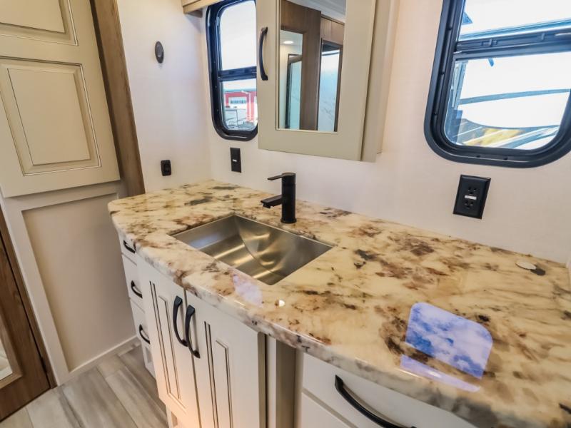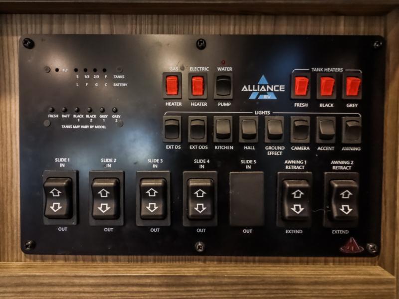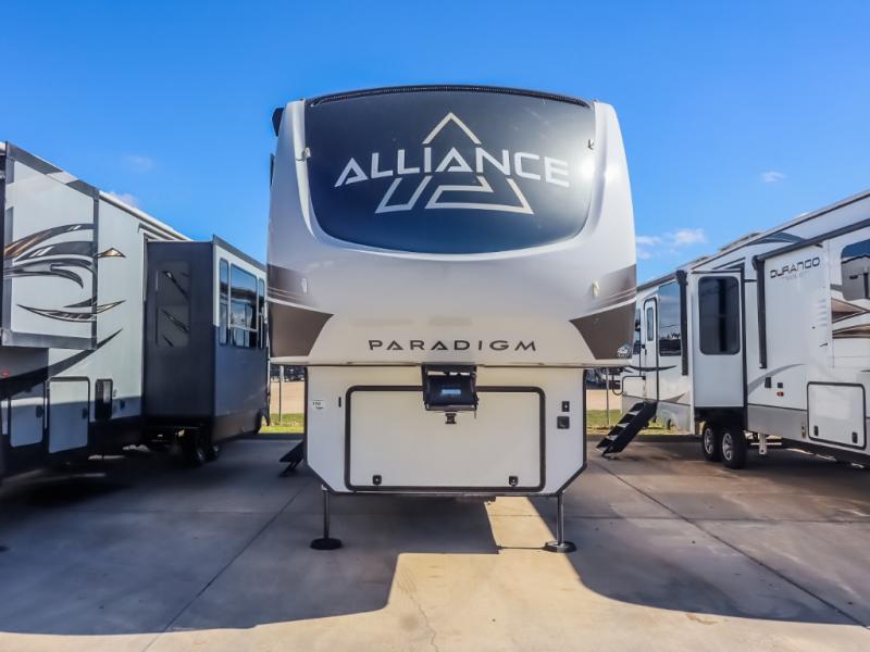 The Paradigm fifth wheels by Alliance RV are functional, high-quality, and luxurious for an unforgettable camping experience. There are three A/C units and a 40K BTU furnace to keep you comfortable year around, and you'll appreciate additional convenient amenities, like the all-in-one enclosed/heated utility center and the color coded and numbered wiring. A Rota-Flex pin box comes standard for hassle-free towing, along with Super-G 4,400 lb. rated tires and Dexter 7,000 lb. axles. You'll love the kitchen with its LG solid surface countertops and Insignia range, plus there is LED motion lighting in the pantry and a Maxx fan with a rain sensor to keep everything fresh when making dinner. Each model also includes an HD Smart TV in the living room and bedroom, plus a Winegard Air 360 antenna to keep you connected to the outside world. And of course there are a variety of options you can choose from to further customize your fifth wheel; dual pane windows, Super Solar Plus, slide out awning toppers, and generator prep or a generator to name a few!