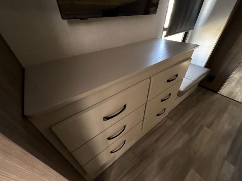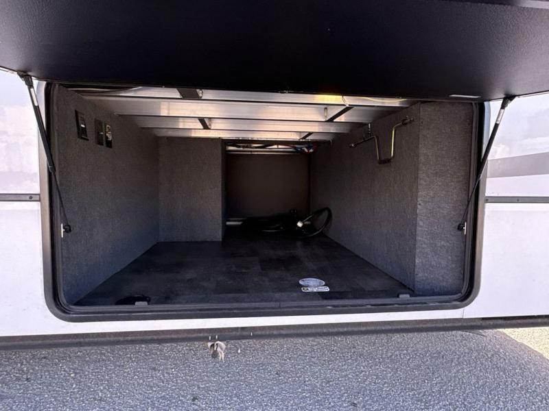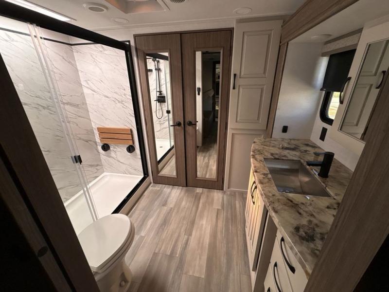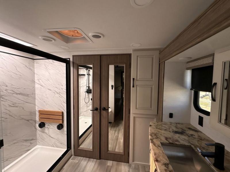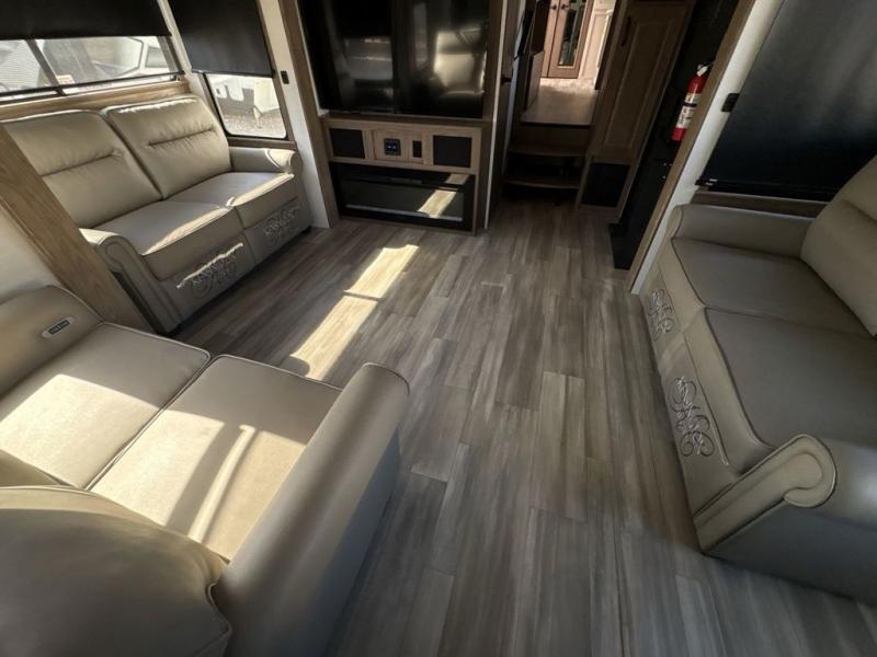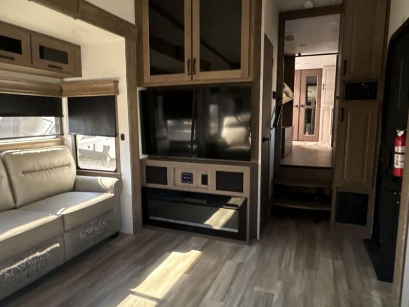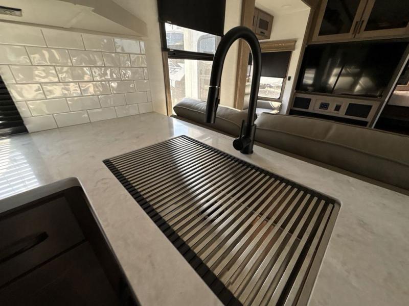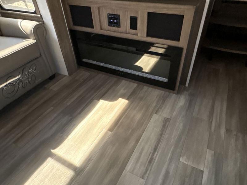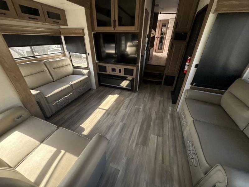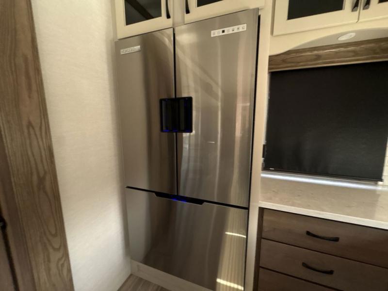 You won't want to camp any other way once you step inside this fifth wheel! the chef will enjoy all of the space in the rear kitchen with ample counter space, a 19 cu. ft. 12 volt residential refrigerator, and a pantry for snacks. Everyone will love to meet in the middle living area that includes dual sleeper sofas and a dual recliner loveseat across from the 50" Smart TV and fireplace. The half bathroom is nearby for quick bathroom breaks too. You will feel right at home in the master suite with a king bed slide to lay your head on at night, a flip top dresser with a Smart TV above it to watch your movies in true comfort, and a seat with storage, plus access to the front full bathroom. Inside the bathroom, you will find a 61" x 30" shower to freshen up in and a walk-in closet with a hamper, shelves, and washer and dryer prep for clean clothes throughout your entire trip!