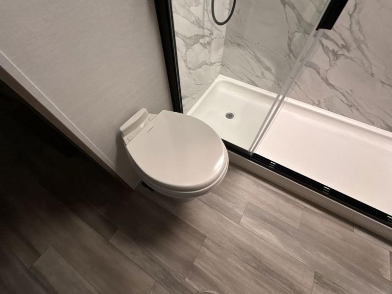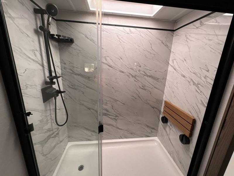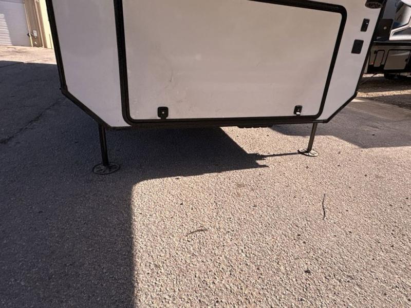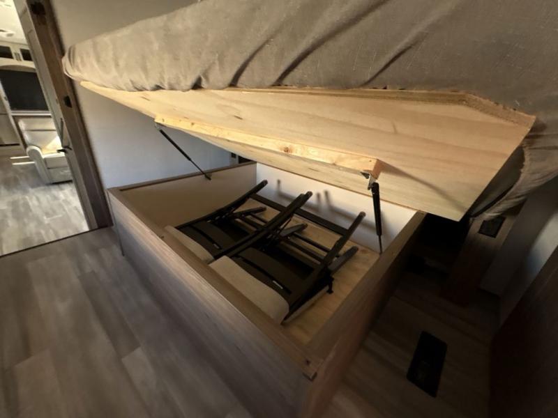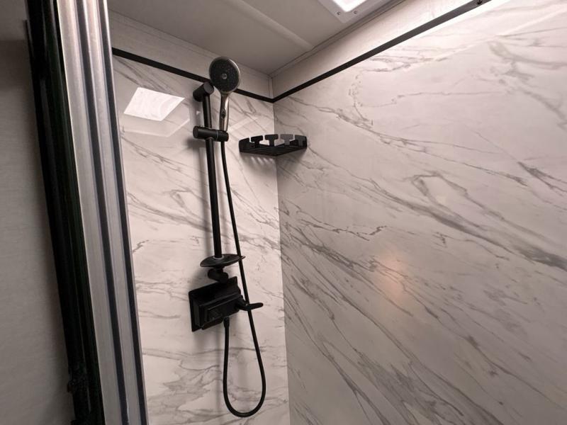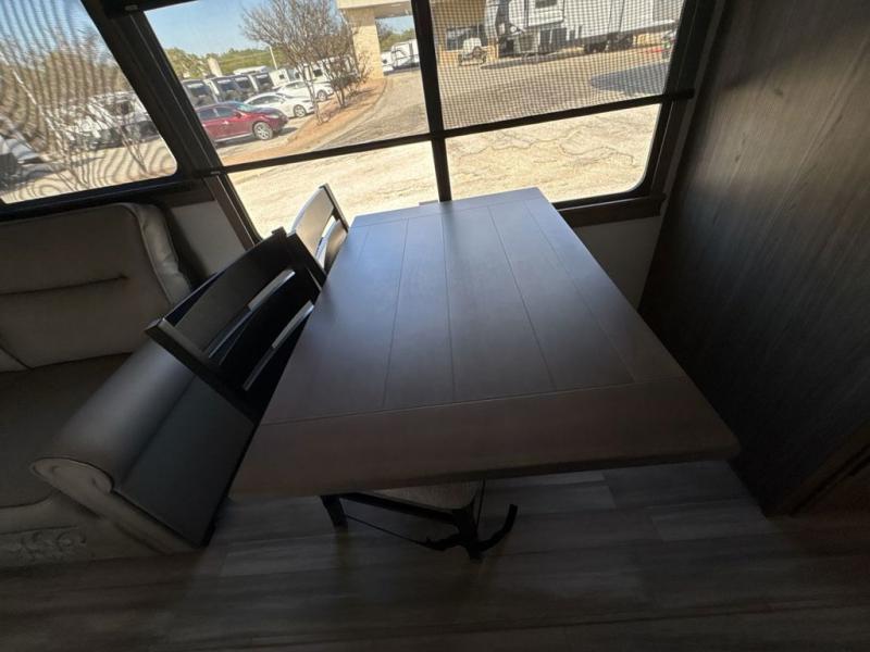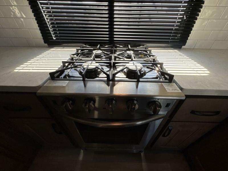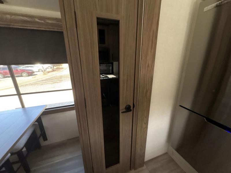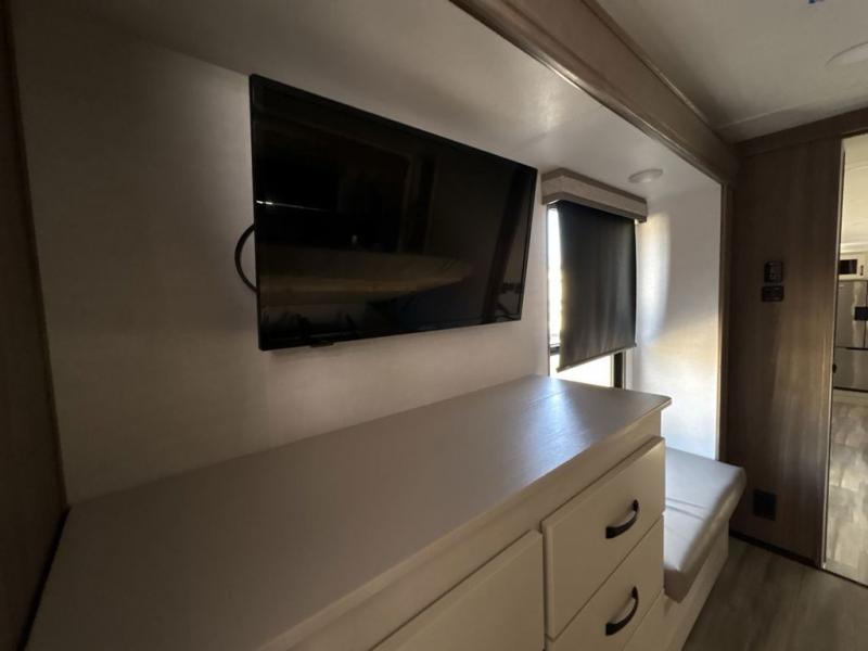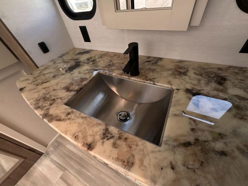 You won't want to camp any other way once you step inside this fifth wheel! the chef will enjoy all of the space in the rear kitchen with ample counter space, a 19 cu. ft. 12 volt residential refrigerator, and a pantry for snacks. Everyone will love to meet in the middle living area that includes dual sleeper sofas and a dual recliner loveseat across from the 50" Smart TV and fireplace. The half bathroom is nearby for quick bathroom breaks too. You will feel right at home in the master suite with a king bed slide to lay your head on at night, a flip top dresser with a Smart TV above it to watch your movies in true comfort, and a seat with storage, plus access to the front full bathroom. Inside the bathroom, you will find a 61" x 30" shower to freshen up in and a walk-in closet with a hamper, shelves, and washer and dryer prep for clean clothes throughout your entire trip!
