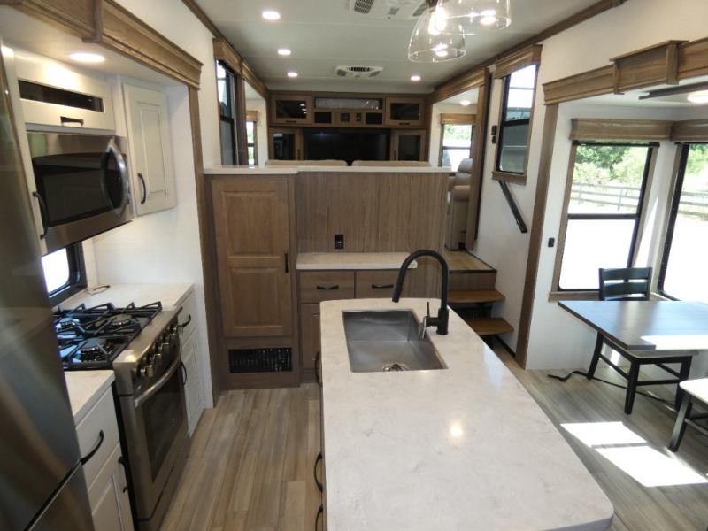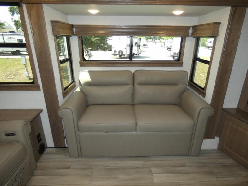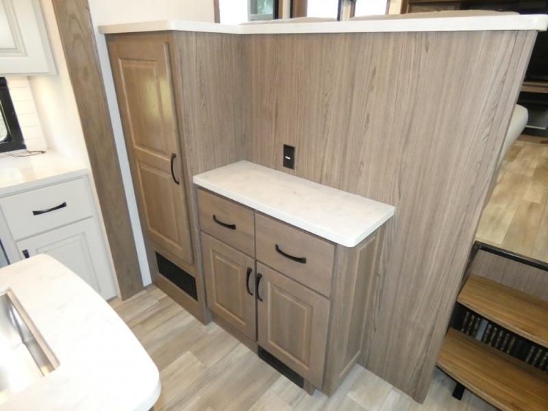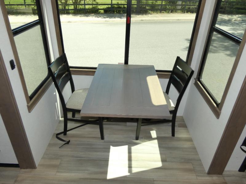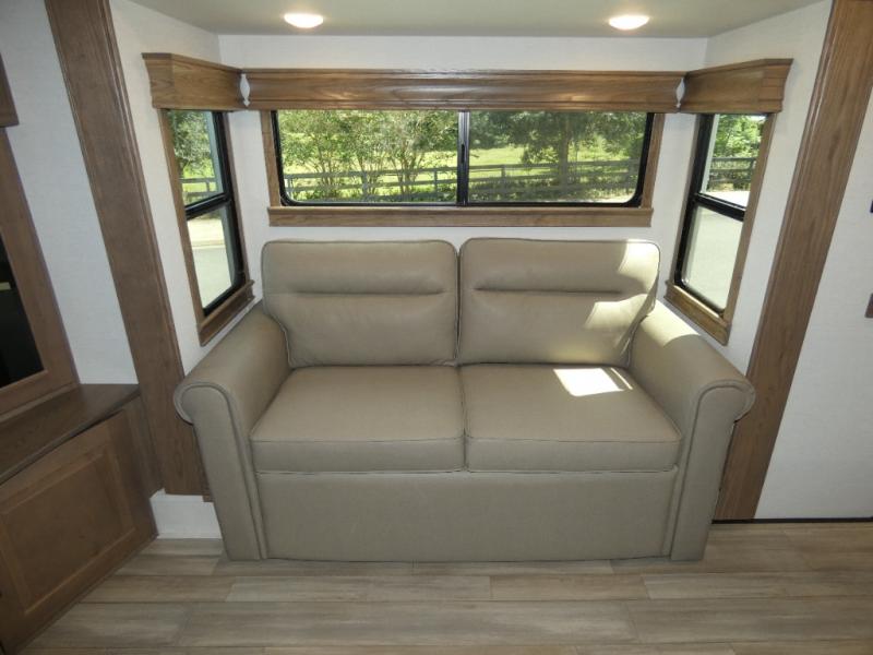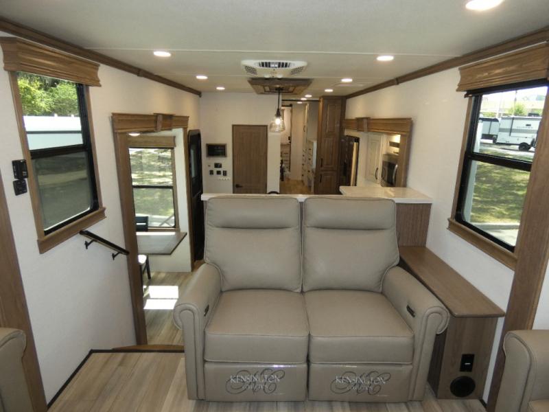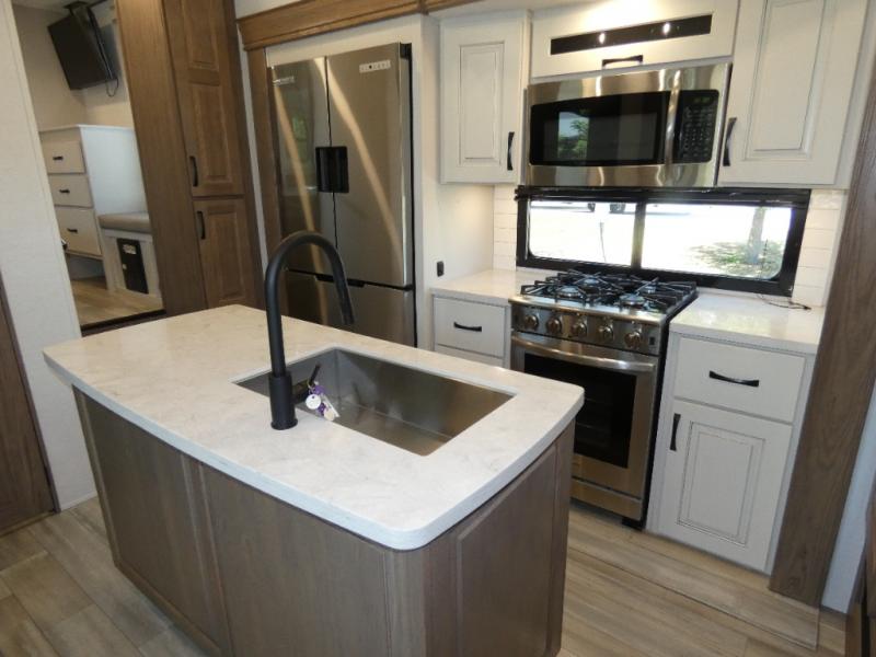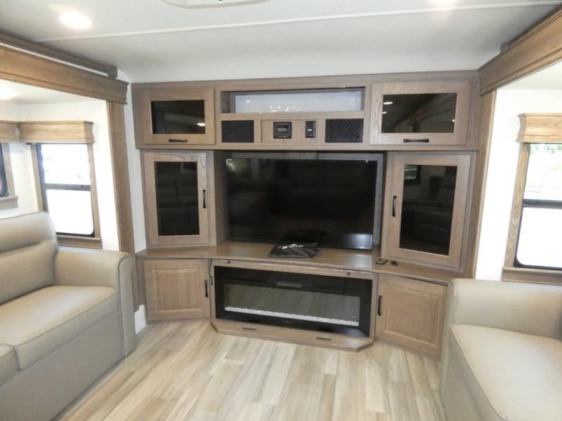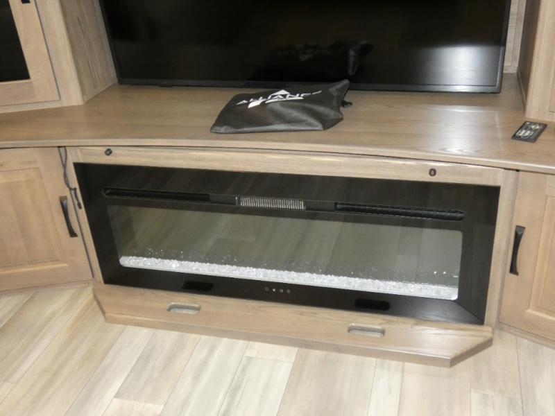 An active family will want this fifth wheel with its 48" x 115" exterior basement pull-out tray for kayaks or extra storage. Just above this area is the master suite with a rear bathroom that offers a residential shower, a porcelain toilet with soft close seat, plus a wardrobe and shelf storage. The king bed slide gives you more floor space, and you will have a seat, a flip-top dresser, and a Smart TV to watch movies in bed. The half bath is next to the main entry which is super convenient, and the middle kitchen is separate from the front living area. The cook will love the residential microwave, range and oven, plus the 19 cu. ft. 12 volt residential refrigerator. There is also a pantry and extra counter space on the kitchen island with a large sink. The views out of the atrium windows in the slide out, which includes the floating dinette table, are a must see. And when you need to watch the big game, the 55" Smart TV with a pull-out fireplace storage are up front with the dual recliner love seat and two sleeper sofas.