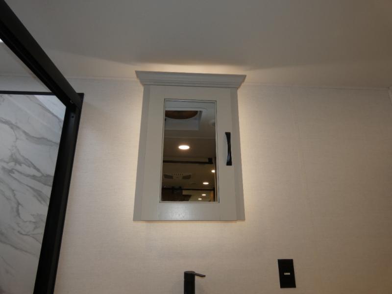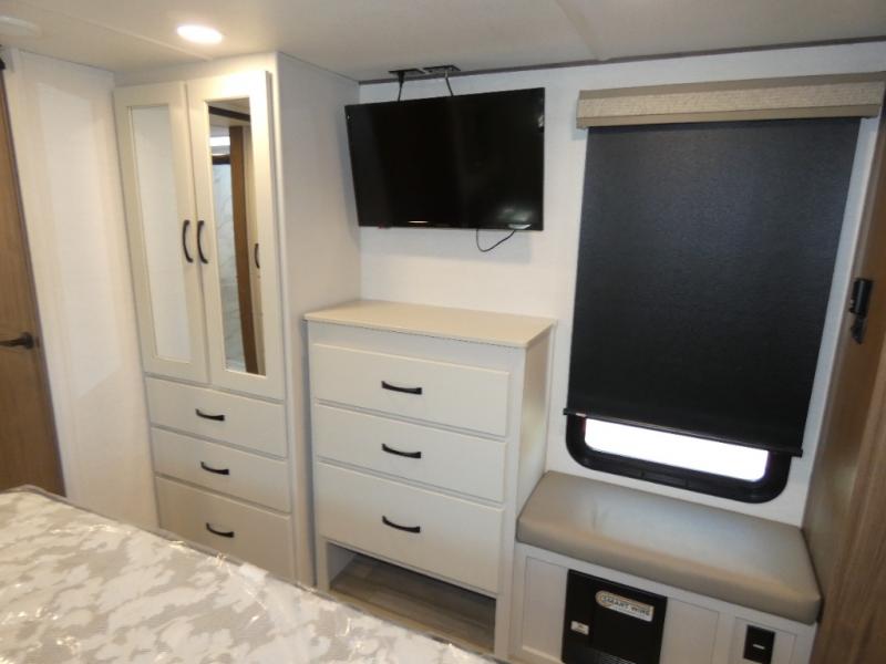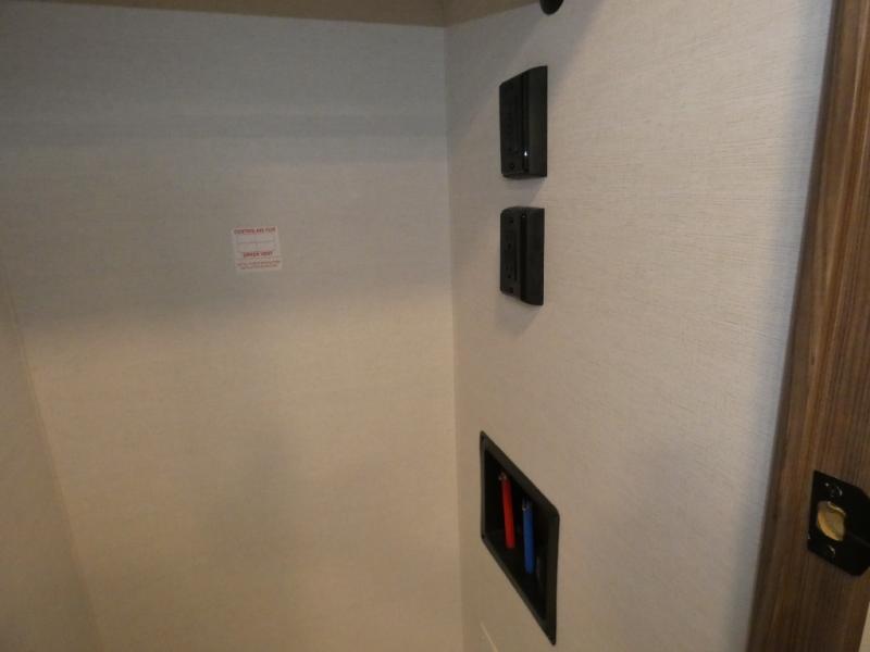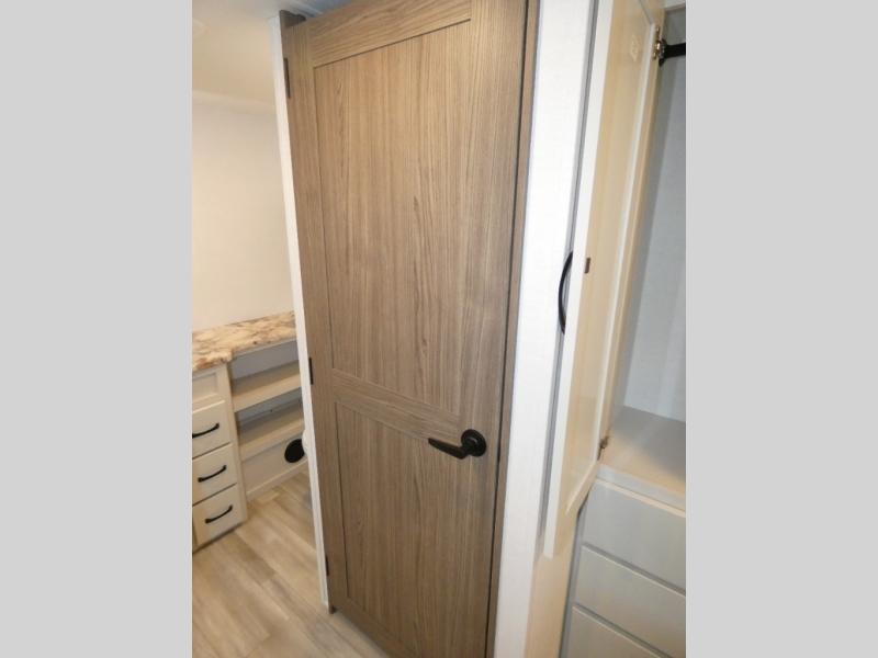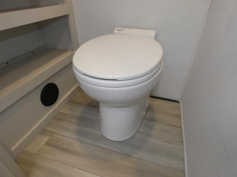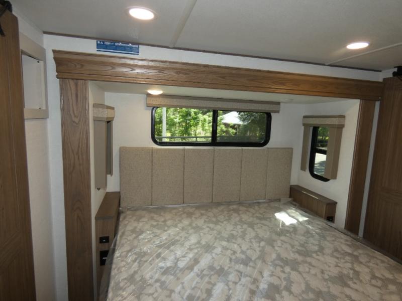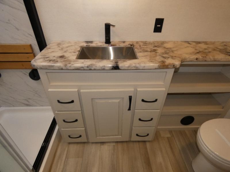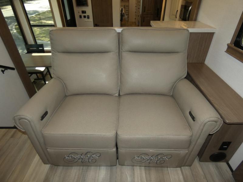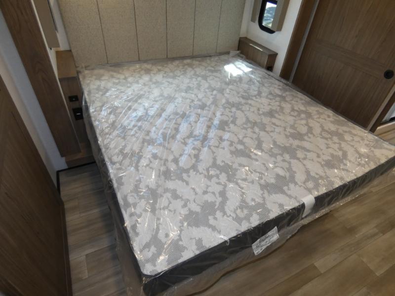 An active family will want this fifth wheel with its 48" x 115" exterior basement pull-out tray for kayaks or extra storage. Just above this area is the master suite with a rear bathroom that offers a residential shower, a porcelain toilet with soft close seat, plus a wardrobe and shelf storage. The king bed slide gives you more floor space, and you will have a seat, a flip-top dresser, and a Smart TV to watch movies in bed. The half bath is next to the main entry which is super convenient, and the middle kitchen is separate from the front living area. The cook will love the residential microwave, range and oven, plus the 19 cu. ft. 12 volt residential refrigerator. There is also a pantry and extra counter space on the kitchen island with a large sink. The views out of the atrium windows in the slide out, which includes the floating dinette table, are a must see. And when you need to watch the big game, the 55" Smart TV with a pull-out fireplace storage are up front with the dual recliner love seat and two sleeper sofas.