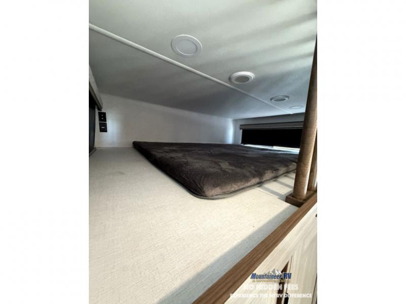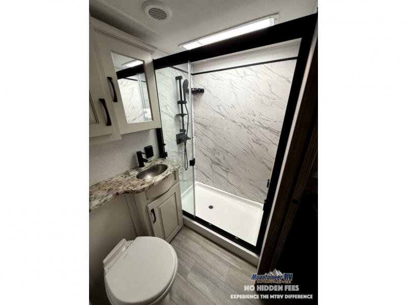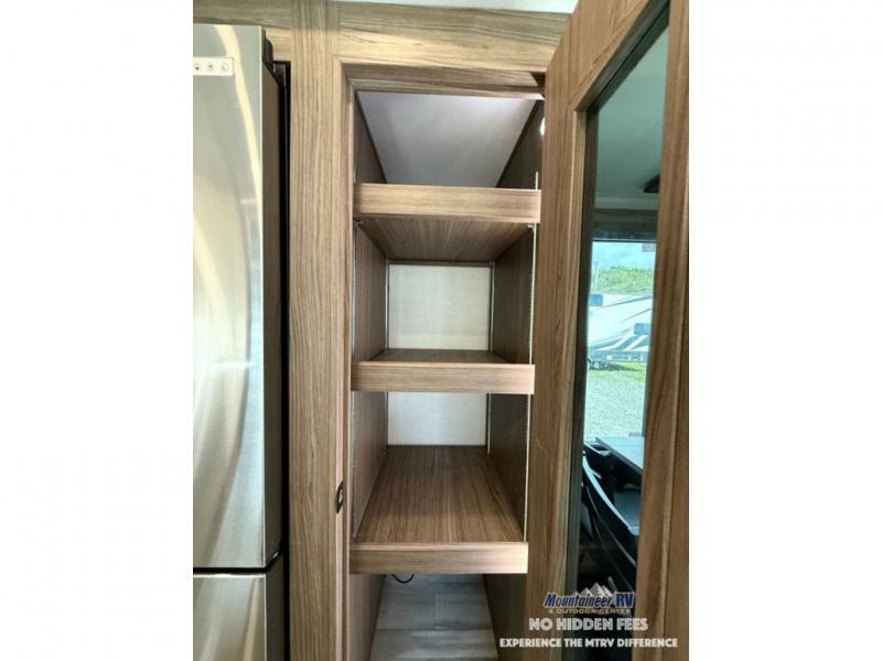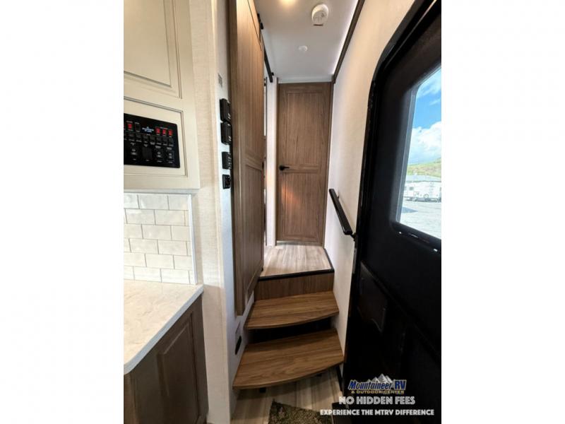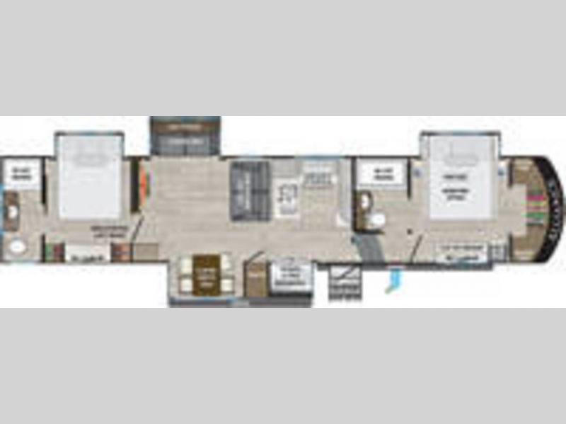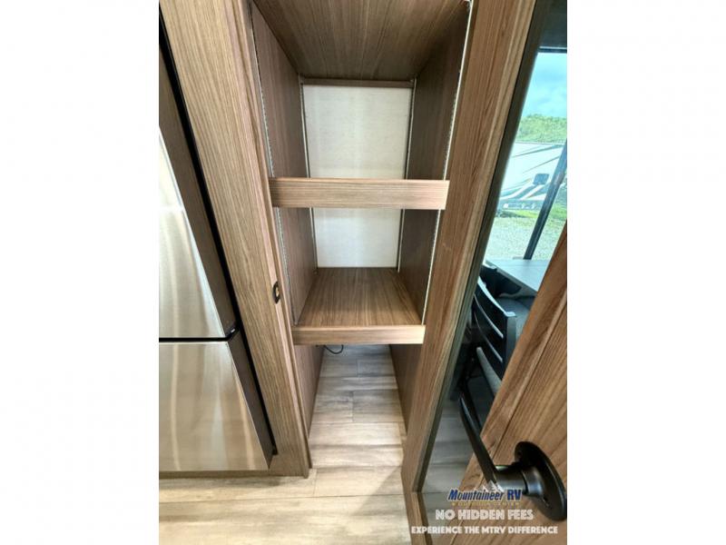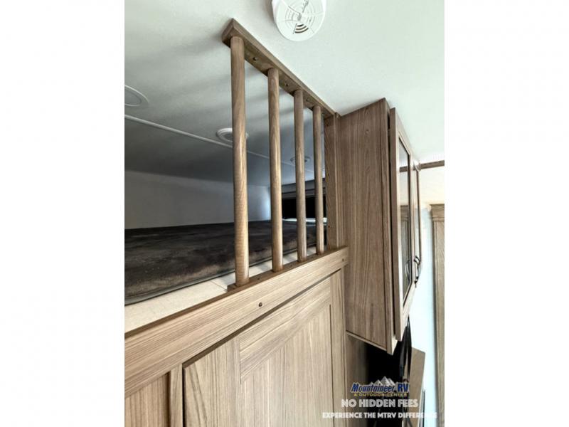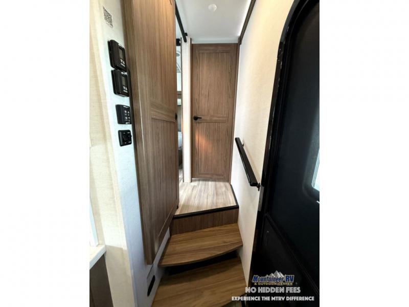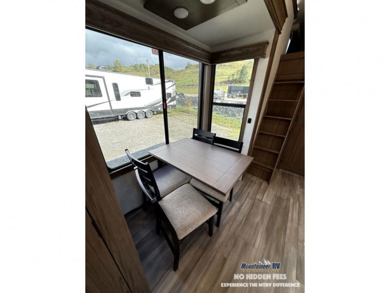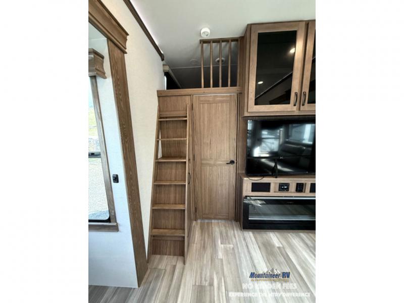 A spacious unit with sleeping for eight with plenty of choices to suit everyone! There is a front private bedroom with a king size bed that offers a large full front closet that has also been prepped for a washer and dryer if you choose that option. The front bath features a 40" x 30" shower and dual entry. Head down to the kitchen and living space at the bottom of the stairs to find a curbside slide that houses the 19 cu. ft. residential refrigerator, a pantry, and a dinette with four chairs. As you continue on toward the rear of this coach, you will find a spacious living area along the roadside with a 50" Smart TV and a fireplace, a sofa sleeper slide, and a dual reclining loveseat. This makes a great gathering place for television watching, game playing, and even added sleeping space if needed at night. The rear private bedroom with its own private bath features a queen bed, two closets, and a Smart TV as well. The multipurpose loft area above can be accessed just before this rear bedroom entry by a ladder, and it is perfect for extra storage, or it can be used for added sleeping that the kiddos are sure to love.