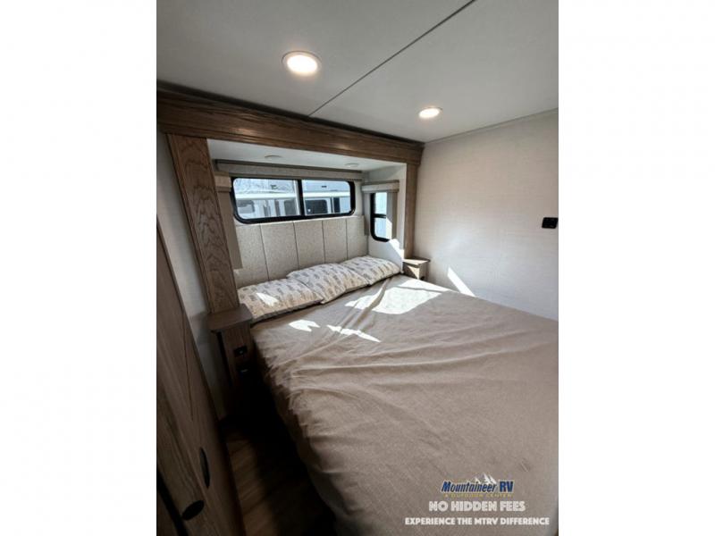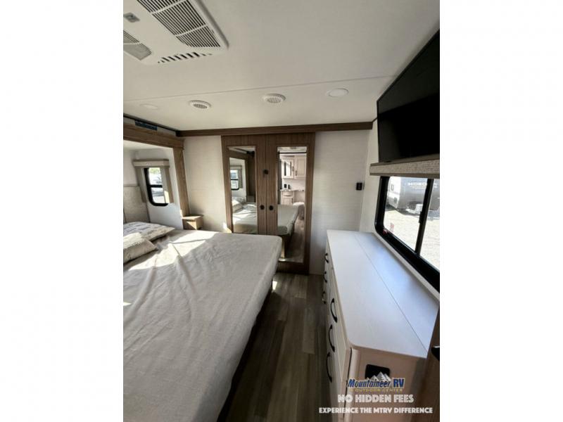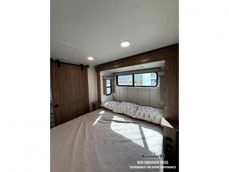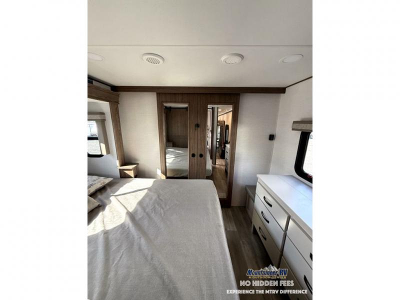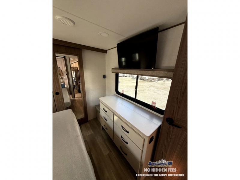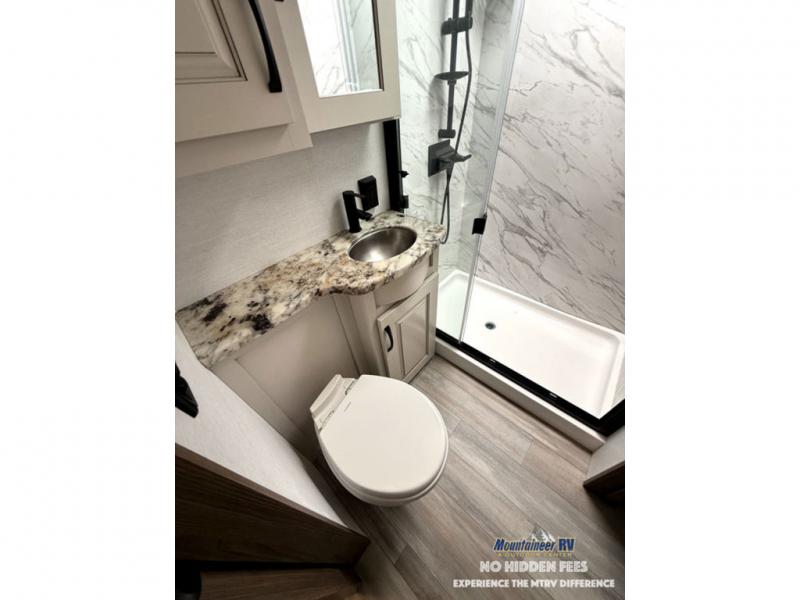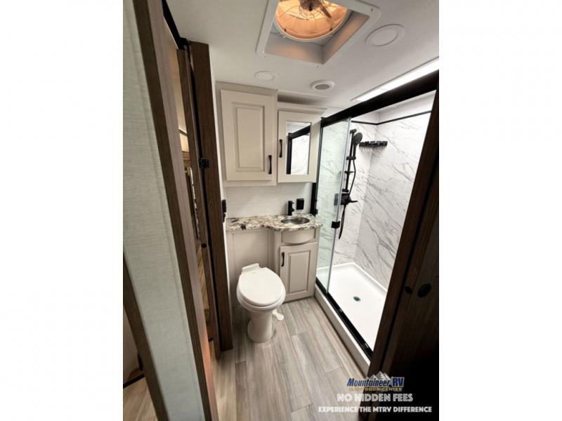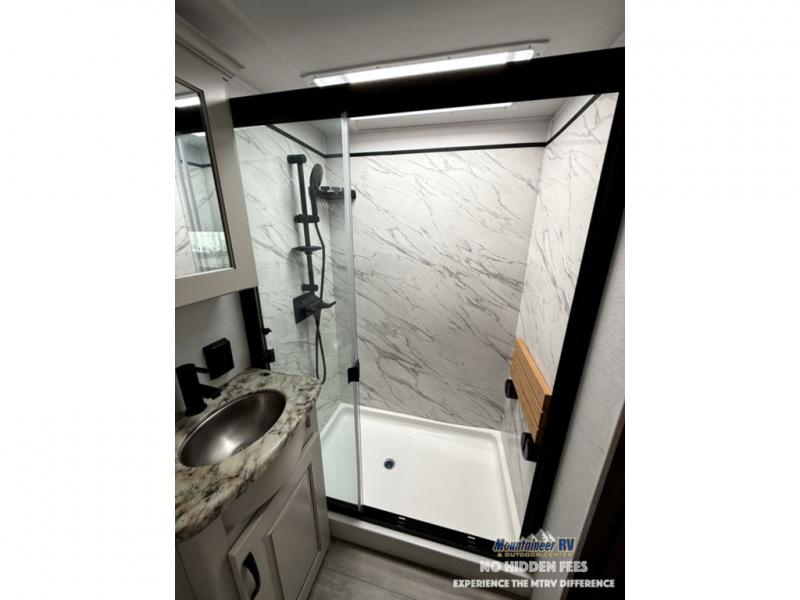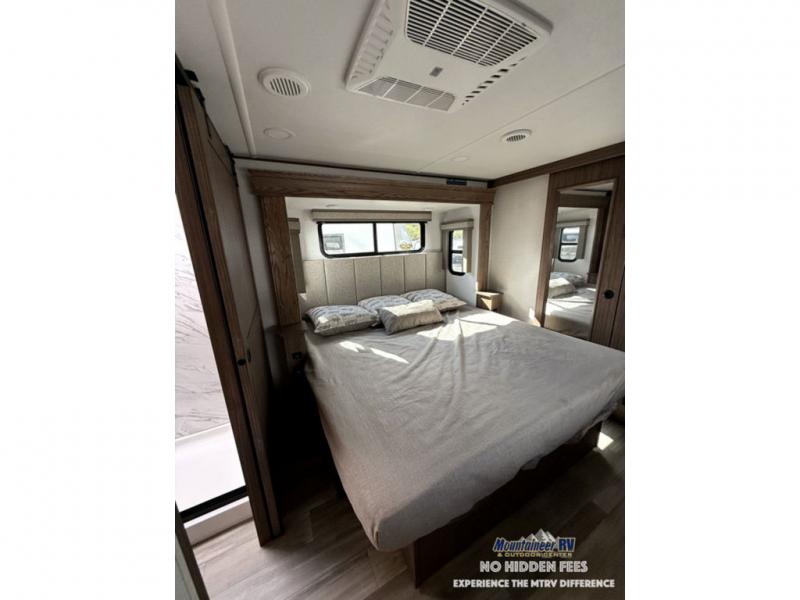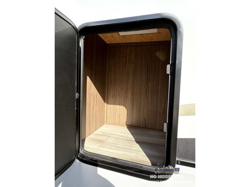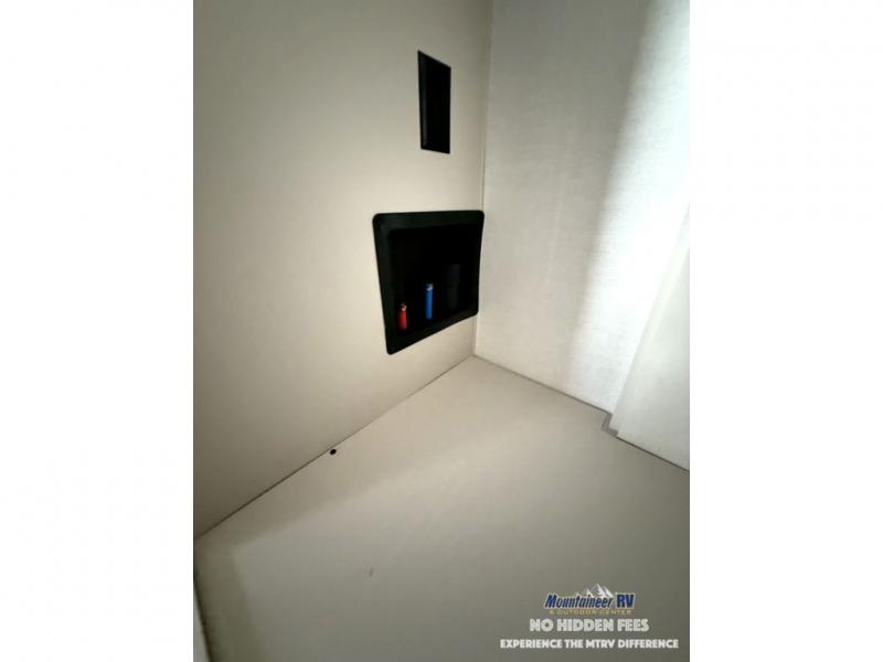 A spacious unit with sleeping for eight with plenty of choices to suit everyone! There is a front private bedroom with a king size bed that offers a large full front closet that has also been prepped for a washer and dryer if you choose that option. The front bath features a 40" x 30" shower and dual entry. Head down to the kitchen and living space at the bottom of the stairs to find a curbside slide that houses the 19 cu. ft. residential refrigerator, a pantry, and a dinette with four chairs. As you continue on toward the rear of this coach, you will find a spacious living area along the roadside with a 50" Smart TV and a fireplace, a sofa sleeper slide, and a dual reclining loveseat. This makes a great gathering place for television watching, game playing, and even added sleeping space if needed at night. The rear private bedroom with its own private bath features a queen bed, two closets, and a Smart TV as well. The multipurpose loft area above can be accessed just before this rear bedroom entry by a ladder, and it is perfect for extra storage, or it can be used for added sleeping that the kiddos are sure to love.