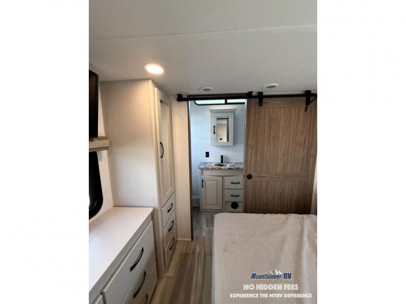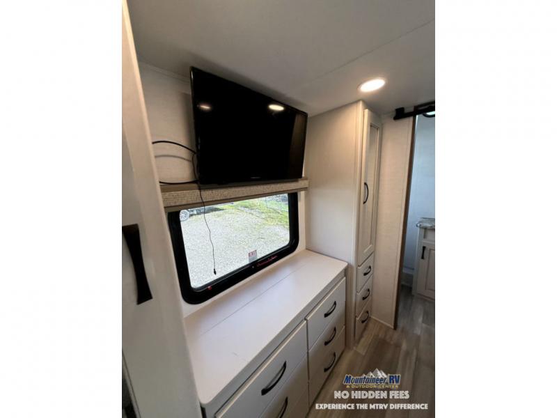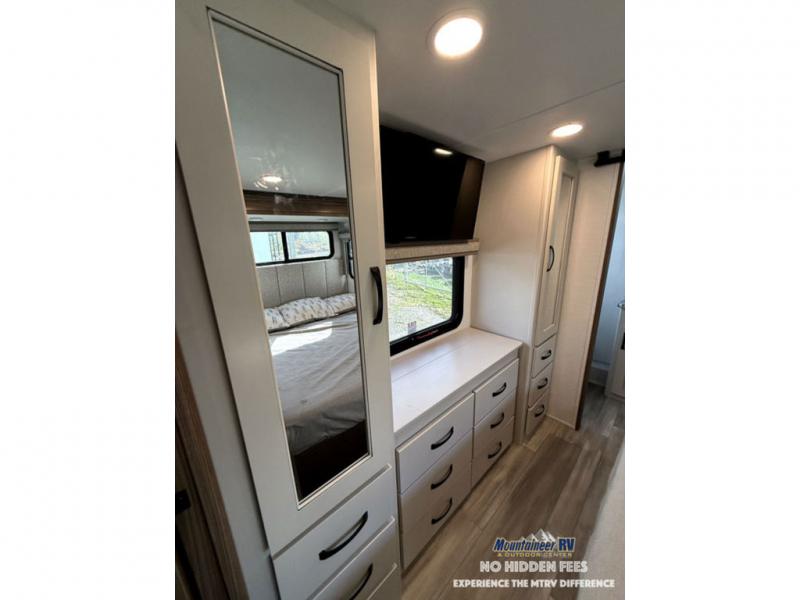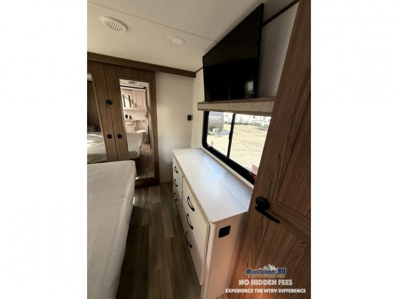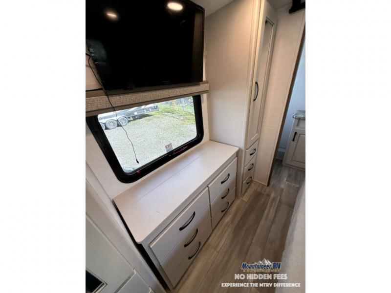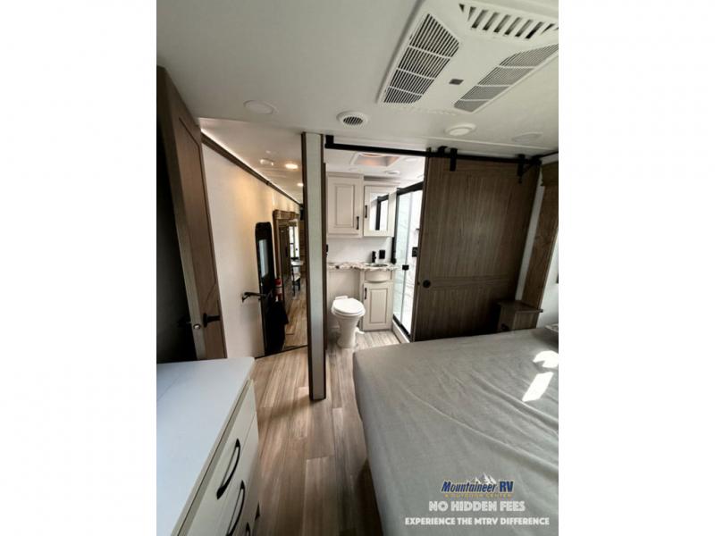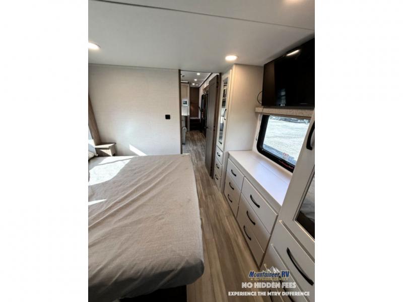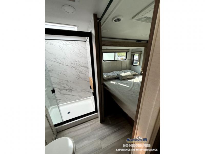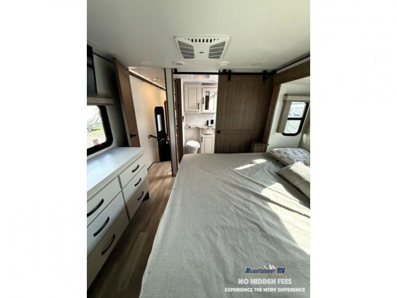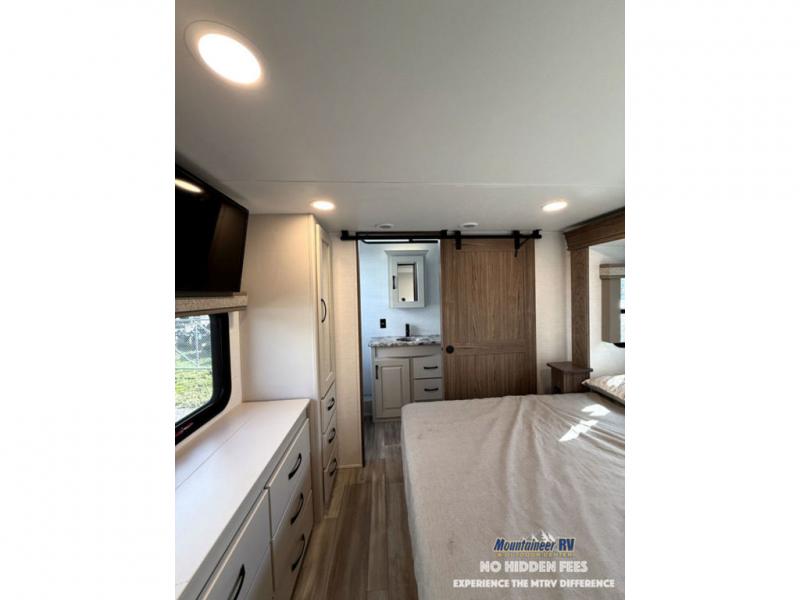 A spacious unit with sleeping for eight with plenty of choices to suit everyone! There is a front private bedroom with a king size bed that offers a large full front closet that has also been prepped for a washer and dryer if you choose that option. The front bath features a 40" x 30" shower and dual entry. Head down to the kitchen and living space at the bottom of the stairs to find a curbside slide that houses the 19 cu. ft. residential refrigerator, a pantry, and a dinette with four chairs. As you continue on toward the rear of this coach, you will find a spacious living area along the roadside with a 50" Smart TV and a fireplace, a sofa sleeper slide, and a dual reclining loveseat. This makes a great gathering place for television watching, game playing, and even added sleeping space if needed at night. The rear private bedroom with its own private bath features a queen bed, two closets, and a Smart TV as well. The multipurpose loft area above can be accessed just before this rear bedroom entry by a ladder, and it is perfect for extra storage, or it can be used for added sleeping that the kiddos are sure to love.