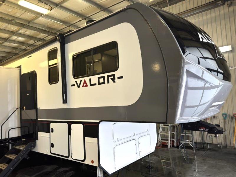 You can bring your toys with you wherever you go with any one of these Alliance RV Valor toy hauler fifth wheels! They are adventure-ready with a quality build from the walk on roof with seamless PVC roof covering to the commercial grade vinyl flooring and MorRyde CRE3000 suspension system. The Performance Running Gear package comes with a 101" wide-body benchmark chassis platform, 7,000 lb. Dexter axles, and a space enhancing drop frame storage compartment to pack in all your riding gear. You can even go off-gridding thanks to the Off the Grid Pack that has two 320 watt solar panels, generator prep, a 40 amp charge controller, and a 100 amp hour lithium iron phosphate battery, plus a battery monitor system. Some of the interior comforts you will enjoy are the hardwood cabinet doors and drawers, solid surface kitchen countertops, and commercial grade vinyl flooring with no carpet to make clean up a breeze. The Valor toy haulers are also the Master of 12 Volt with USB charging station throughout, power recliners, a 17 cu. ft. refrigerator, and more 12 volt features to make camping hassle-free!