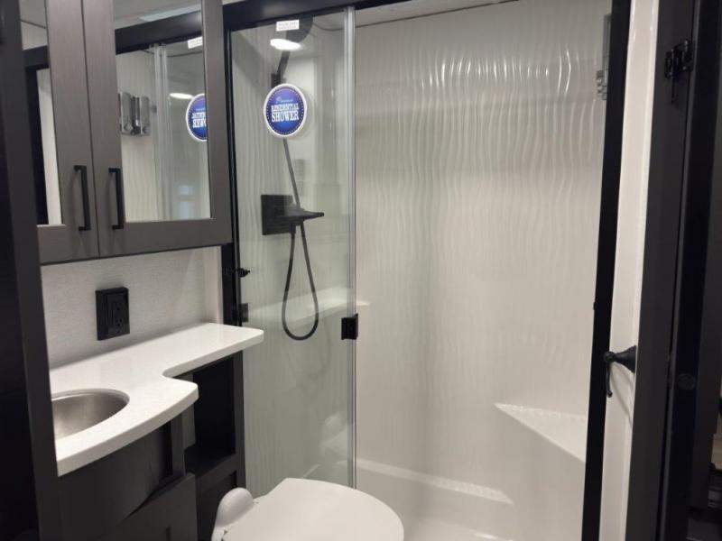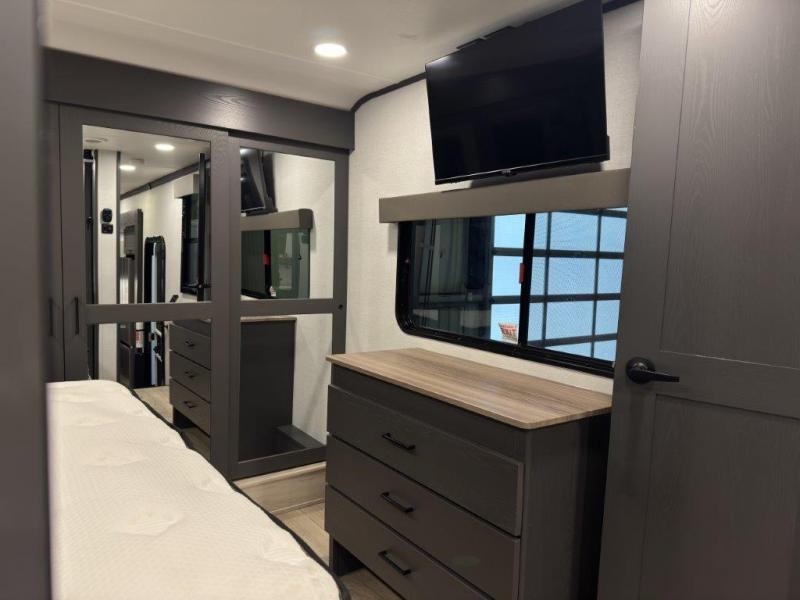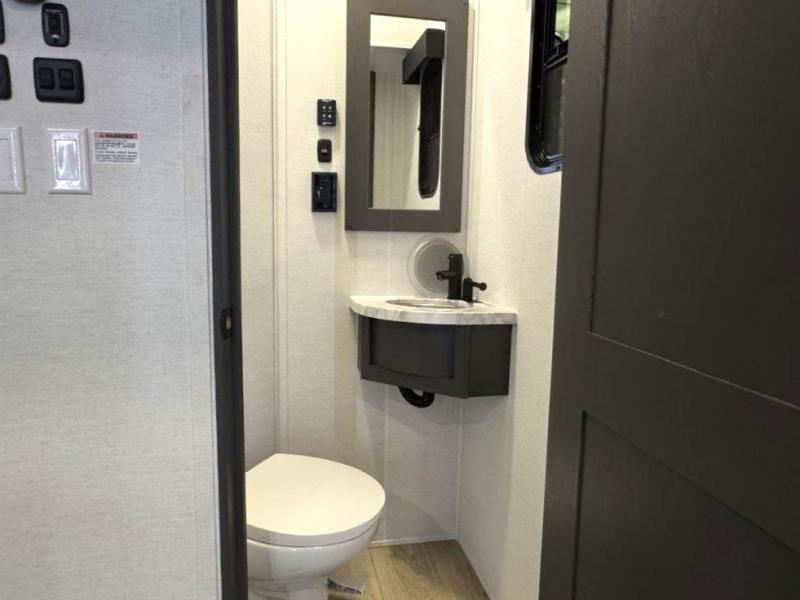 The whole gang will love camping in this toy hauler with 14' of toy parking space for your toys and gear. Once you have arrived at your destination, you can set up the HappiJac roll-over sofas with a queen bed above them, and also a loft which opens to the garage area as well. A half bath is also available off the garage which is an added convenience for those sleeping in this converted area, and for those coming in off the trail so that they do not have to track all through the main unit to use the bathroom. The chef can prepare great meals for their hungry crew with the fully equipped kitchen including a three burner cooktop, a 17 cu. ft. stainless steel 12V refrigerator, large sink, and plenty of countertop prep space. The rest of the gang can be relaxing on the large L-shaped sofa slide watching the 50" HDTV and enjoying the fireplace, or playing a game of cards at the dining table with four chairs. The front private bedroom features a king bed slide for more interior space, a flip top dresser for all of your belongings, and a front wardrobe that is prepped to add an optional washer and dryer, plus it has an entrance into the dual entry bathroom!
