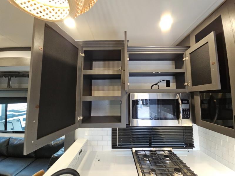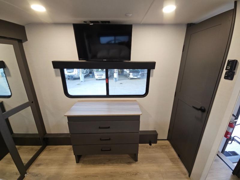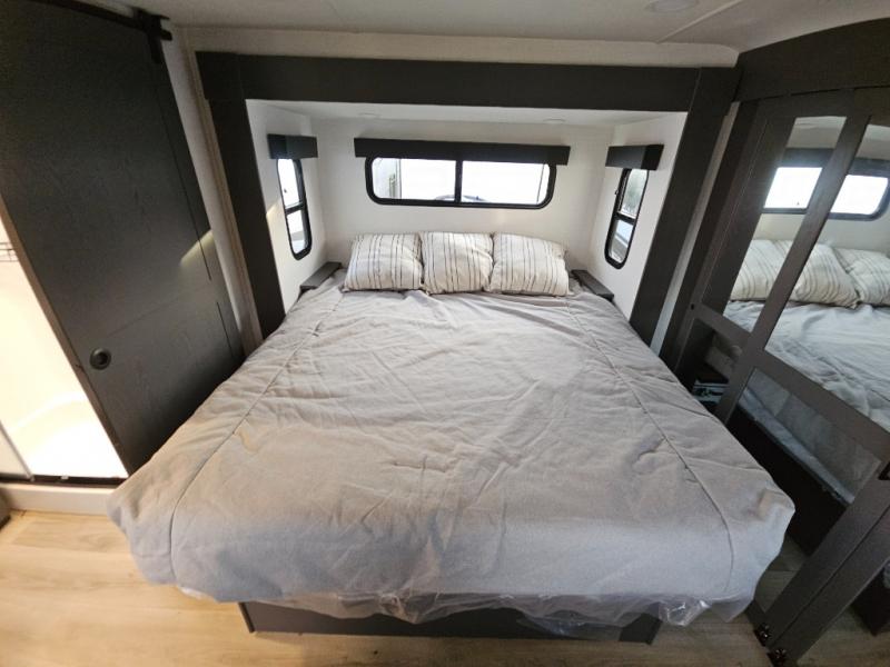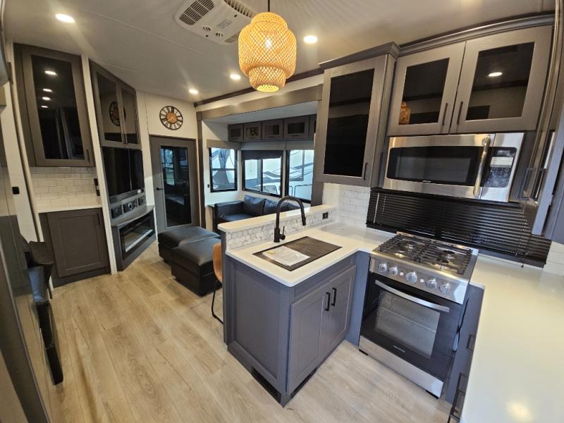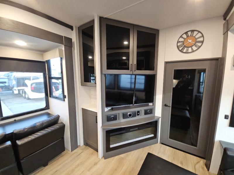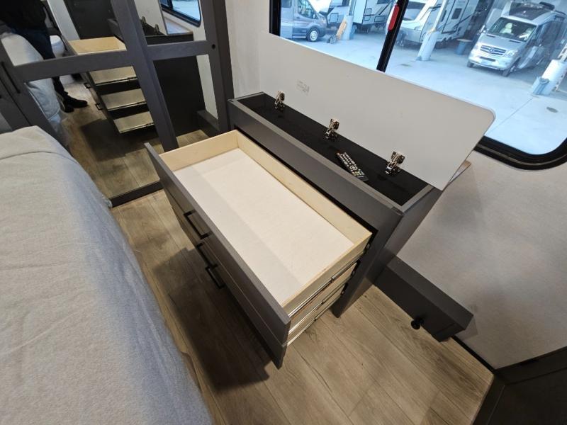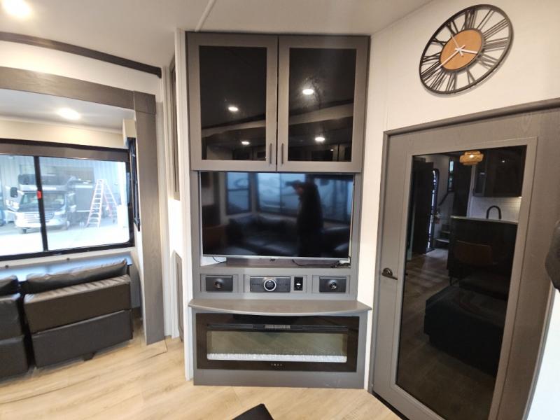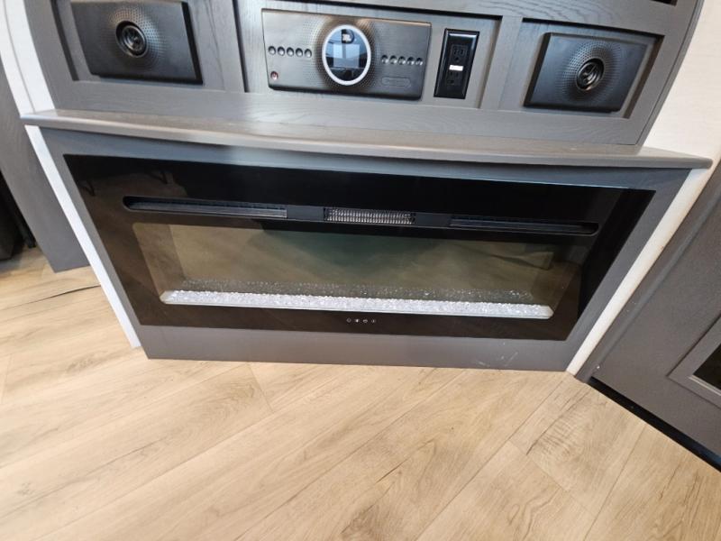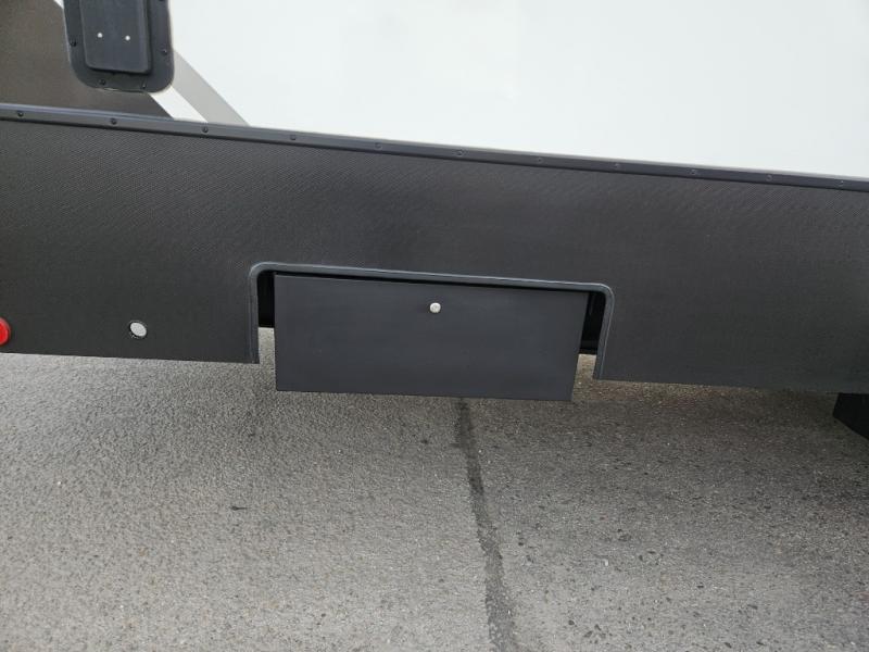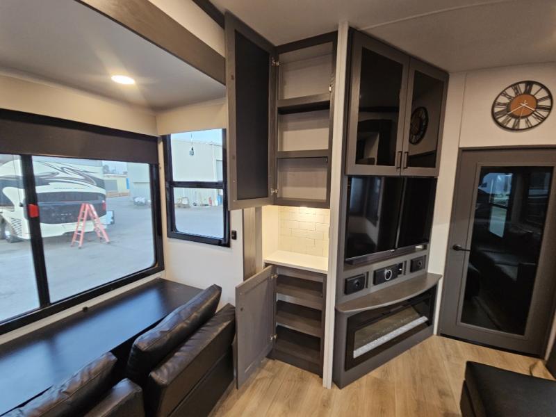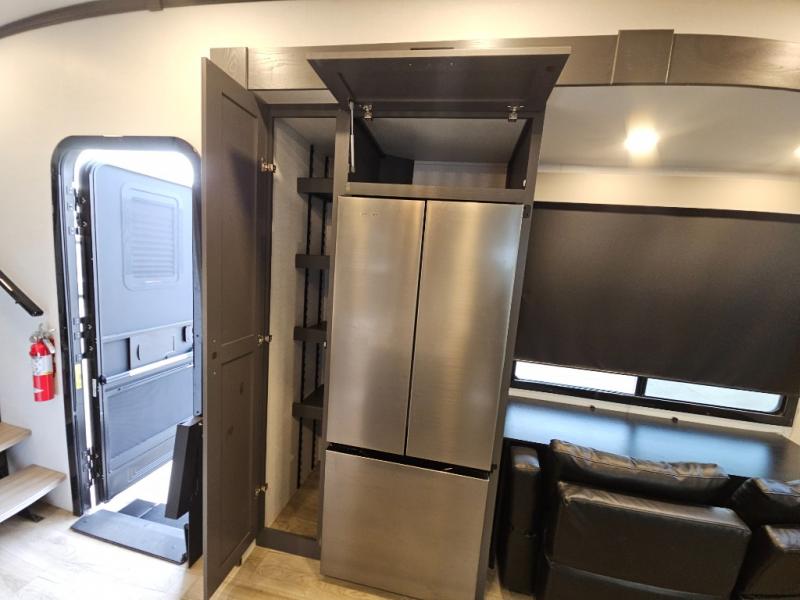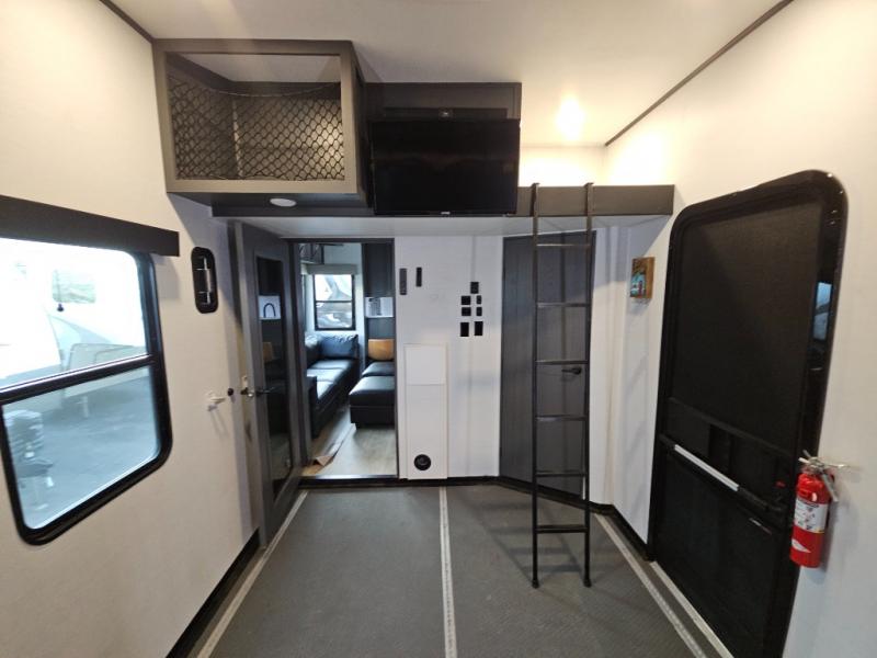 The whole gang will love camping in this toy hauler with 14' of toy parking space for your toys and gear. Once you have arrived at your destination, you can set up the HappiJac roll-over sofas with a queen bed above them, and also a loft which opens to the garage area as well. A half bath is also available off the garage which is an added convenience for those sleeping in this converted area, and for those coming in off the trail so that they do not have to track all through the main unit to use the bathroom. The chef can prepare great meals for their hungry crew with the fully equipped kitchen including a three burner cooktop, a 17 cu. ft. stainless steel 12V refrigerator, large sink, and plenty of countertop prep space. The rest of the gang can be relaxing on the large L-shaped sofa slide watching the 50" HDTV and enjoying the fireplace, or playing a game of cards at the dining table with four chairs. The front private bedroom features a king bed slide for more interior space, a flip top dresser for all of your belongings, and a front wardrobe that is prepped to add an optional washer and dryer, plus it has an entrance into the dual entry bathroom!