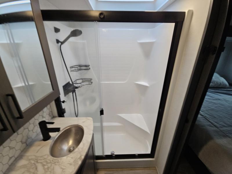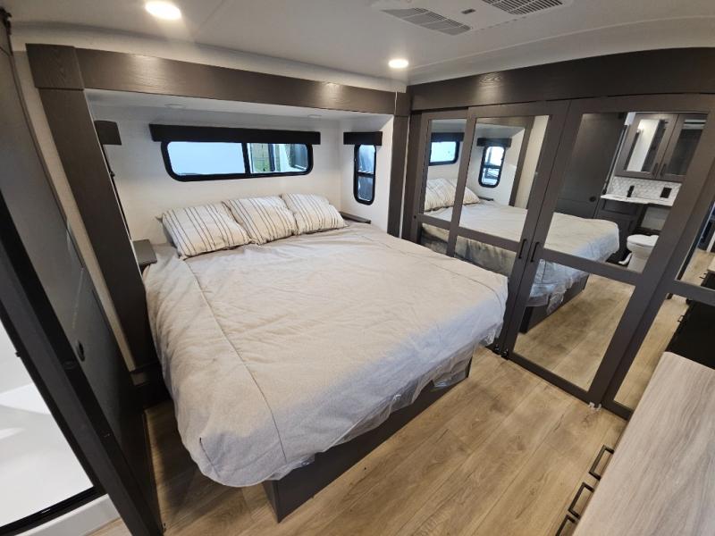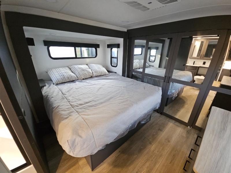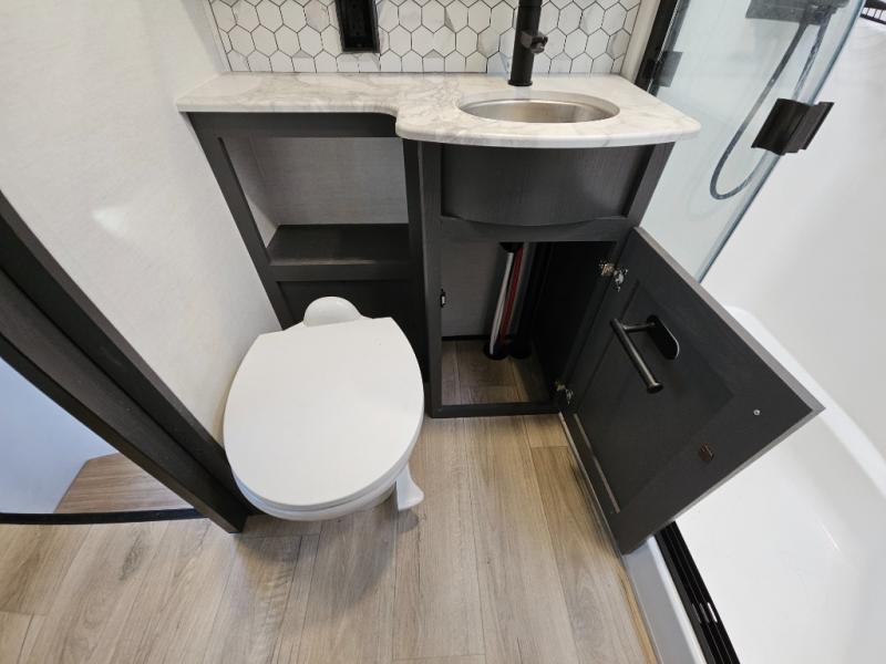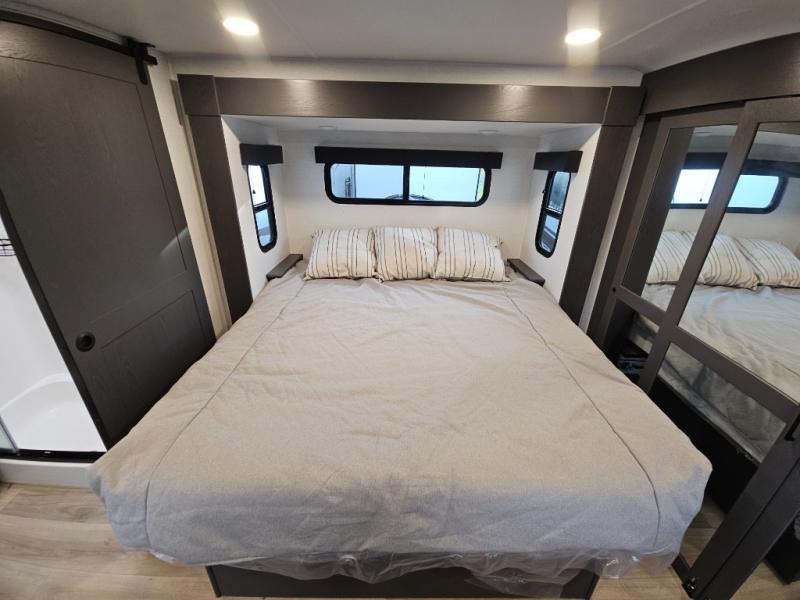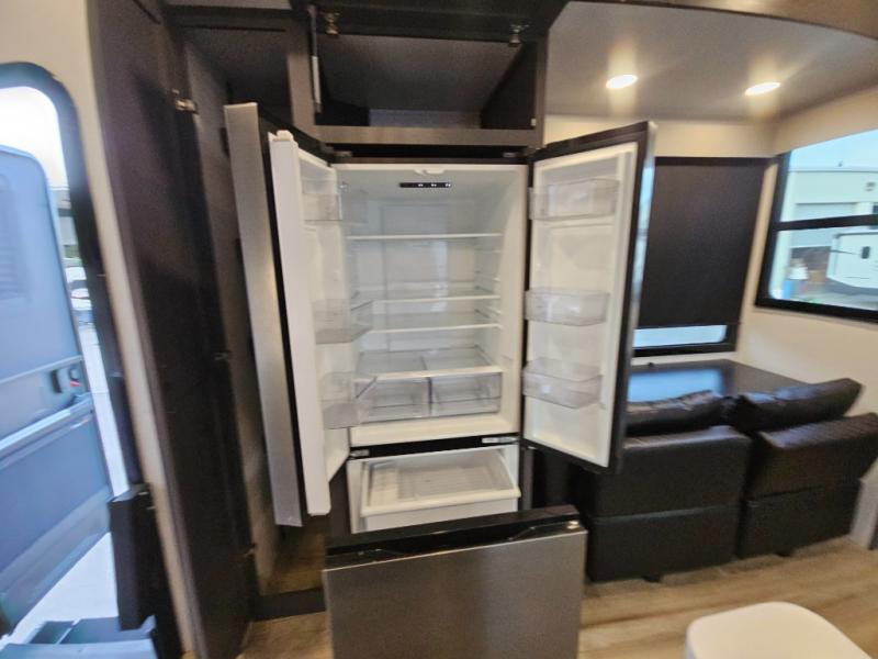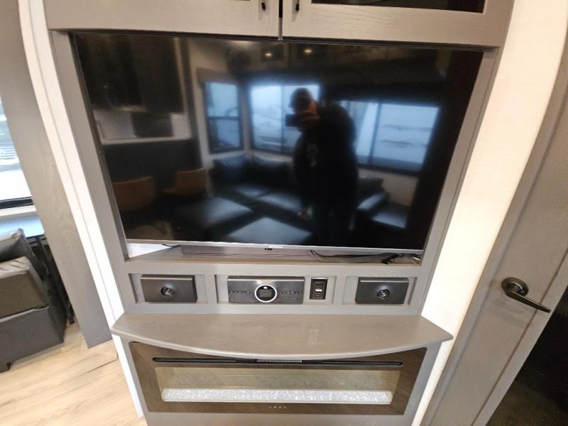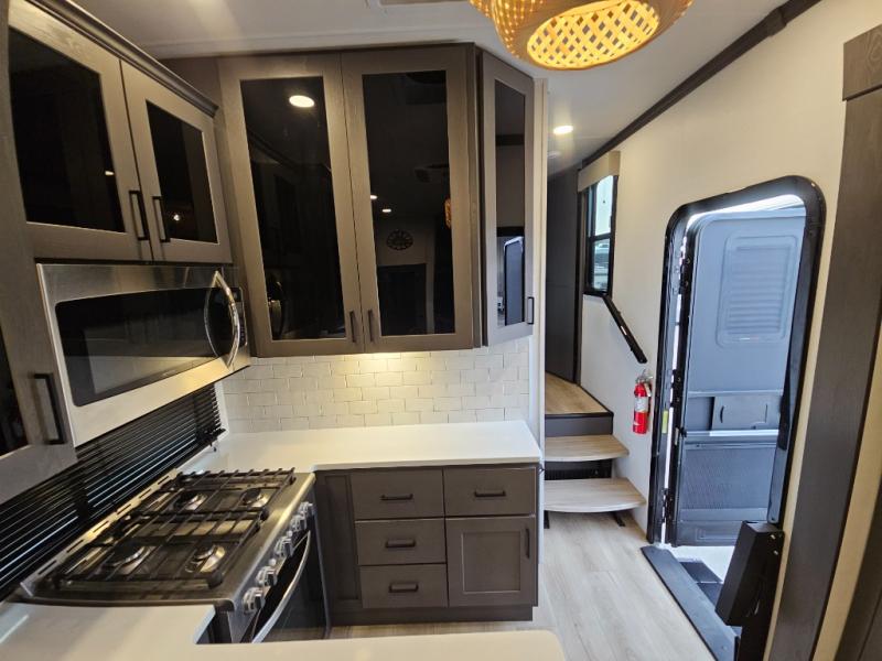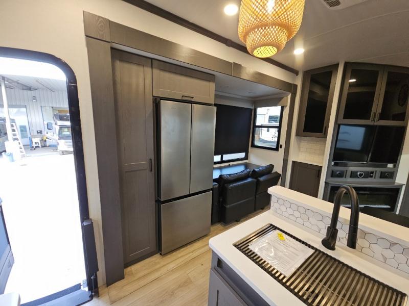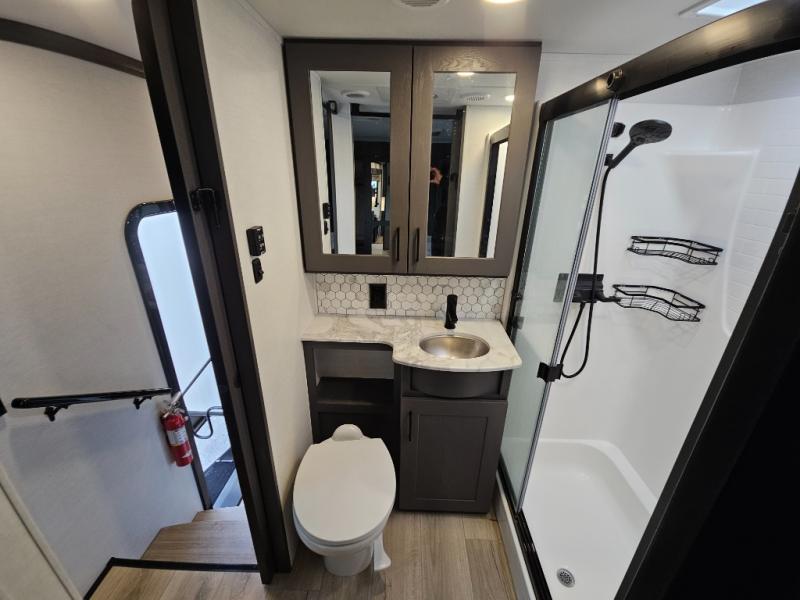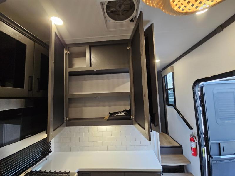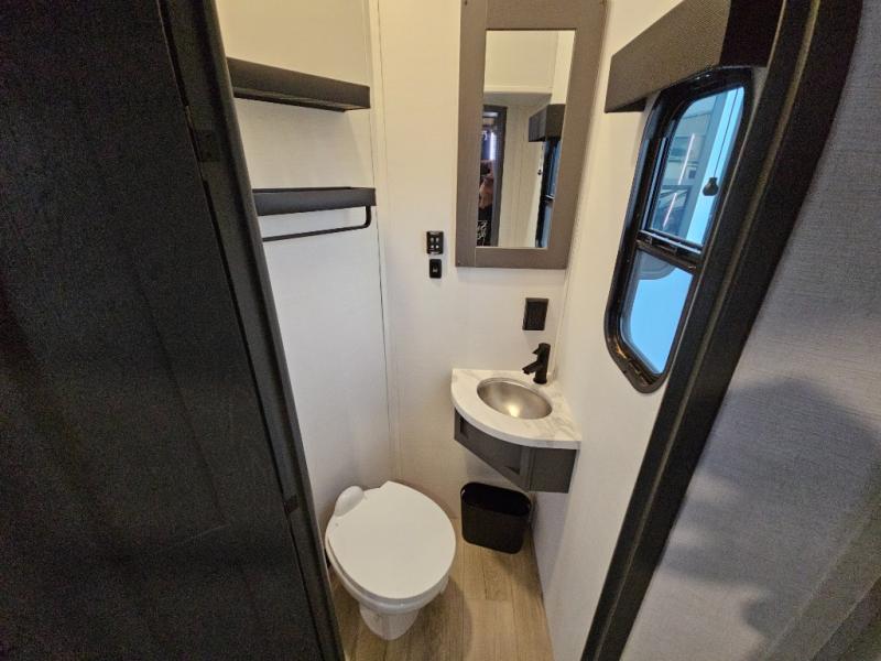 The whole gang will love camping in this toy hauler with 14' of toy parking space for your toys and gear. Once you have arrived at your destination, you can set up the HappiJac roll-over sofas with a queen bed above them, and also a loft which opens to the garage area as well. A half bath is also available off the garage which is an added convenience for those sleeping in this converted area, and for those coming in off the trail so that they do not have to track all through the main unit to use the bathroom. The chef can prepare great meals for their hungry crew with the fully equipped kitchen including a three burner cooktop, a 17 cu. ft. stainless steel 12V refrigerator, large sink, and plenty of countertop prep space. The rest of the gang can be relaxing on the large L-shaped sofa slide watching the 50" HDTV and enjoying the fireplace, or playing a game of cards at the dining table with four chairs. The front private bedroom features a king bed slide for more interior space, a flip top dresser for all of your belongings, and a front wardrobe that is prepped to add an optional washer and dryer, plus it has an entrance into the dual entry bathroom!