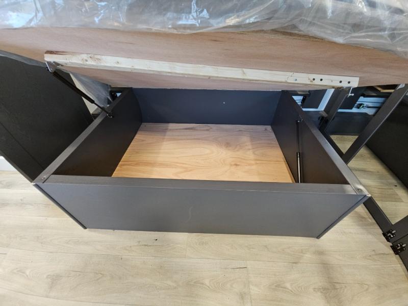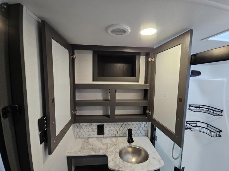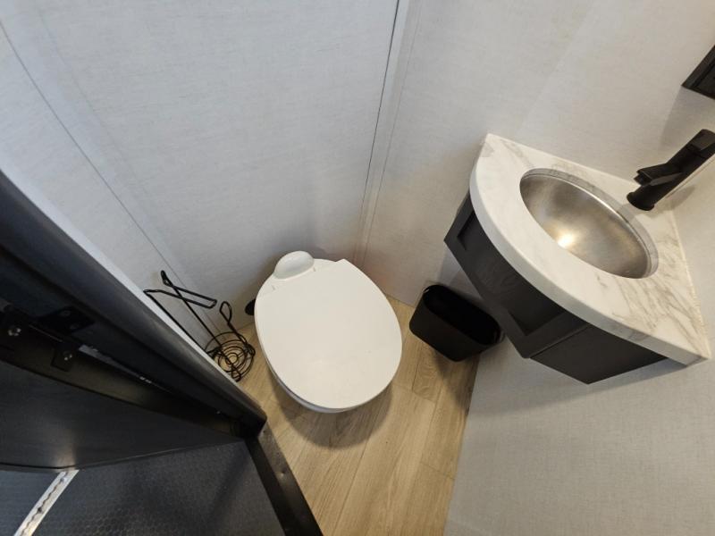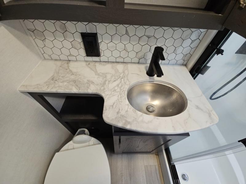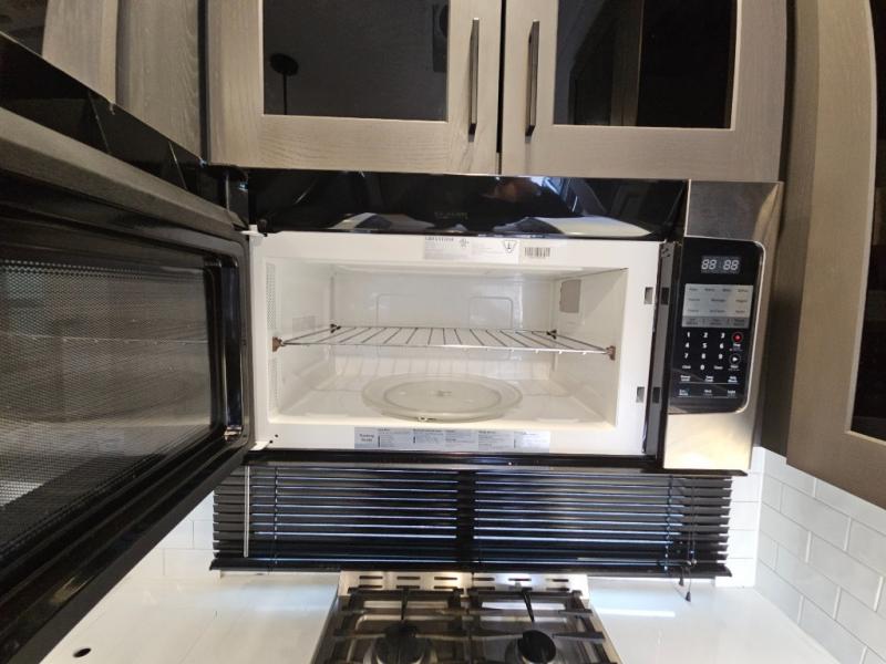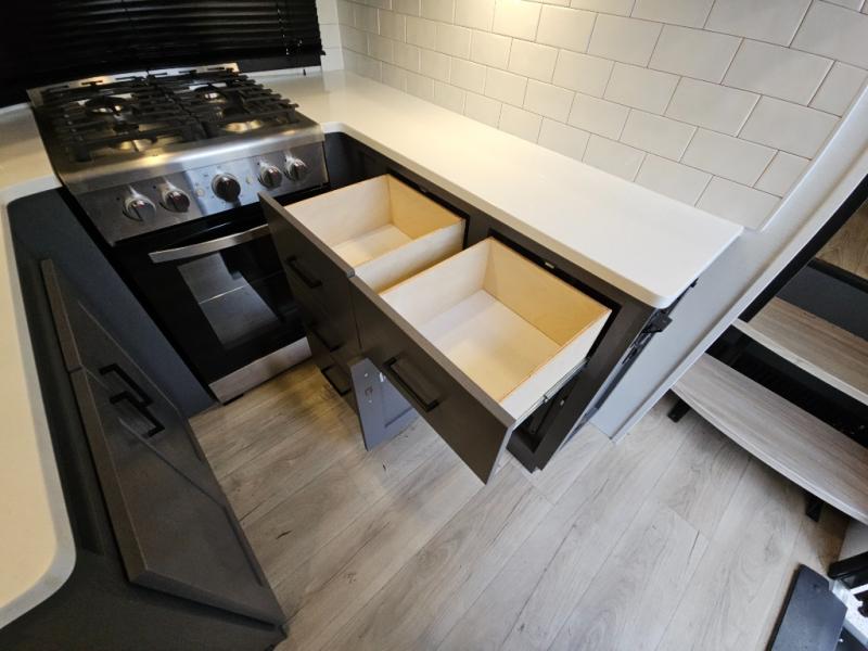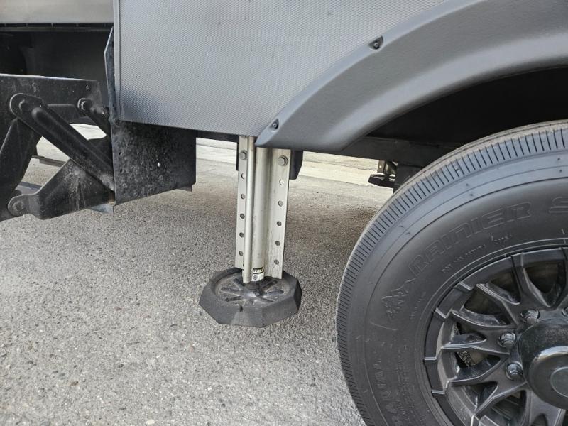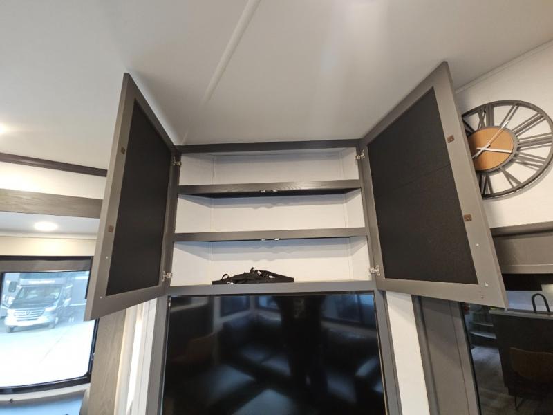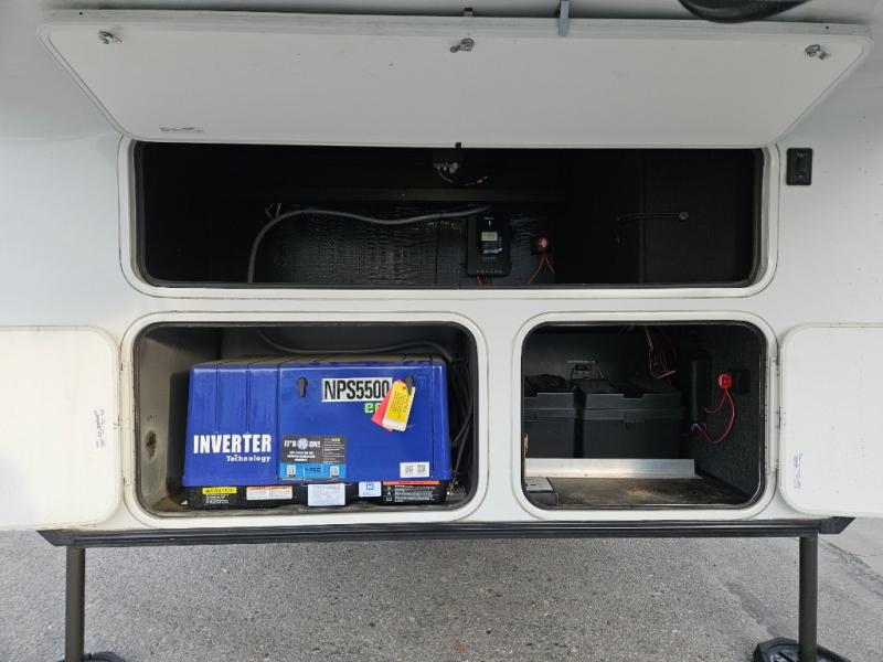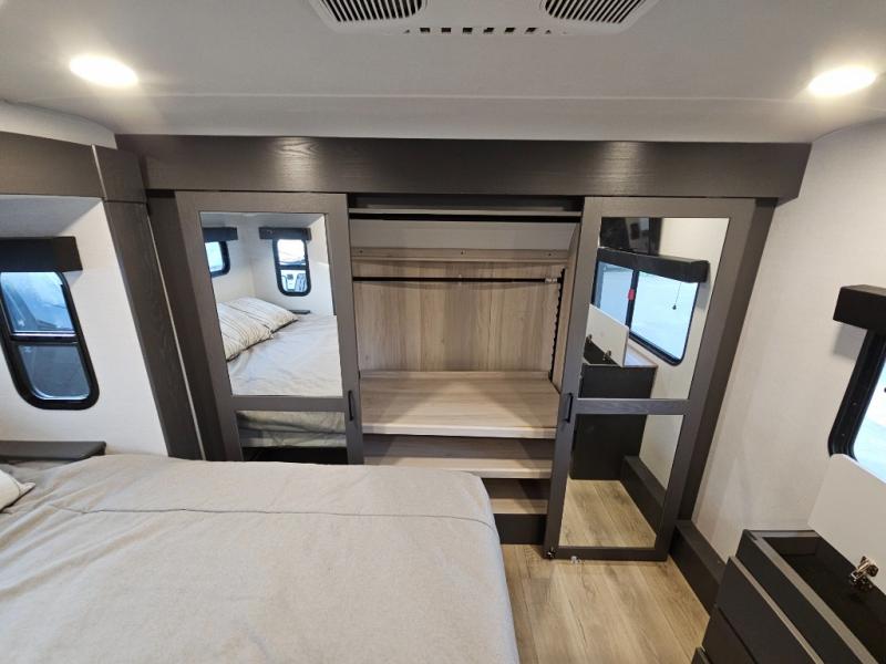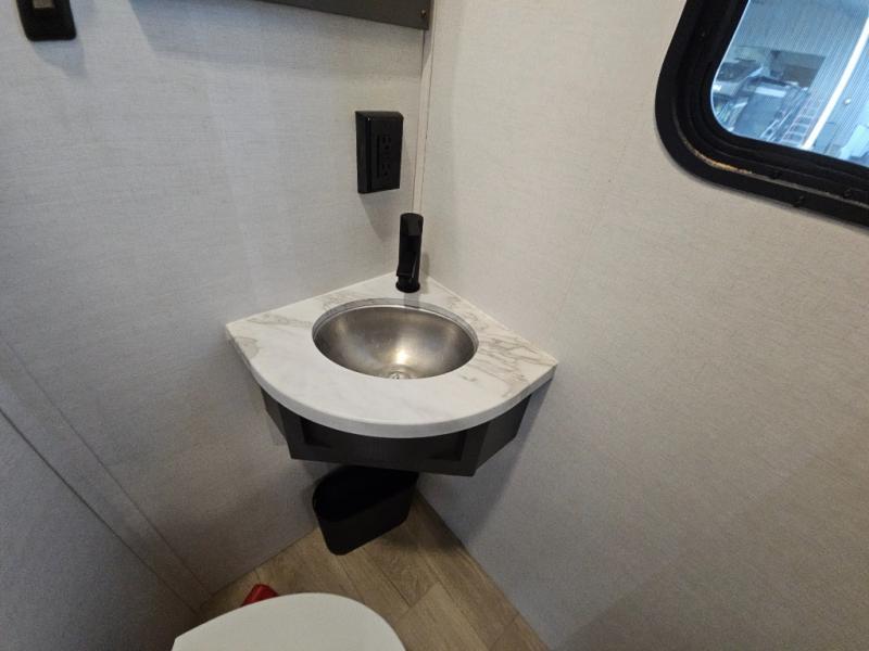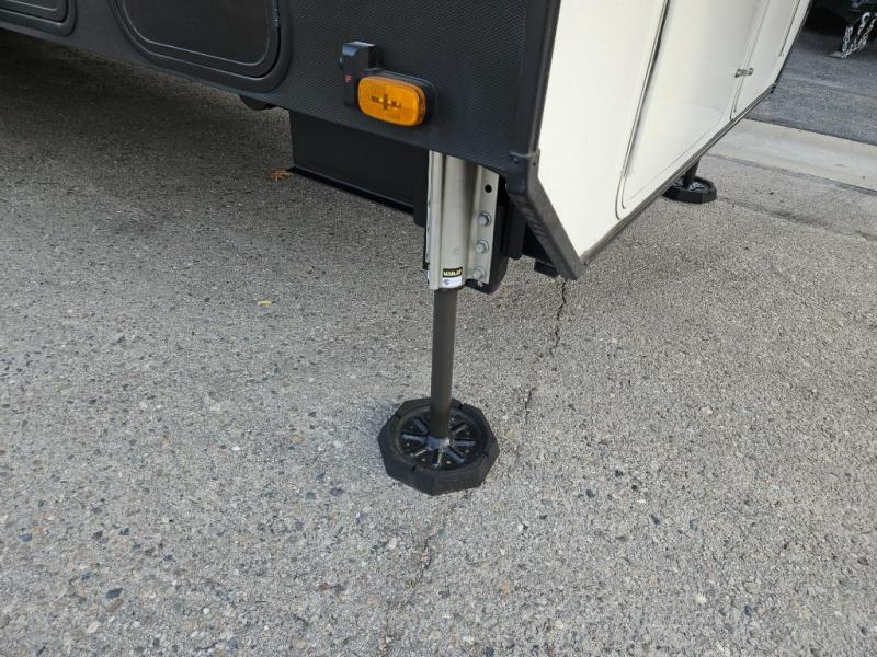The whole gang will love camping in this toy hauler with 14' of toy parking space for your toys and gear. Once you have arrived at your destination, you can set up the HappiJac roll-over sofas with a queen bed above them, and also a loft which opens to the garage area as well. A half bath is also available off the garage which is an added convenience for those sleeping in this converted area, and for those coming in off the trail so that they do not have to track all through the main unit to use the bathroom. The chef can prepare great meals for their hungry crew with the fully equipped kitchen including a three burner cooktop, a 17 cu. ft. stainless steel 12V refrigerator, large sink, and plenty of countertop prep space. The rest of the gang can be relaxing on the large L-shaped sofa slide watching the 50" HDTV and enjoying the fireplace, or playing a game of cards at the dining table with four chairs. The front private bedroom features a king bed slide for more interior space, a flip top dresser for all of your belongings, and a front wardrobe that is prepped to add an optional washer and dryer, plus it has an entrance into the dual entry bathroom!