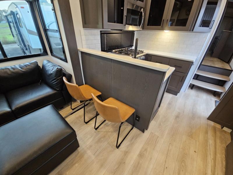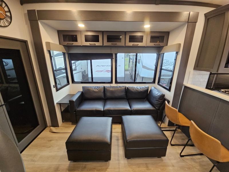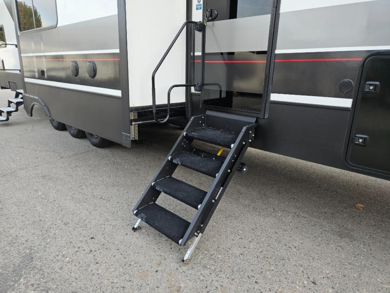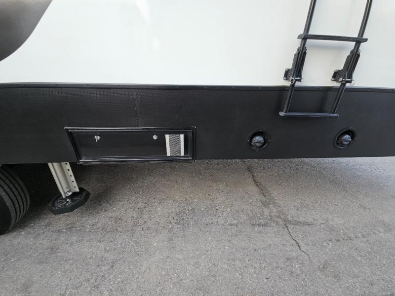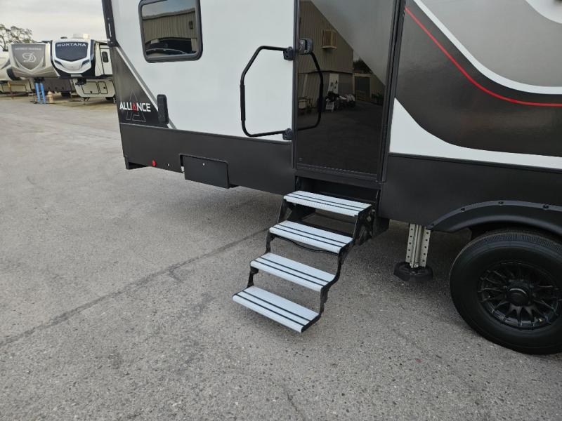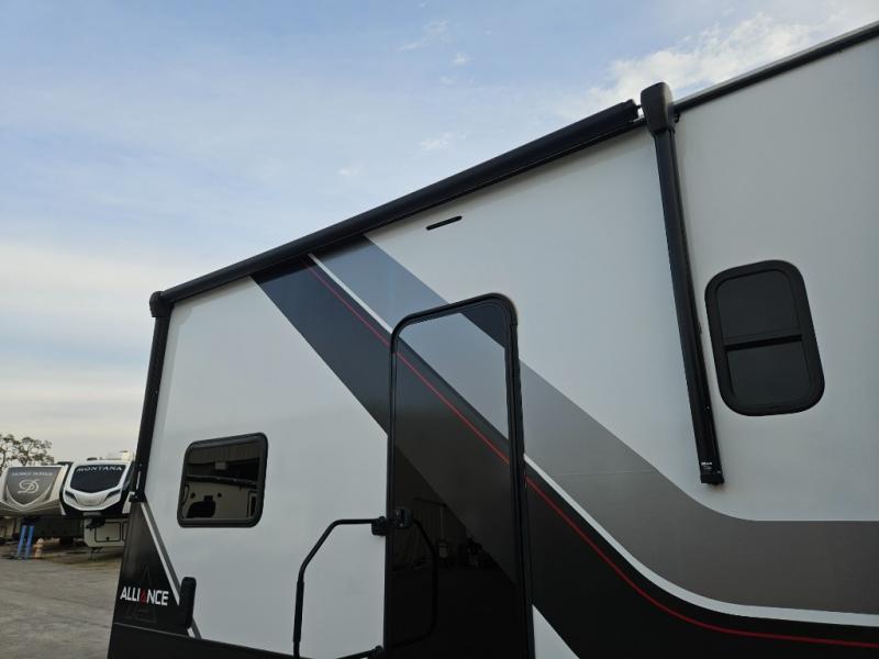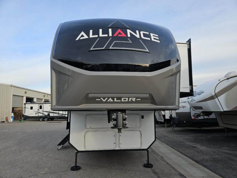 You can bring your toys with you wherever you go with any one of these Alliance RV Valor toy hauler fifth wheels! They are adventure-ready with a quality build from the walk on roof with seamless PVC roof covering to the commercial grade vinyl flooring and MorRyde CRE3000 suspension system. The Performance Running Gear package comes with a 101" wide-body benchmark chassis platform, 7,000 lb. Dexter axles, and a space enhancing drop frame storage compartment to pack in all your riding gear. You can even go off-gridding thanks to the Off the Grid Pack that has two 320 watt solar panels, generator prep, a 40 amp charge controller, and a 100 amp hour lithium iron phosphate battery, plus a battery monitor system. Some of the interior comforts you will enjoy are the hardwood cabinet doors and drawers, solid surface kitchen countertops, and commercial grade vinyl flooring with no carpet to make clean up a breeze. The Valor toy haulers are also the Master of 12 Volt with USB charging station throughout, power recliners, a 17 cu. ft. refrigerator, and more 12 volt features to make camping hassle-free!
