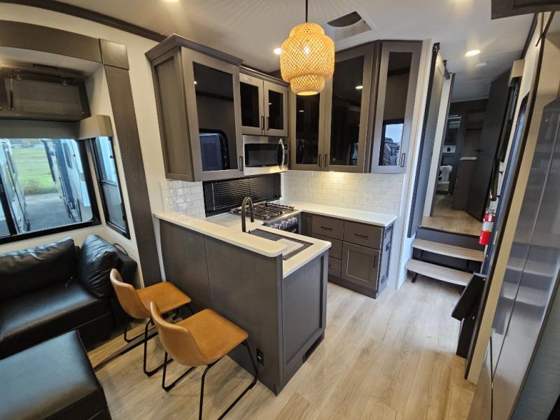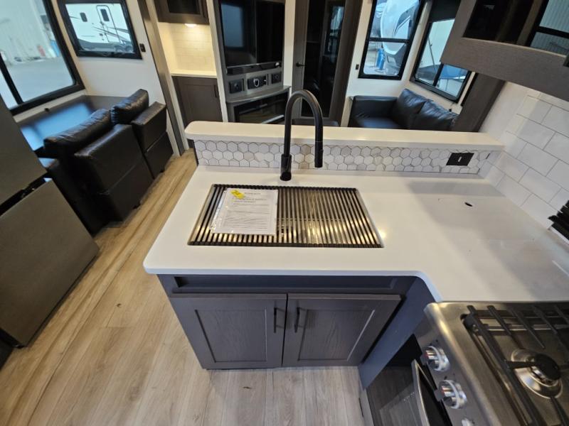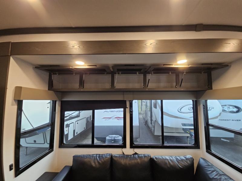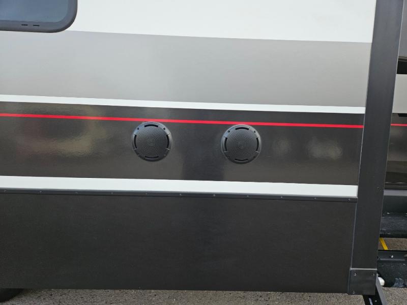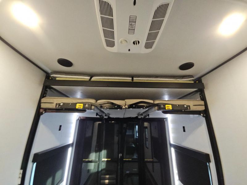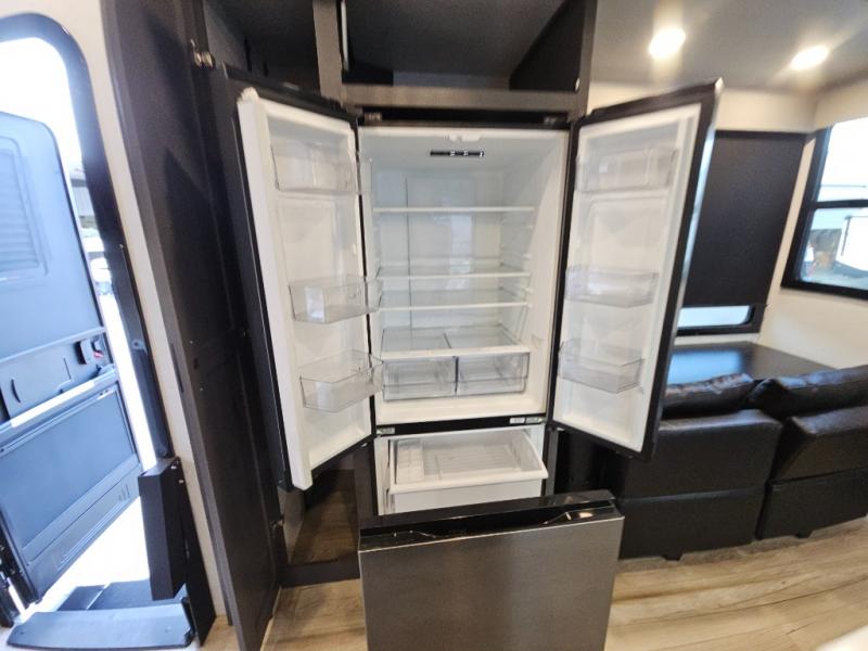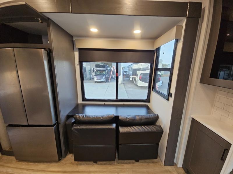 You can bring your toys with you wherever you go with any one of these Alliance RV Valor toy hauler fifth wheels! They are adventure-ready with a quality build from the walk on roof with seamless PVC roof covering to the commercial grade vinyl flooring and MorRyde CRE3000 suspension system. The Performance Running Gear package comes with a 101" wide-body benchmark chassis platform, 7,000 lb. Dexter axles, and a space enhancing drop frame storage compartment to pack in all your riding gear. You can even go off-gridding thanks to the Off the Grid Pack that has two 320 watt solar panels, generator prep, a 40 amp charge controller, and a 100 amp hour lithium iron phosphate battery, plus a battery monitor system. Some of the interior comforts you will enjoy are the hardwood cabinet doors and drawers, solid surface kitchen countertops, and commercial grade vinyl flooring with no carpet to make clean up a breeze. The Valor toy haulers are also the Master of 12 Volt with USB charging station throughout, power recliners, a 17 cu. ft. refrigerator, and more 12 volt features to make camping hassle-free!