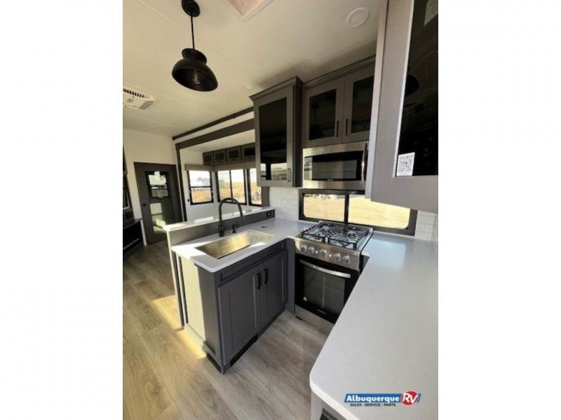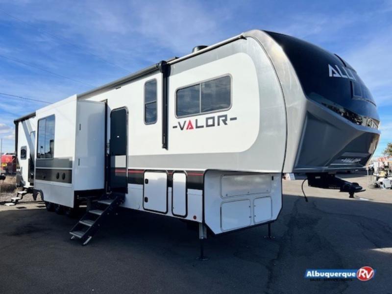 You can bring your toys with you wherever you go with any one of these Alliance RV Valor toy hauler fifth wheels! They are adventure-ready with a quality build from the walk on roof with seamless PVC roof covering to the commercial grade vinyl flooring and MorRyde CRE3000 suspension system. The Performance Running Gear package comes with a 101" wide-body benchmark chassis platform, 7,000 lb. Dexter axles, and a space enhancing drop frame storage compartment to pack in all your riding gear. You can even go off-gridding thanks to the Off the Grid Pack that has two 320 watt solar panels, generator prep, a 40 amp charge controller, and a 100 amp hour lithium iron phosphate battery, plus a battery monitor system. Some of the interior comforts you will enjoy are the hardwood cabinet doors and drawers, solid surface kitchen countertops, and commercial grade vinyl flooring with no carpet to make clean up a breeze. The Valor toy haulers are also the Master of 12 Volt with USB charging station throughout, power recliners, a 17 cu. ft. refrigerator, and more 12 volt features to make camping hassle-free!