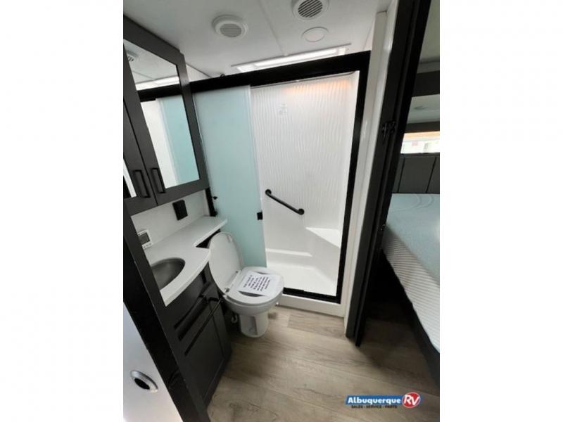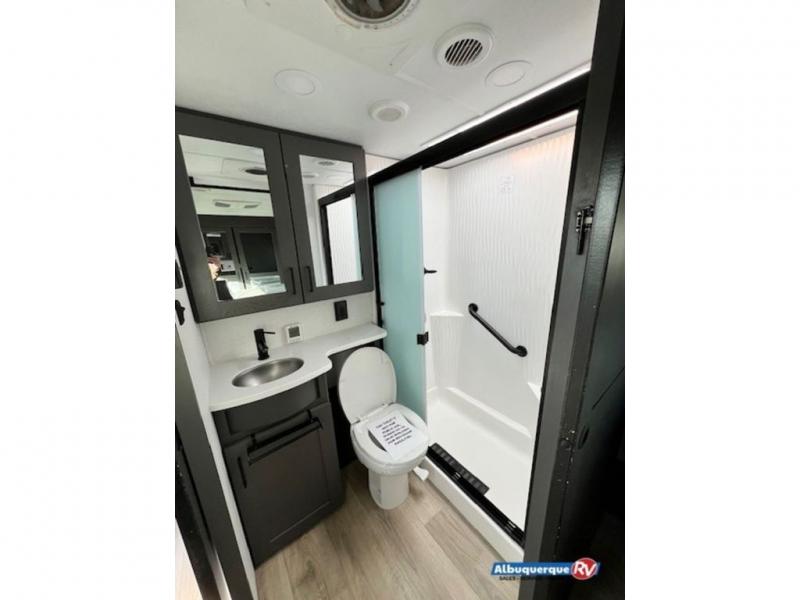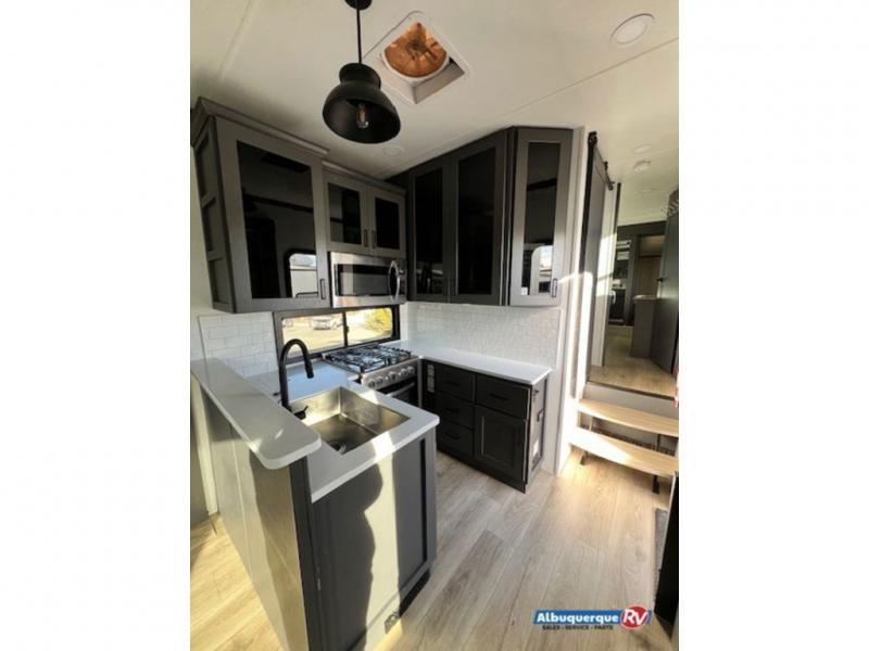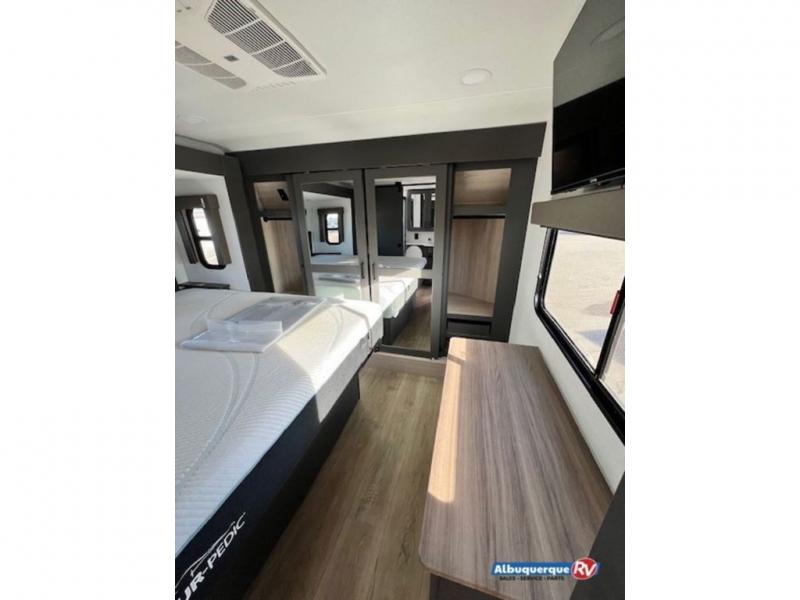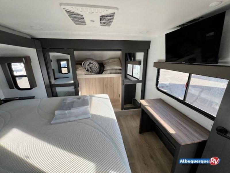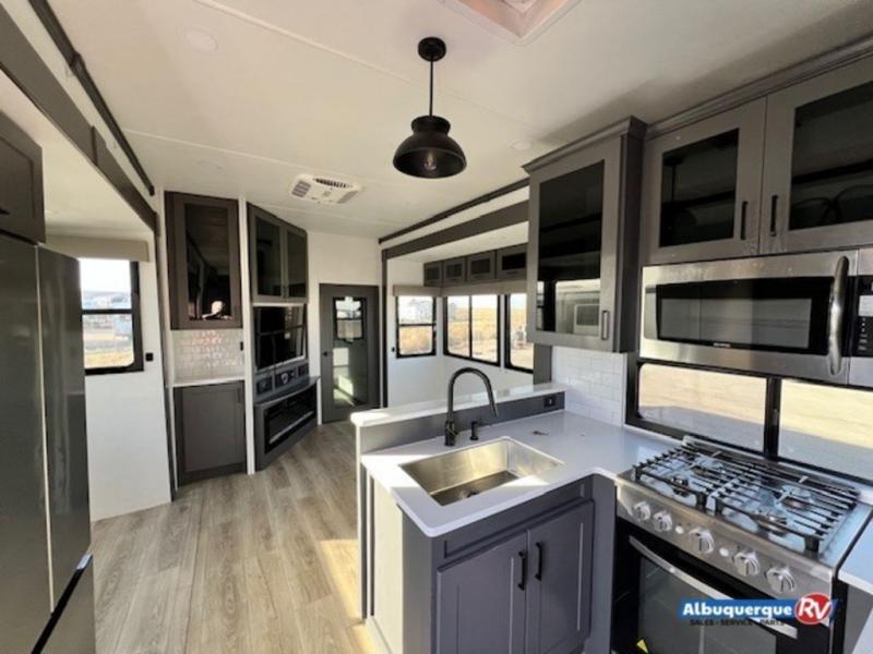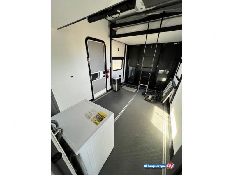 The whole gang will love camping in this toy hauler with 14' of toy parking space for your toys and gear. Once you have arrived at your destination, you can set up the HappiJac roll-over sofas with a queen bed above them, and also a loft which opens to the garage area as well. A half bath is also available off the garage which is an added convenience for those sleeping in this converted area, and for those coming in off the trail so that they do not have to track all through the main unit to use the bathroom. The chef can prepare great meals for their hungry crew with the fully equipped kitchen including a three burner cooktop, a 17 cu. ft. stainless steel 12V refrigerator, large sink, and plenty of countertop prep space. The rest of the gang can be relaxing on the large L-shaped sofa slide watching the 50" HDTV and enjoying the fireplace, or playing a game of cards at the dining table with four chairs. The front private bedroom features a king bed slide for more interior space, a flip top dresser for all of your belongings, and a front wardrobe that is prepped to add an optional washer and dryer, plus it has an entrance into the dual entry bathroom!