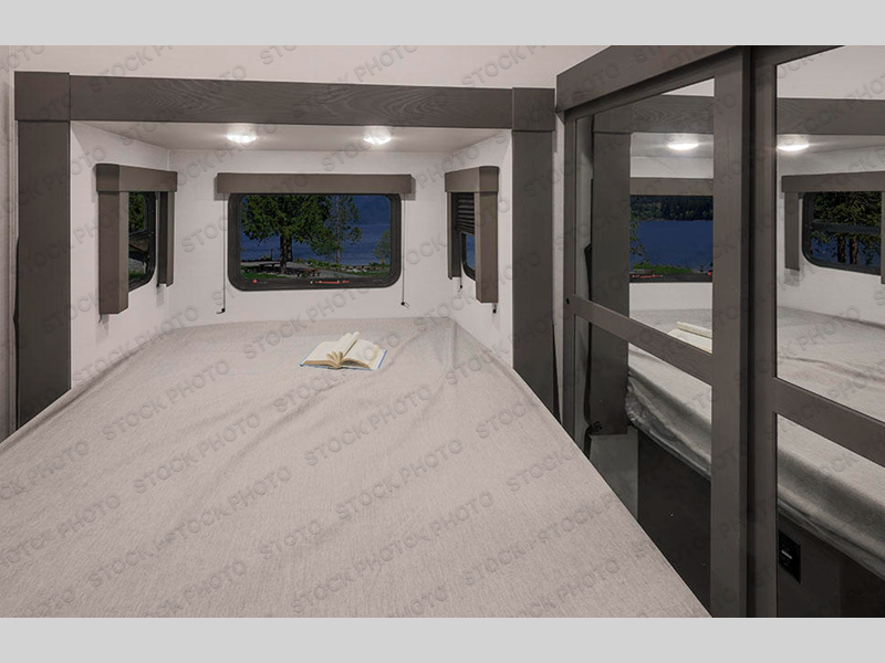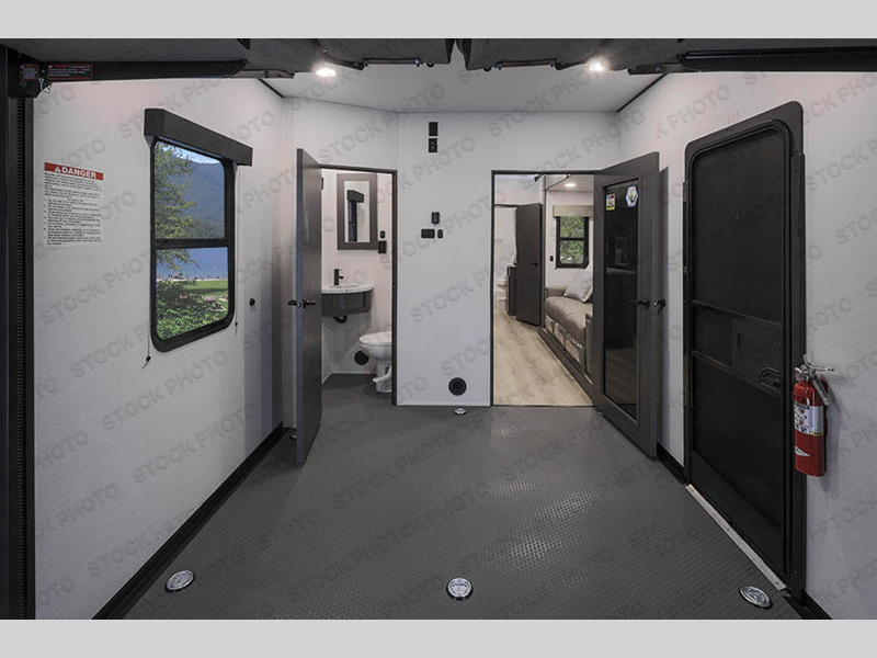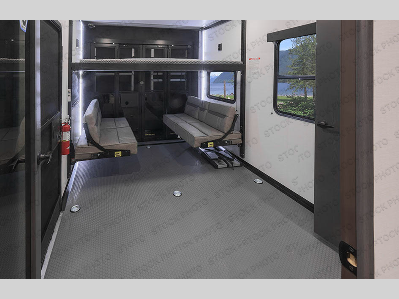 This toy hauler has everything you need and then some! Starting with the dual entry doors which create a smooth flow of traffic in and out to the 13' garage with HappiJac roll-over sofas, a drop-down bed, one of the entrances, and a even a half bathroom. The fully equipped kitchen comes with a three burner cooktop and an 11 cu. ft. refrigerator slide, a kitchen island for easier meal prep, and a pantry to store all of your favorite snacks. Relax in true comfort each night on the sofa slide while you watch a movie on the 40" HDTV. After a fun day of riding the trails, you can clean the mud out of your hair in the dual entry bathroom with the 30" x 36" shower. The private bedroom has a queen bed slide to lay your head and a wardrobe to keep your clothes out of the way!