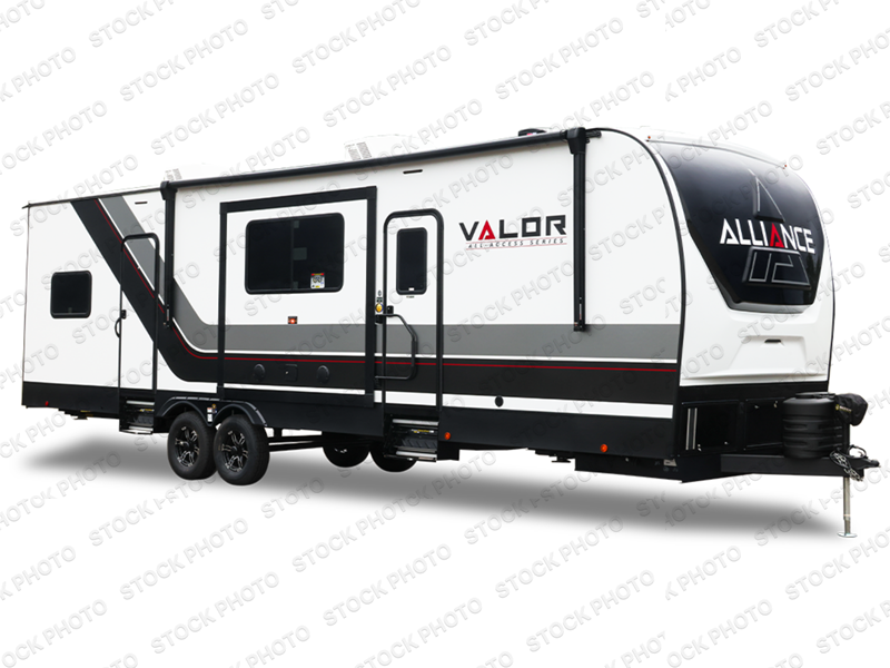 With any Valor All-Access toy hauler by Alliance RV you will be getting a travel trailer or fifth wheel with exceptional features at a great value! There is a painted fiberglass front cap, Mylar reinforced exterior seals, Azdel-backed fiberglass sidewalls, and a walk-on roof with a seamless PVC roof covering for added strength and durability. The 101" wide-body Benchmark chassis means you can bring along your larger toys, and the multipoint tie-down system will keep your toys safe and secure on the way to the campground. All of your power needs will be met with the Masters of 12 Volt Package that includes a 12V JBL sound system and USB charging stations throughout, plus the Off The Grid Pack comes with a 320 watt solar panel, battery monitor system, and generator prep to keep you going all week long. Some of the interior comforts you'll enjoy are commercial grade vinyl flooring with no carpet so you can easily clean up, black cabinetry hardware, residential LED recessed ceiling lights, and so much more!