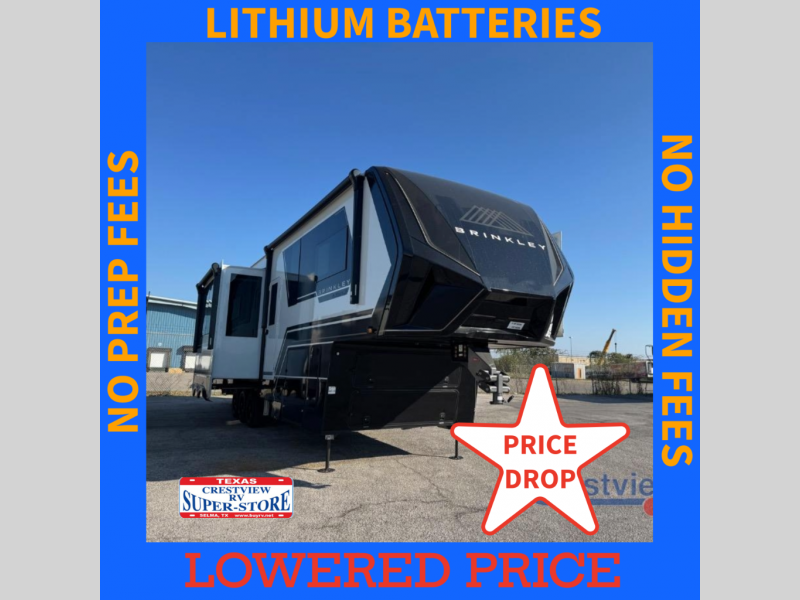 Brinkley! Best Price In USA! Slide Topper Option - 30K Gen Y Hitch - Triple AC - Flex Fuel Generator - 400 Watts/Solar/Lithium Batteries & 3000 Watt Invertor- Four Awnings - 16 Ply Tires - Dexter Tow Assist & Much More!
