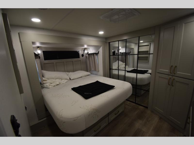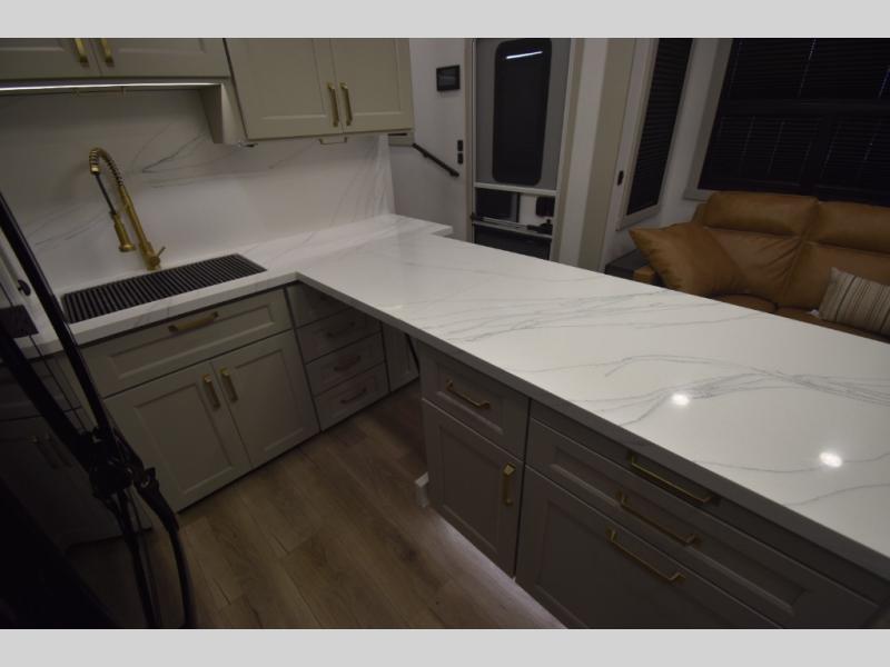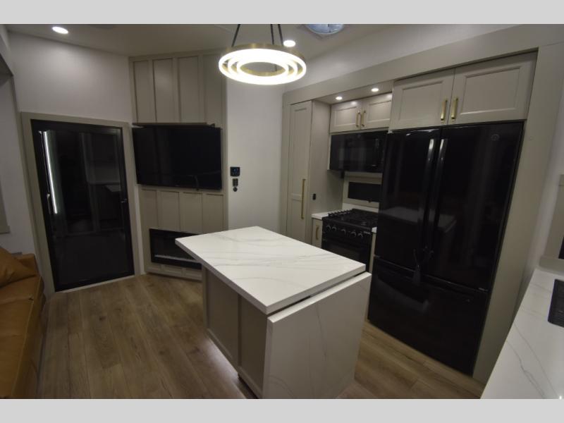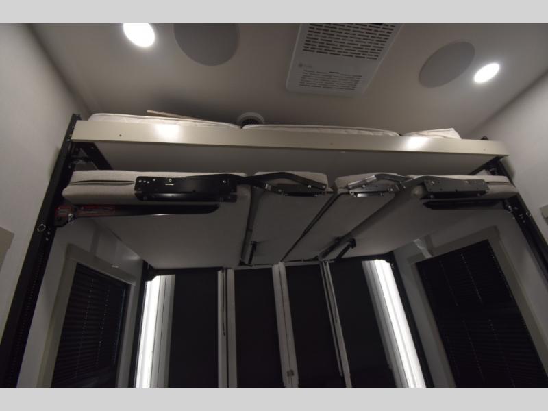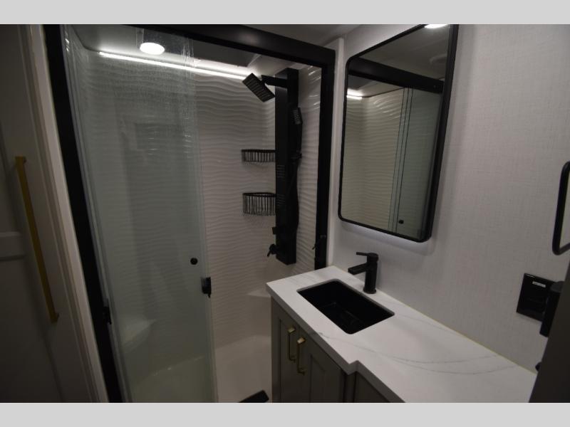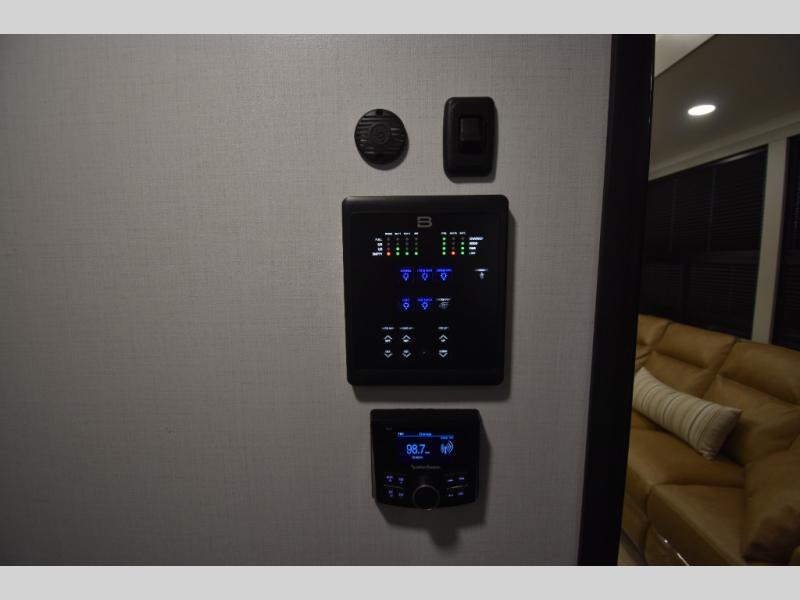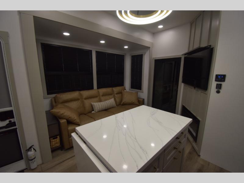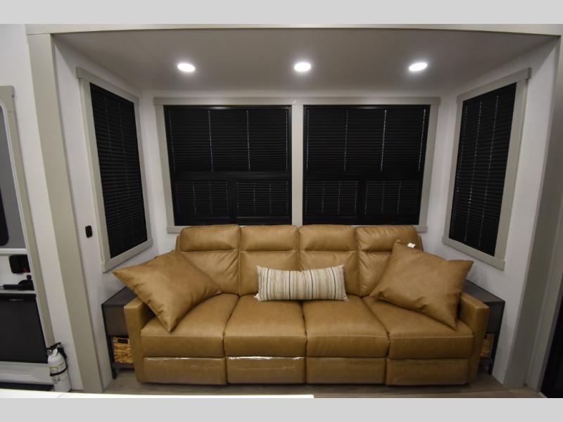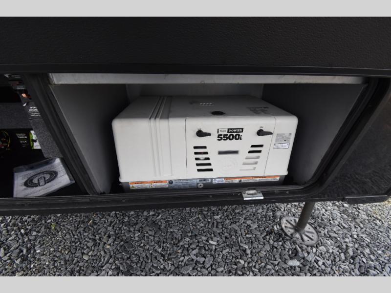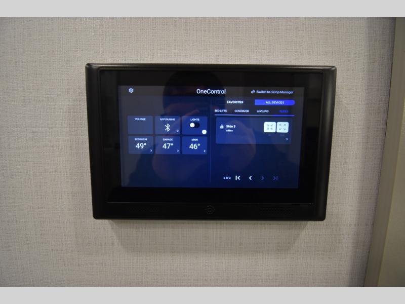 With any Model G toy hauler fifth wheel by Brinkley you will enjoy luxurious amenities, tons of storage space, and innovative features that have been developed and tested in the real world. Durable construction includes an industry leading PDI process, an industry best insulation package, and reinforced and walkable slide roofs. Some of the exterior features you'll find are a 3-way pass-through with a multi-functional flip-up bulkhead wall, under I-beam storage, a MAX-Vision reverse lighting system, and a low-maintenance roof to name a few. A Rockford Fosgate audio system comes standard, along with a OneControl app system that lets you control your fifth wheel's functions right from your mobile device. You will find the solar system with a designated storage area to be ultra convenient, plus there is a FlexPower 5500 with a dual fuel inverter generator for all your power needs. Head inside to find a residential interior with Brinkley's CraftSense wood trim construction, floating entrance steps, integrated window screens and insulated blackout blinds, and residential solid surface countertops plus backsplash. You will also enjoy the neon shower lighting and recessed medicine cabinets in the bath, plus motion activated LED bed lights and dual bedside outlets in the bedroom. Choose a Model G toy hauler fifth wheel to experience all the luxury it has to offer!