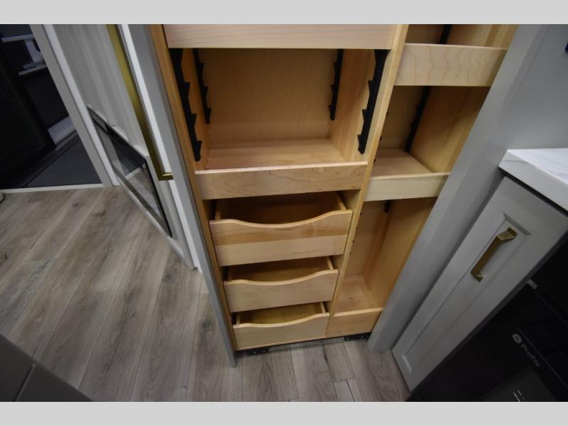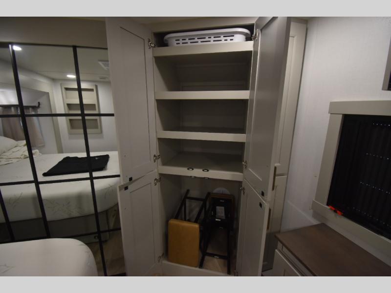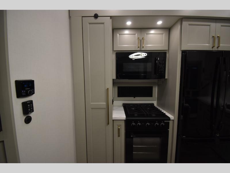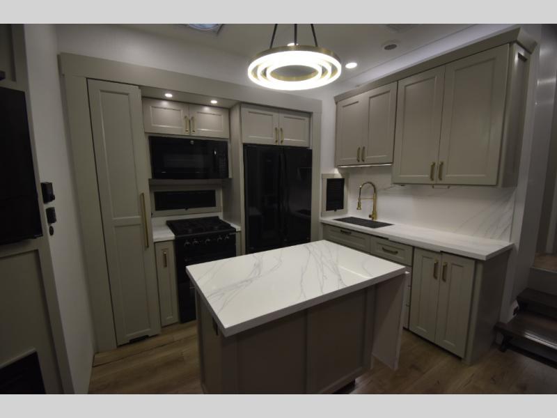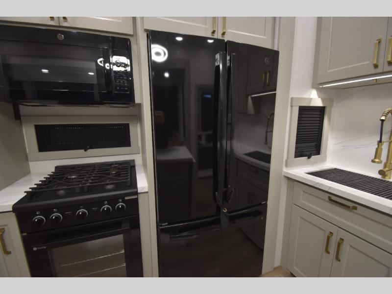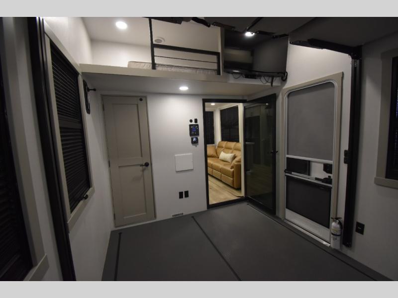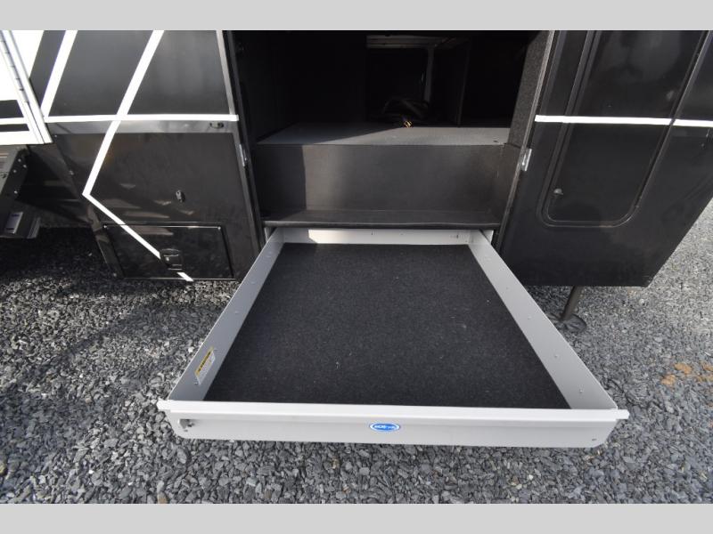 Prepare to be amazed by all the features packed into this toy hauler! There are triple slides that will provide your crew with more space, a separate garage that can sleep five with the loft included, plus a bath and a half for added convenience. The chef of your group will love the middle kitchen with a waterfall island that converts to a counter peninsula, a pull-out pantry, a GE Energy Star 19 cu. ft. refrigerator with ice and filtered water, and much more. In the combined kitchen and living space you'll find a spacious sofa with heat and massage, a fireplace, a TV, plus convenient dog bowls and shoe storage. After your toys are unloaded from the garage, you can relax on the independent dual sofas with a Fold-N-Stow table in between, and your guests can sleep on the Happijac® Sofa and Bed Lift system. You will find the front private bedroom with a king bed slide out will provide a great night's rest, and you'll also find a walk-in closet, under-bed storage, and a sliding dresser top with hidden storage for special belongings.