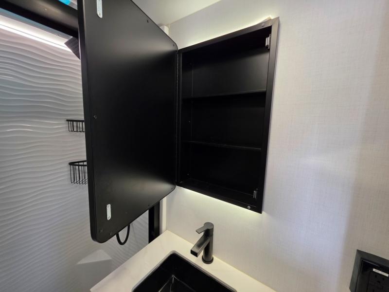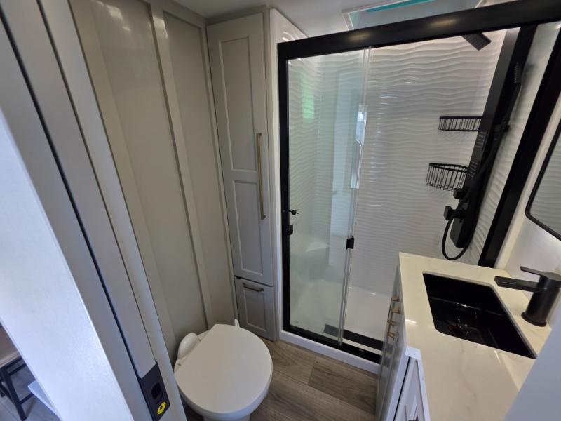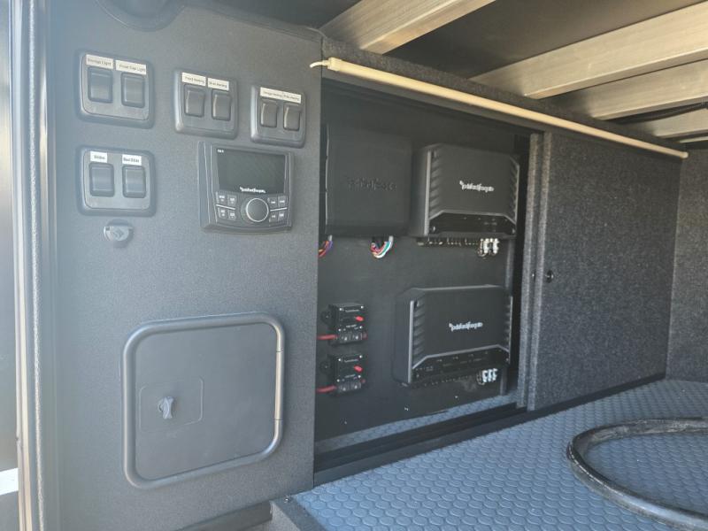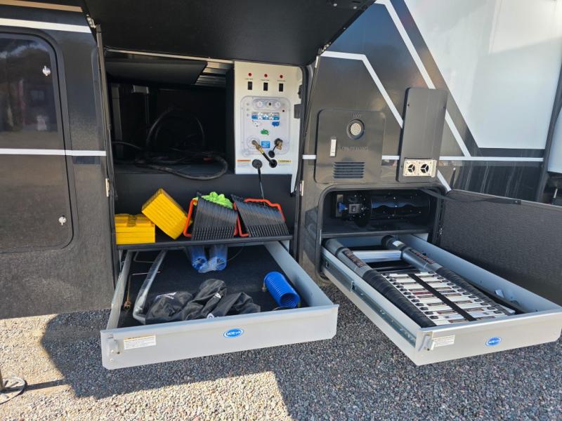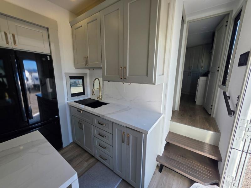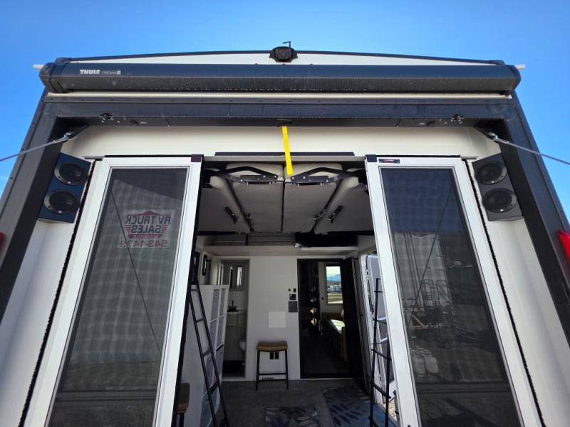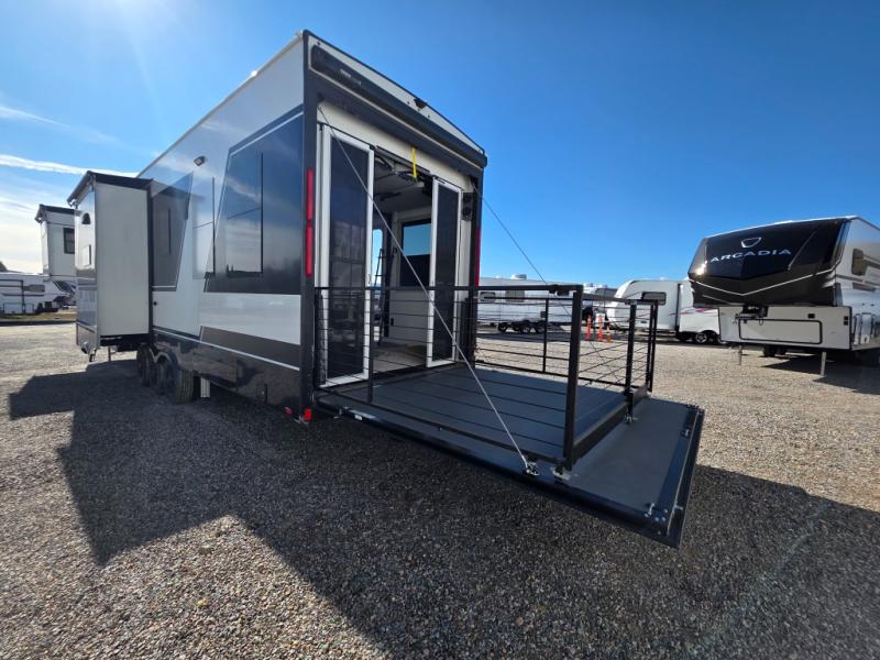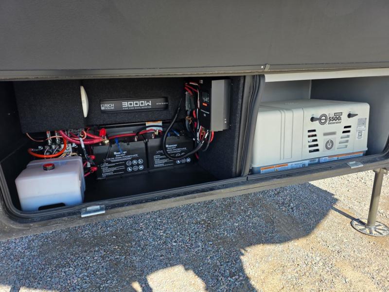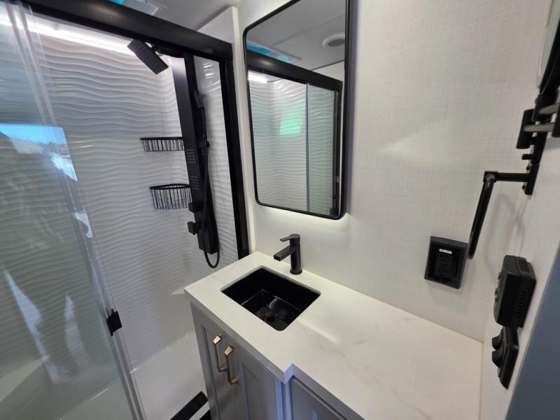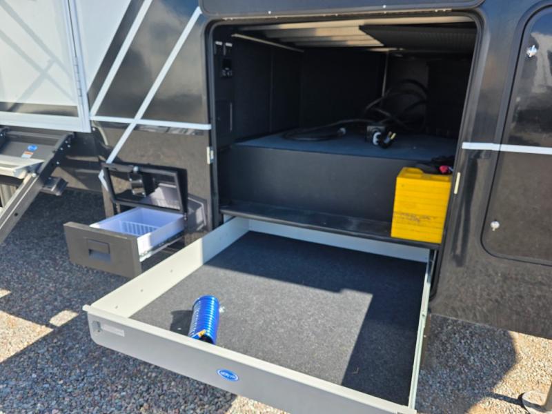 With any Model G toy hauler fifth wheel by Brinkley you will enjoy luxurious amenities, tons of storage space, and innovative features that have been developed and tested in the real world. Durable construction includes an industry leading PDI process, an industry best insulation package, and reinforced and walkable slide roofs. Some of the exterior features you'll find are a 3-way pass-through with a multi-functional flip-up bulkhead wall, under I-beam storage, a MAX-Vision reverse lighting system, and a low-maintenance roof to name a few. A Rockford Fosgate audio system comes standard, along with a OneControl app system that lets you control your fifth wheel's functions right from your mobile device. You will find the solar system with a designated storage area to be ultra convenient, plus there is a FlexPower 5500 with a dual fuel inverter generator for all your power needs. Head inside to find a residential interior with Brinkley's CraftSense wood trim construction, floating entrance steps, integrated window screens and insulated blackout blinds, and residential solid surface countertops plus backsplash. You will also enjoy the neon shower lighting and recessed medicine cabinets in the bath, plus motion activated LED bed lights and dual bedside outlets in the bedroom. Choose a Model G toy hauler fifth wheel to experience all the luxury it has to offer!