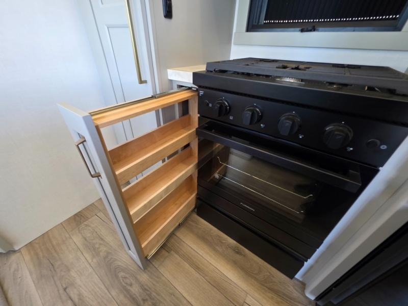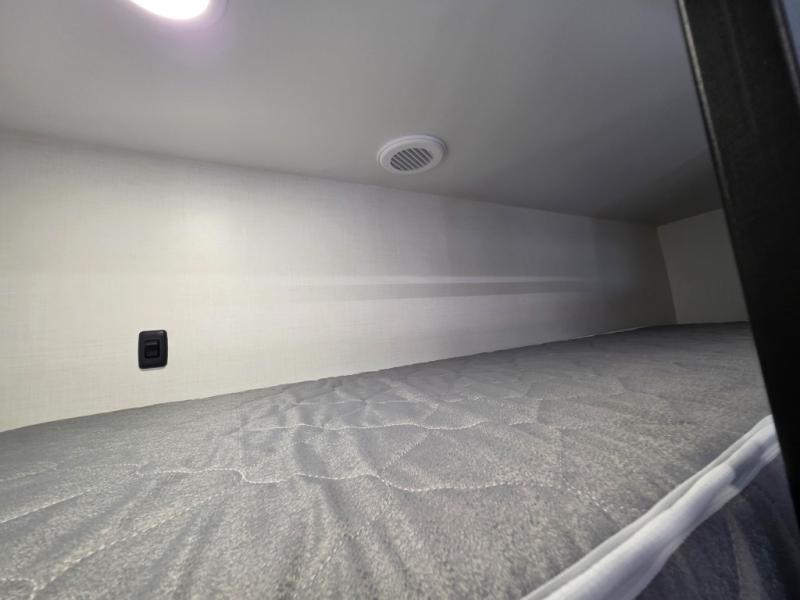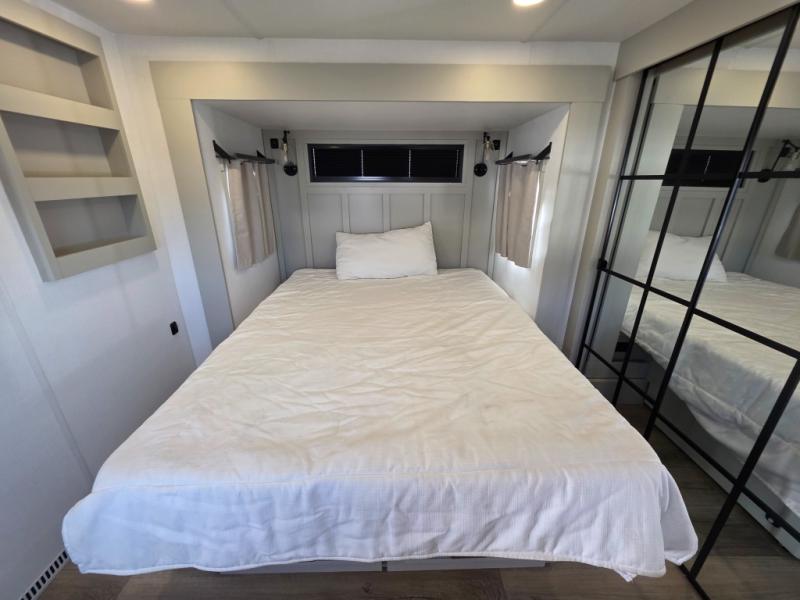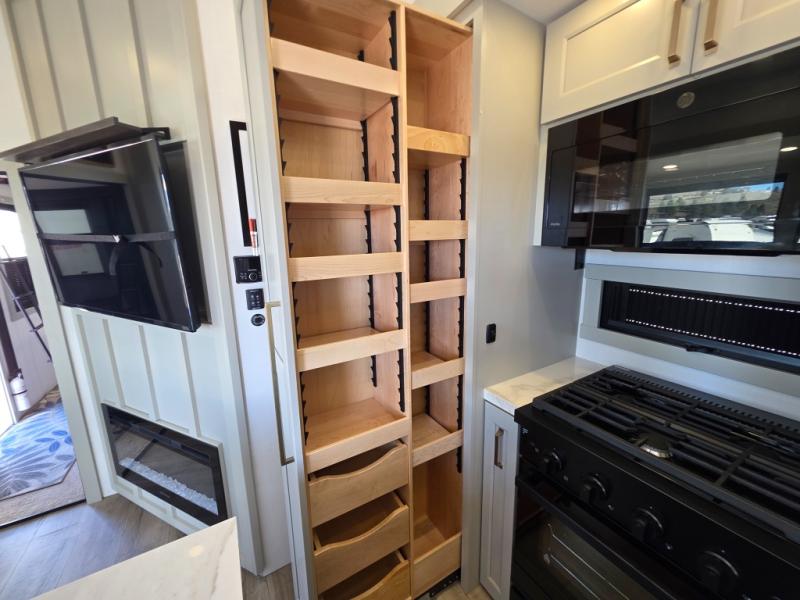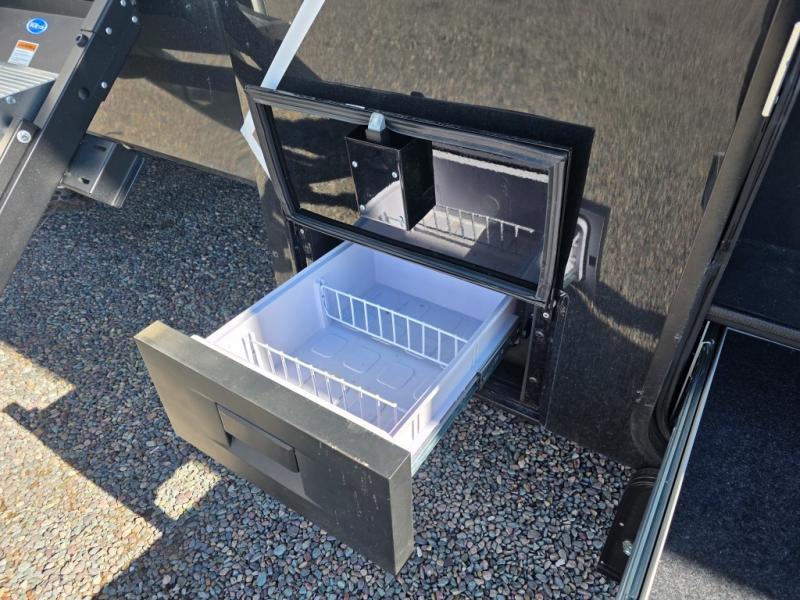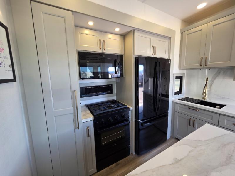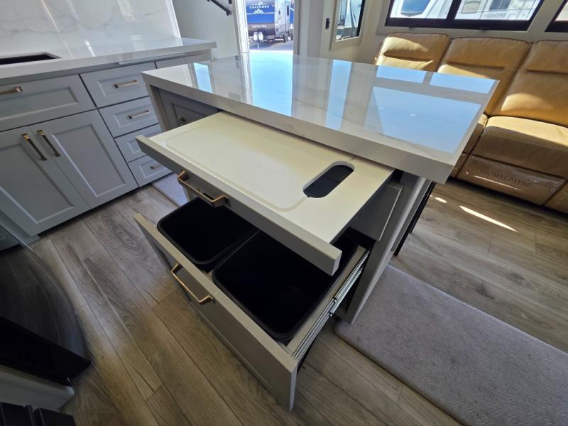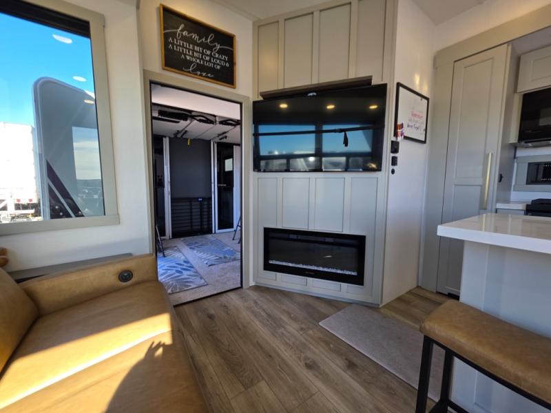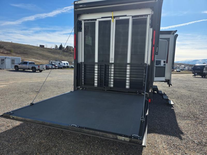 Prepare to be amazed by all the features packed into this toy hauler! There are triple slides that will provide your crew with more space, a separate garage that can sleep five with the loft included, plus a bath and a half for added convenience. The chef of your group will love the middle kitchen with a waterfall island that converts to a counter peninsula, a pull-out pantry, a GE Energy Star 19 cu. ft. refrigerator with ice and filtered water, and much more. In the combined kitchen and living space you'll find a spacious sofa with heat and massage, a fireplace, a TV, plus convenient dog bowls and shoe storage. After your toys are unloaded from the garage, you can relax on the independent dual sofas with a Fold-N-Stow table in between, and your guests can sleep on the Happijac® Sofa and Bed Lift system. You will find the front private bedroom with a king bed slide out will provide a great night's rest, and you'll also find a walk-in closet, under-bed storage, and a sliding dresser top with hidden storage for special belongings.
