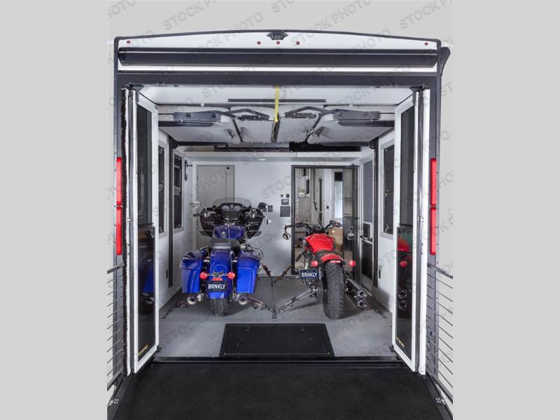 With any Model G toy hauler fifth wheel by Brinkley you will enjoy luxurious amenities, tons of storage space, and innovative features that have been developed and tested in the real world. Durable construction includes an industry leading PDI process, an industry best insulation package, and reinforced and walkable slide roofs. Some of the exterior features you'll find are a 3-way pass-through with a multi-functional flip-up bulkhead wall, under I-beam storage, a MAX-Vision reverse lighting system, and a low-maintenance roof to name a few. A Rockford Fosgate audio system comes standard, along with a OneControl app system that lets you control your fifth wheel's functions right from your mobile device. You will find the solar system with a designated storage area to be ultra convenient, plus there is a FlexPower 5500 with a dual fuel inverter generator for all your power needs. Head inside to find a residential interior with Brinkley's CraftSense wood trim construction, floating entrance steps, integrated window screens and insulated blackout blinds, and residential solid surface countertops plus backsplash. You will also enjoy the neon shower lighting and recessed medicine cabinets in the bath, plus motion activated LED bed lights and dual bedside outlets in the bedroom. Choose a Model G toy hauler fifth wheel to experience all the luxury it has to offer!