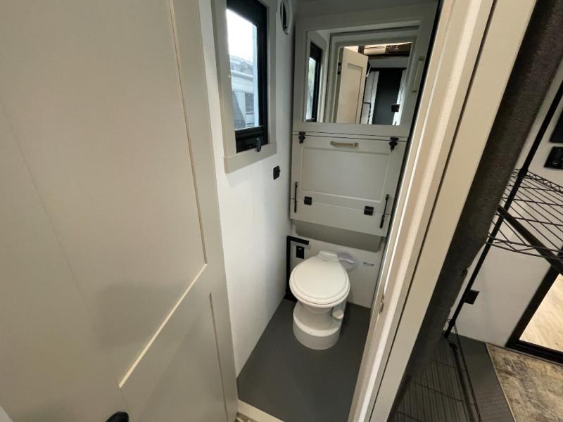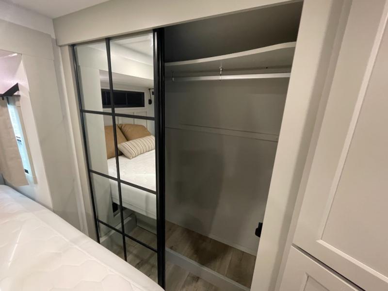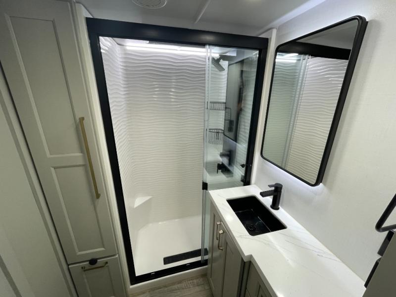 The private master bedroom offers a peaceful retreat with a comfortable king-size bed, wardrobe storage, and plenty of room to stretch out and relax. Thoughtful storage solutions make it easy to bring everything you need for extended trips. The full bathroom features a large shower, vanity, and modern fixtures designed for comfort and convenience while on the road.