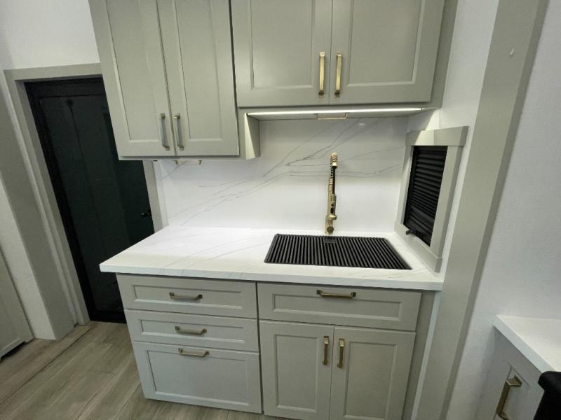 Inside the main living area, you’ll immediately notice the upscale finishes and modern design. Comfortable theater seating and a plush sofa create the perfect place to relax after a long day of adventure. The entertainment center with a large TV and fireplace adds a cozy atmosphere, making movie nights or relaxing evenings feel just like home. Large windows allow natural light to pour in, creating a bright and inviting space.