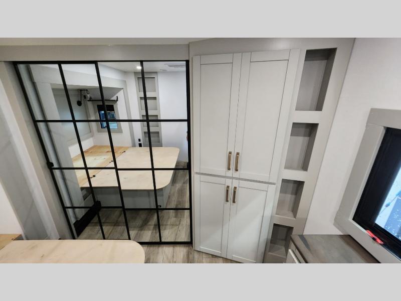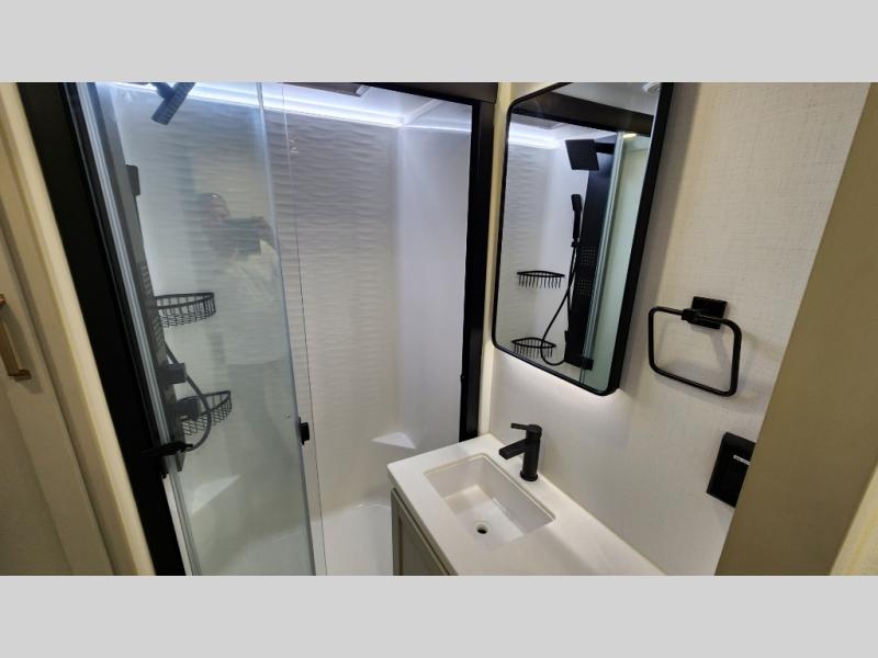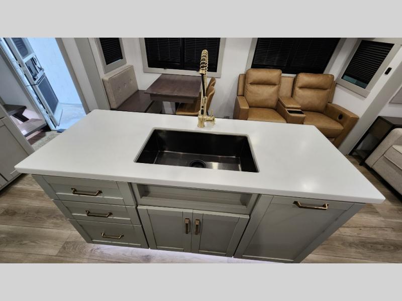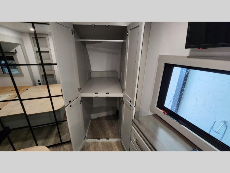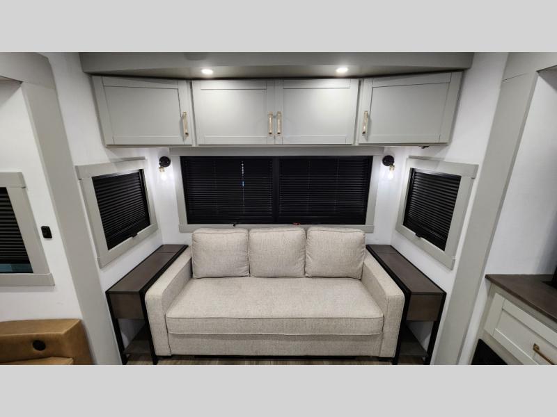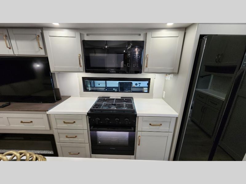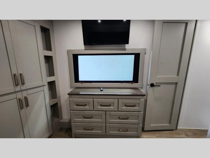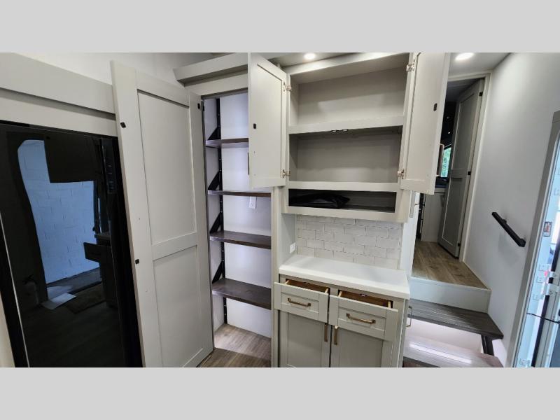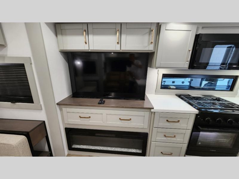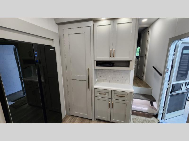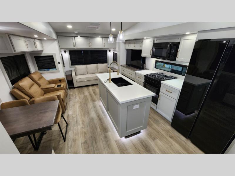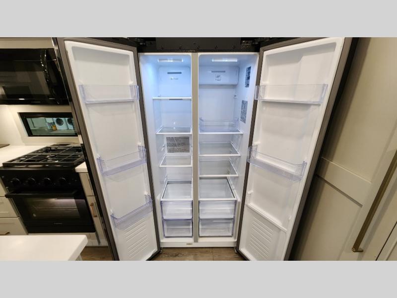 When you want travel accommodations to feel just like home! This Model Z luxury fifth wheel is bright and modern on the inside, with loads of amenities that will have you dreaming of your next trip! Enter and find a spacious combined living/kitchen space thanks to dual opposing slides. There is ample seating with a free standing dinette that includes a built-in utensil drawer, 62" theater seating, and a 72" tri-fold sofa along the rear wall. You can easily relax and enjoy the 50" Smart telescoping TV with a cozy fireplace below. The kitchen offers all that you need to prepare and cook meals just like home with a 16 cu. ft. refrigerator for your perishables, a 30" microwave oven, and three burner range top and oven. You will love the integrated spice rack, and the kitchen island all outfitted with dog bowls and double pull out trash bins with an integrated Stow & Go paper towel holder. There is also an 84" pantry with adjustable shelves for all of your canned and dry goods. Head up the steps to a private master suite with king bed slide. You can opt for the queen bed if you like. A sliding dresser top features hidden storage which is perfect for jewelry and other personal belongings. The front wardrobe features mirrored doors and the corner closet has been prepped for a stackable washer and dryer if you choose to add that option. Relax and enjoy a large bath featuring a linen cabinet, a 30" x 42" shower, and vanity with sink, plus medicine cabinet. You will also appreciate having dual showers on the outside of this unit, and a rear baggage door and mid-coach pass-through storage.