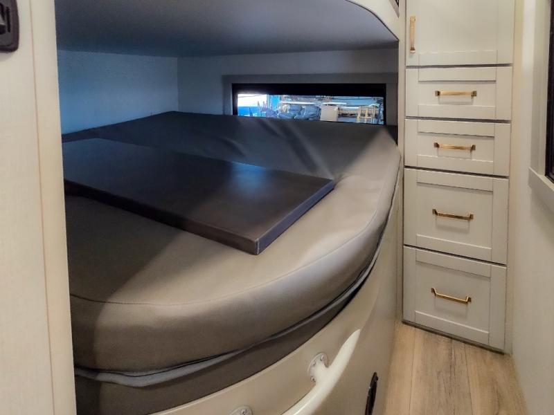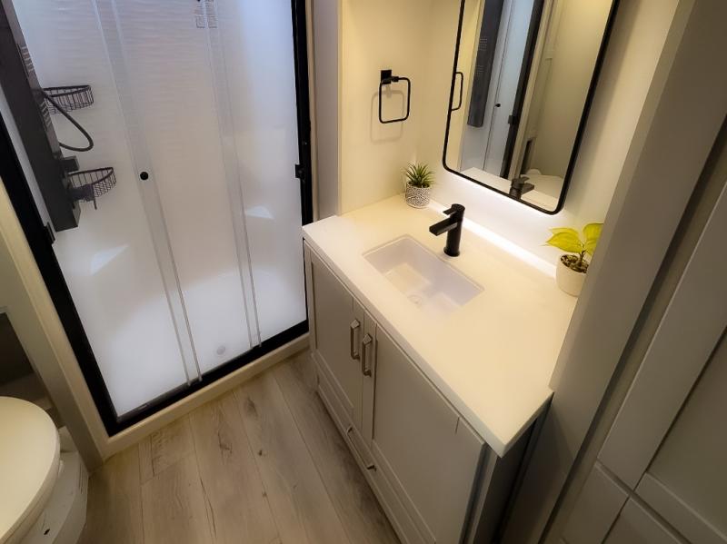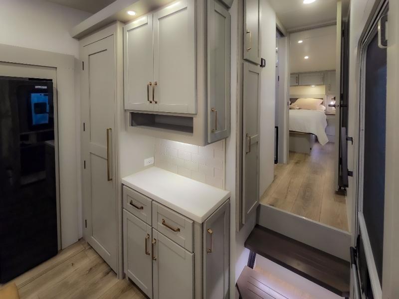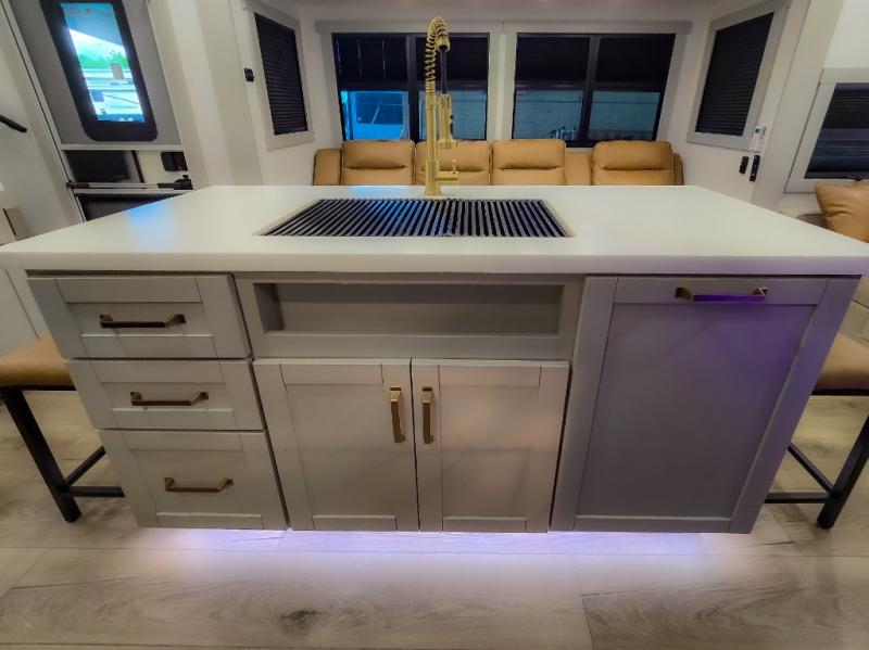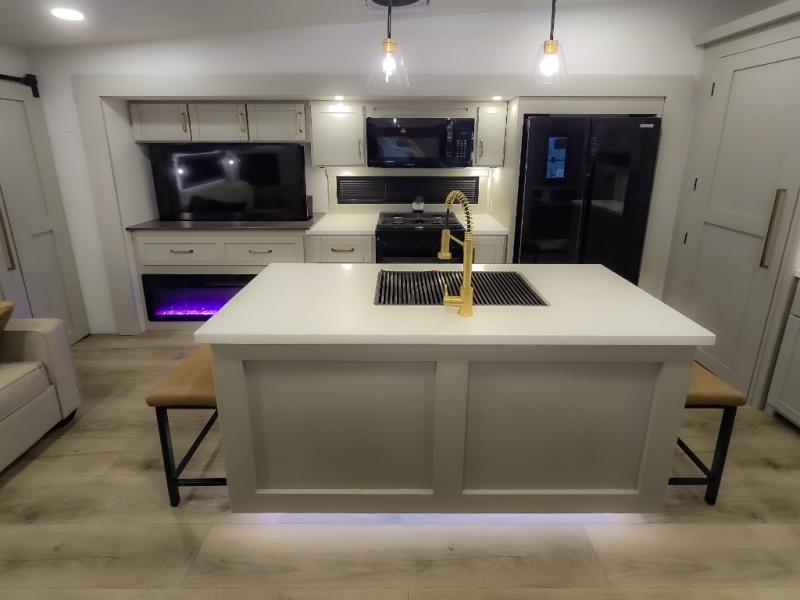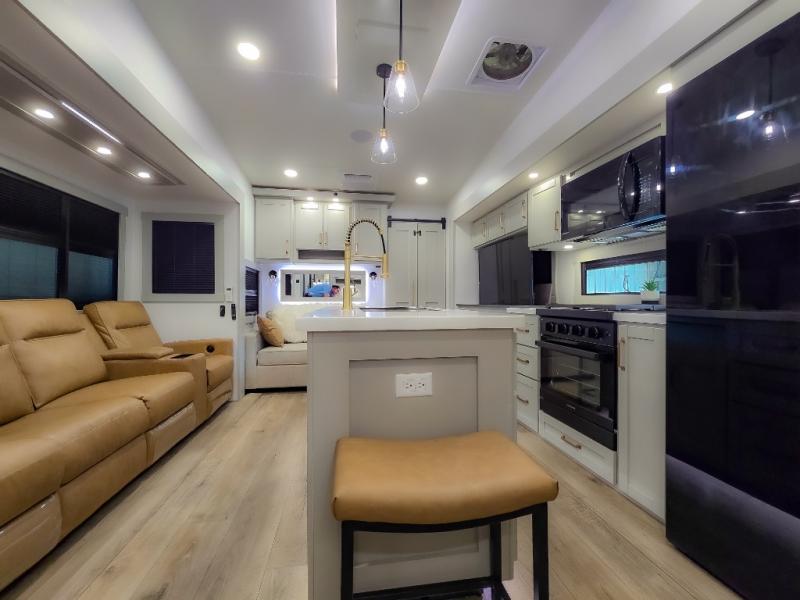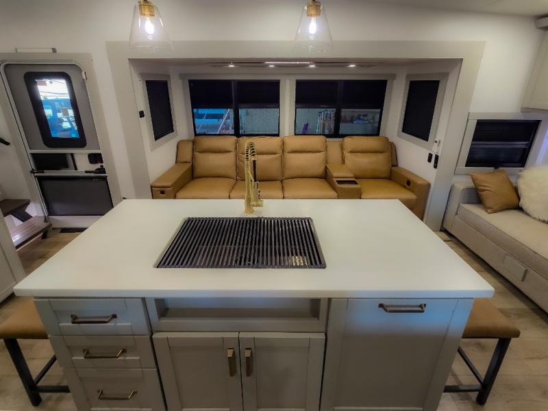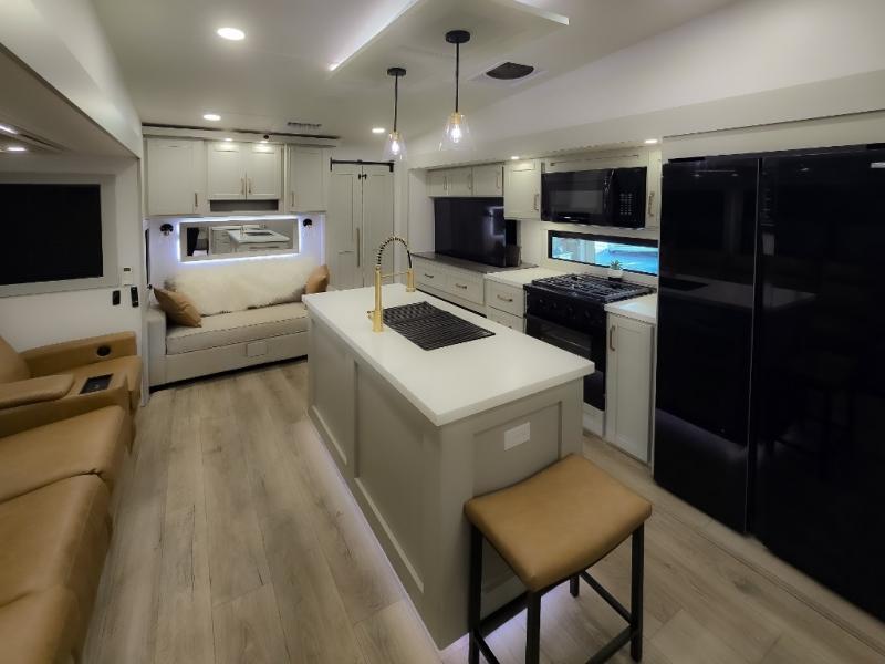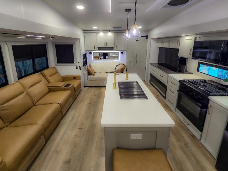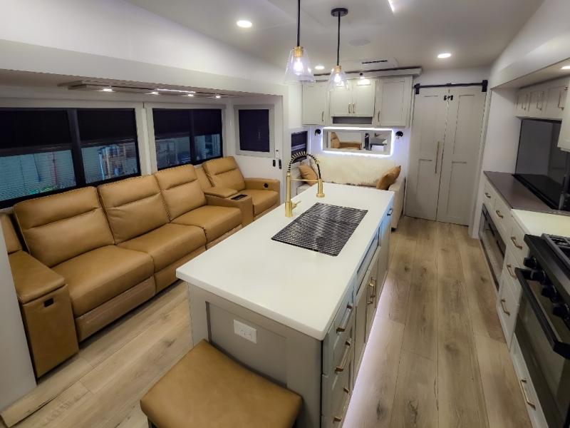 The Brinkley mid-profile Model Z fifth wheels bring you clean lines and an upscale look with plenty of style and exciting new features like the industry first brass plumbing connections. These units also feature an automotive grade front cap, plenty of exterior storage, exterior hot and cold showers, and wide stance leveling jacks for easy set up. Residential frameless windows provide a clean look and beautiful views, and ample electrical outlets and 6 USB/USB-C outlets allow all of your electronics and appliances to easily be used and charged.
