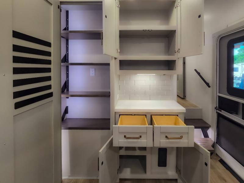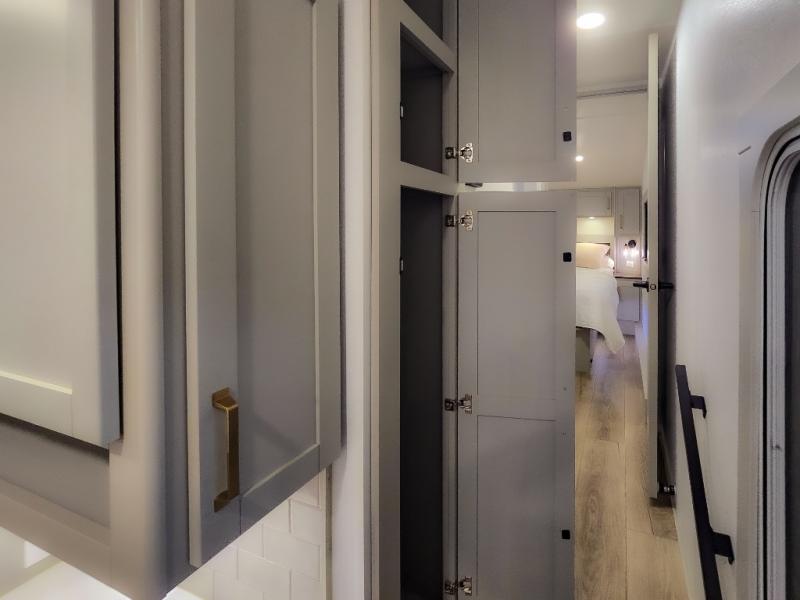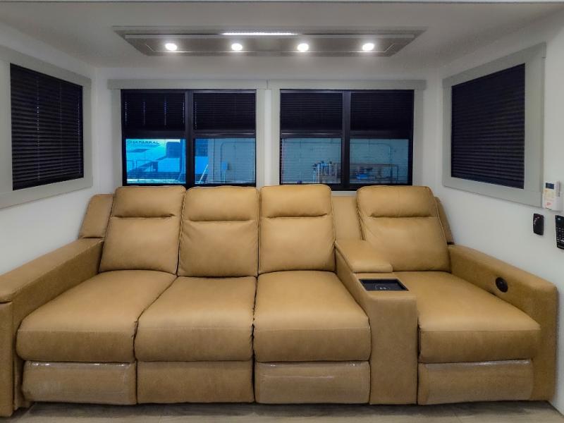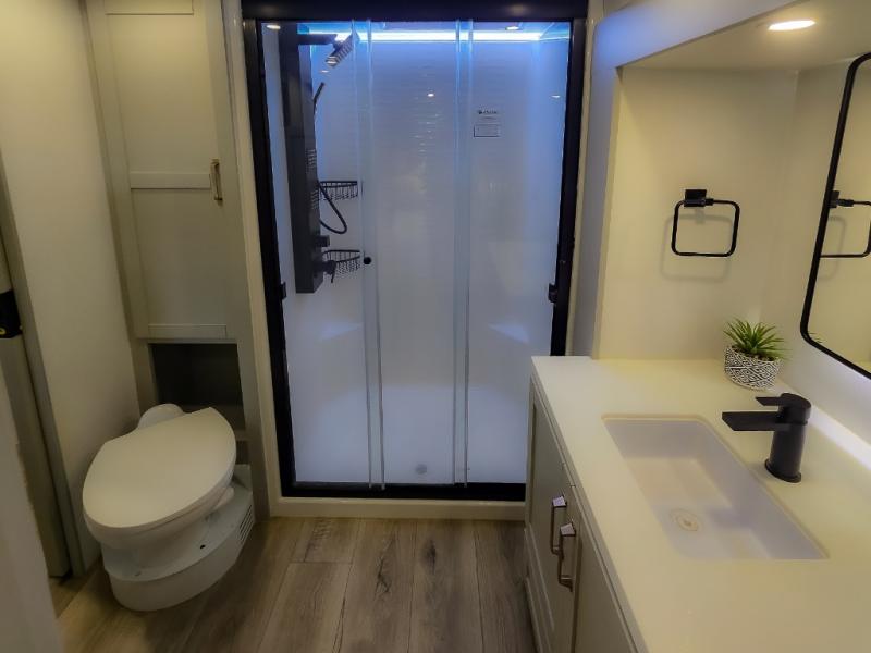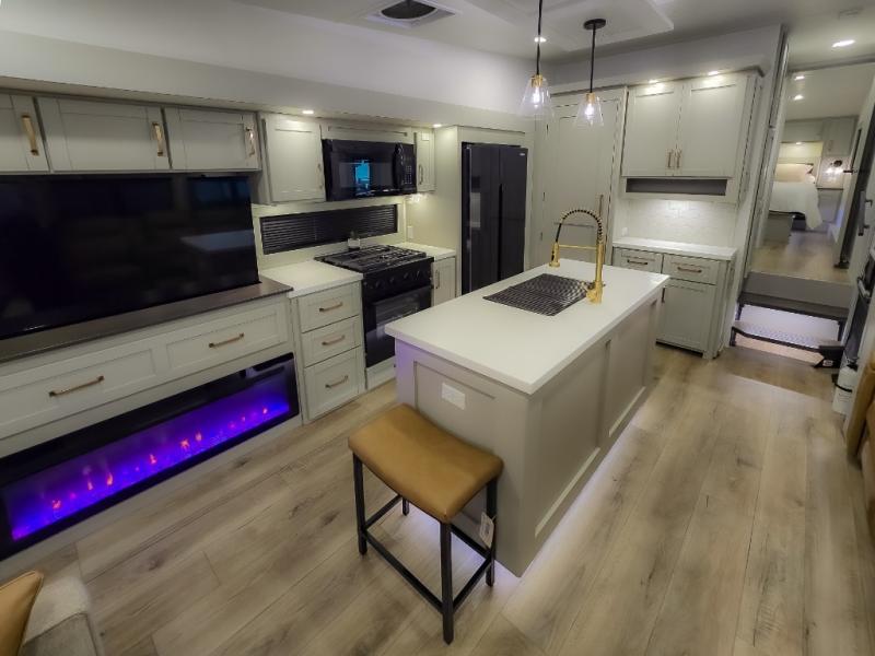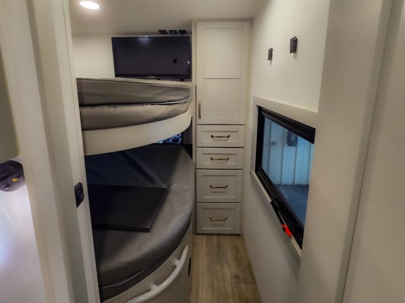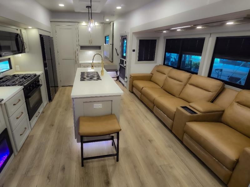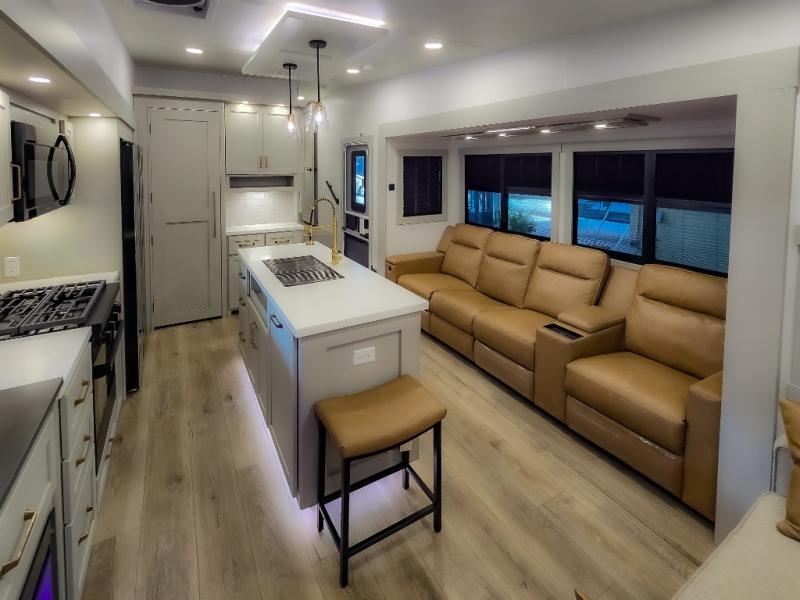 The perfect unit for your larger family, this Model Z can sleep eight! Step inside and find a wide open combined kitchen and living room. There is a large slide out theater seat with two recliners and seating for four, plus a 60" tri-fold sofa, and a televator and fireplace in the appliance slide along the roadside. The center island features dual trash bins and stow & go paper towel holder, a large sink, and even dog bowls for your favorite furry friend. A 16 cu. ft. refrigerator will house all of your perishables, and you will also have an 84" pantry with adjustable shelves for all of your dry goods and snacks. Head up the steps to your right, just inside the entry, to find a private master bedroom and bath at the end of the hall. Here you will find a queen bed, slide out wardrobe with dresser, and the bathroom vanity. A large 30" x 42" shower will welcome you each morning or night to keep clean and refreshed. At the very back of the unit, guests will enjoy a private bunkhouse with 54" x 74" bunk beds, a TV, and wardrobe with drawers beneath. The outside features over 160 cu. ft. of exterior storage with mid-coach pass-through and exterior storage access, plus two awnings for added outdoor living.