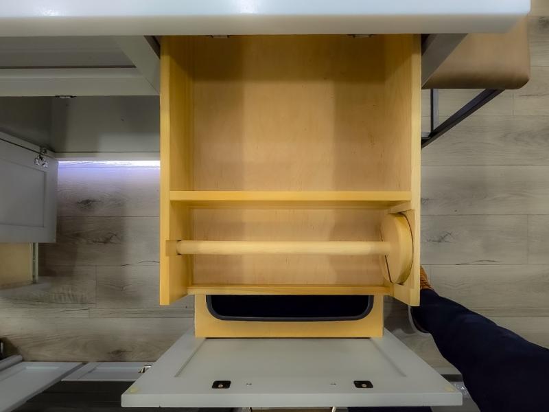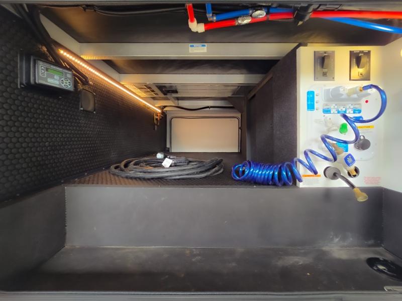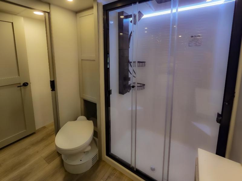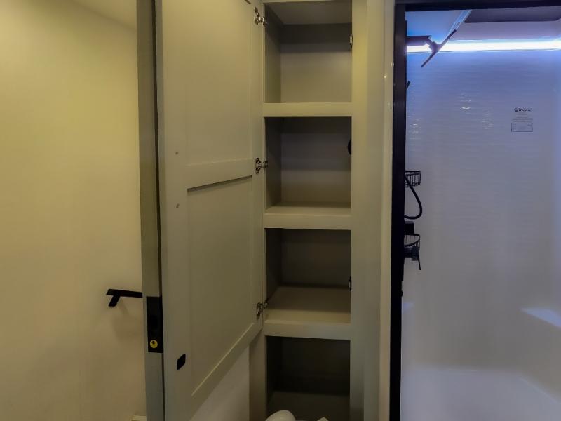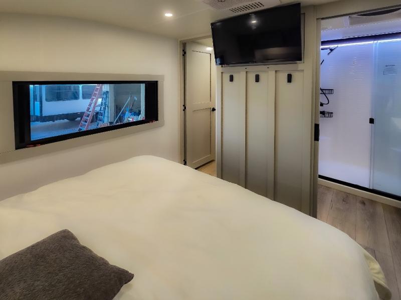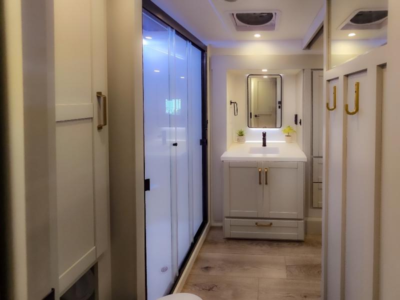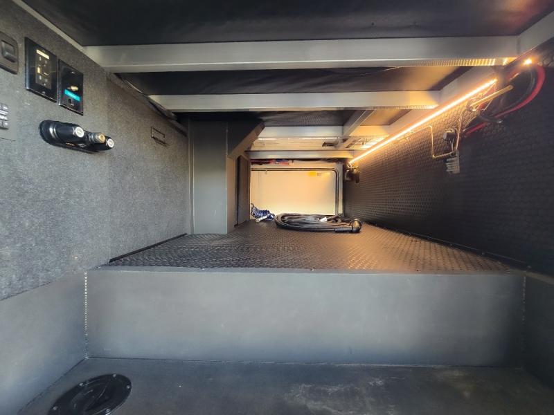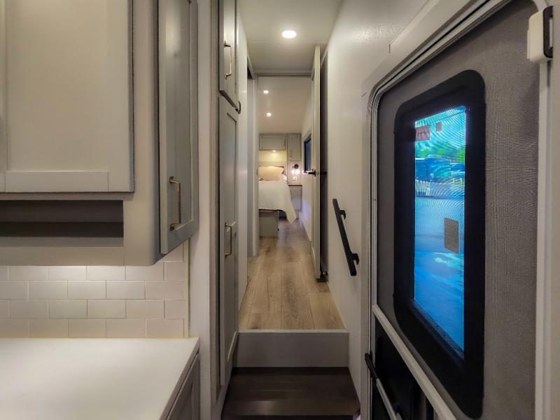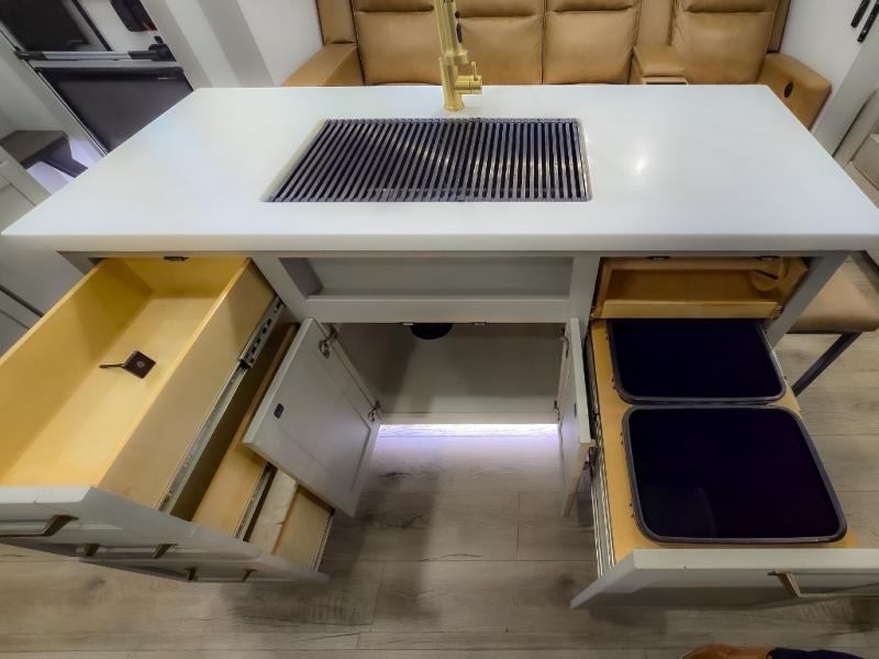 The perfect unit for your larger family, this Model Z can sleep eight! Step inside and find a wide open combined kitchen and living room. There is a large slide out theater seat with two recliners and seating for four, plus a 60" tri-fold sofa, and a televator and fireplace in the appliance slide along the roadside. The center island features dual trash bins and stow & go paper towel holder, a large sink, and even dog bowls for your favorite furry friend. A 16 cu. ft. refrigerator will house all of your perishables, and you will also have an 84" pantry with adjustable shelves for all of your dry goods and snacks. Head up the steps to your right, just inside the entry, to find a private master bedroom and bath at the end of the hall. Here you will find a queen bed, slide out wardrobe with dresser, and the bathroom vanity. A large 30" x 42" shower will welcome you each morning or night to keep clean and refreshed. At the very back of the unit, guests will enjoy a private bunkhouse with 54" x 74" bunk beds, a TV, and wardrobe with drawers beneath. The outside features over 160 cu. ft. of exterior storage with mid-coach pass-through and exterior storage access, plus two awnings for added outdoor living.