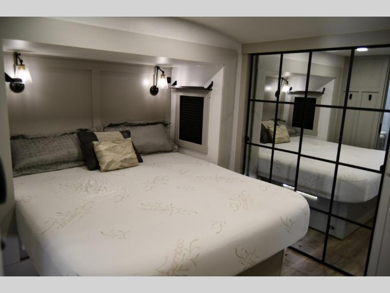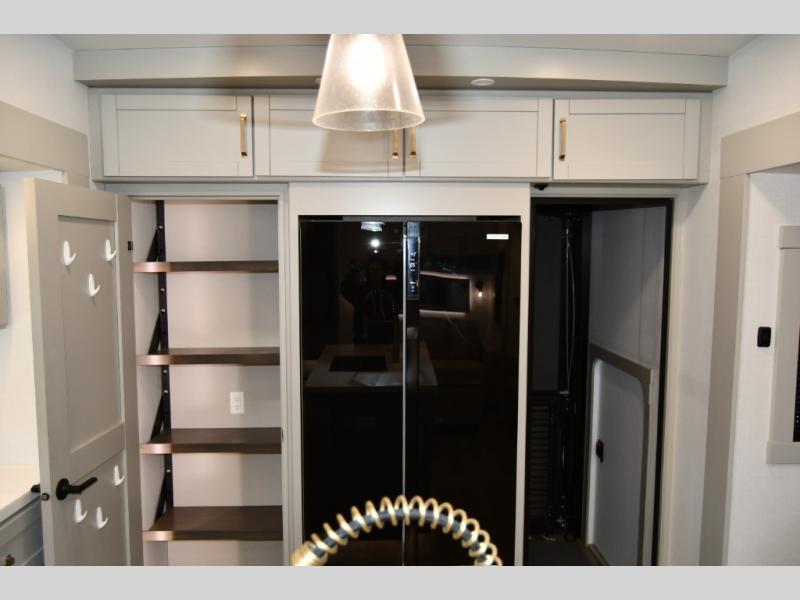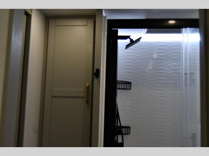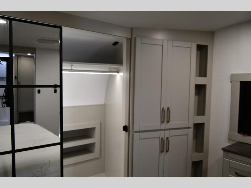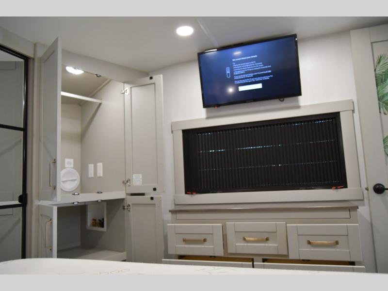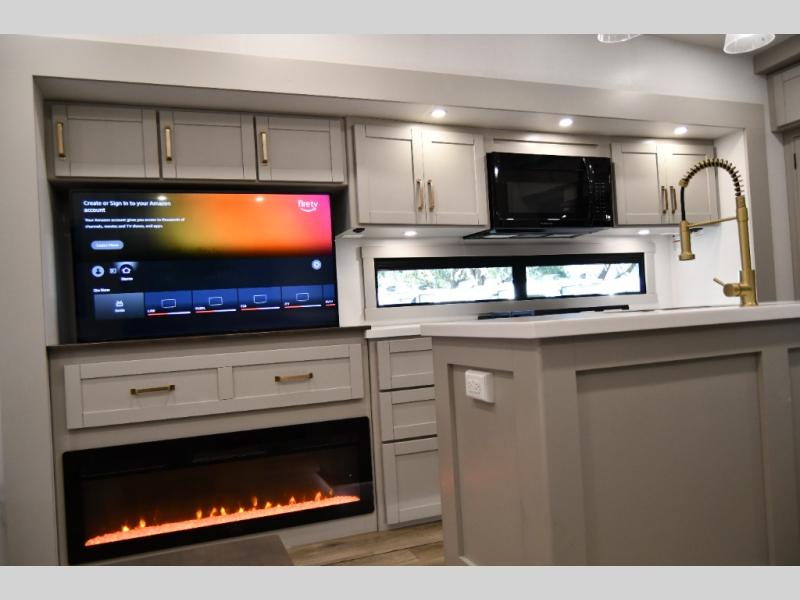 The gourmet kitchen is built for extended stays and full-time RV living, complete with premium appliances, ample storage, and an oversized island ideal for entertaining or everyday use. The private master suite delivers true residential comfort with a king-size bed, generous wardrobe space, and a spa-inspired bathroom designed for relaxation on the road.