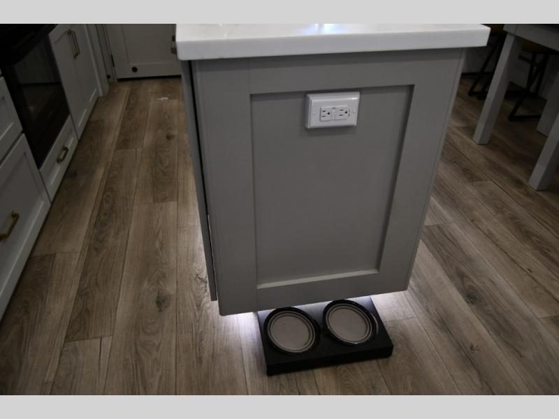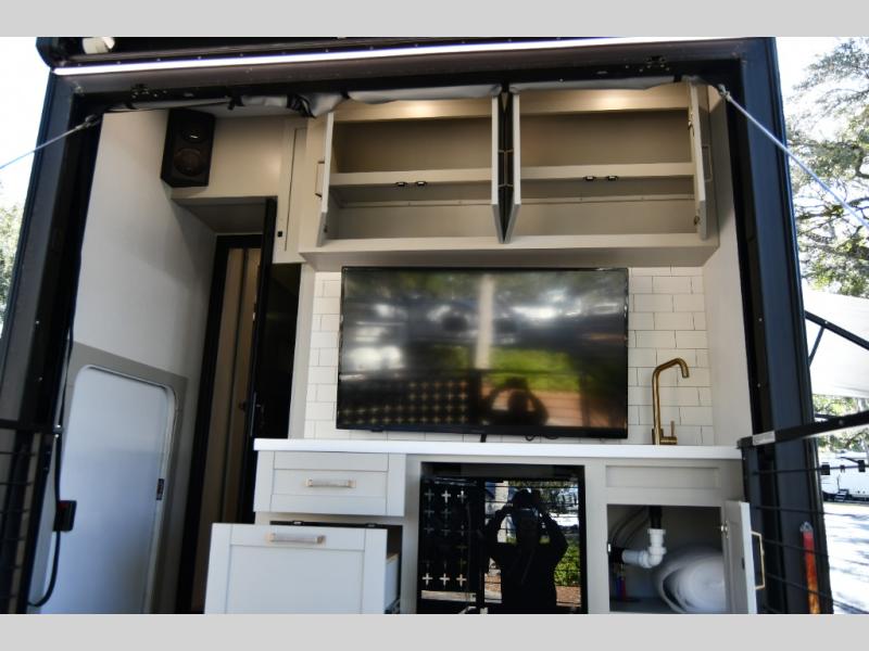 You're going to love every minute spent in this triple slide out fifth wheel! Once you arrive at the campground, you can put out the two side awnings, set up the rear patio and awning, then make lunch on the outdoor kitchen! There is also an outdoor TV here, a bar sink, and a refrigerator to keep drinks close by! Inside, the chef will find everything they need if the weather isn't cooperating, including a 30" residential microwave, 16 cu. ft. refrigerator, plus a large kitchen island, complete with dual trash bins and dog bowls at the foot. Your crew can get cozy on the tri-fold sofa that extends to a 54" x 70" bed for guests, and there is theater seating across from the televator and fireplace for easy viewing! You will find the front private bedroom ultra accommodating with its king bed slide out, sliding dresser top with hidden storage, your own TV, and a front wardrobe with shelves and a shoe rack. There is even washer and dryer prep if you want the option to make laundry day that much easier!