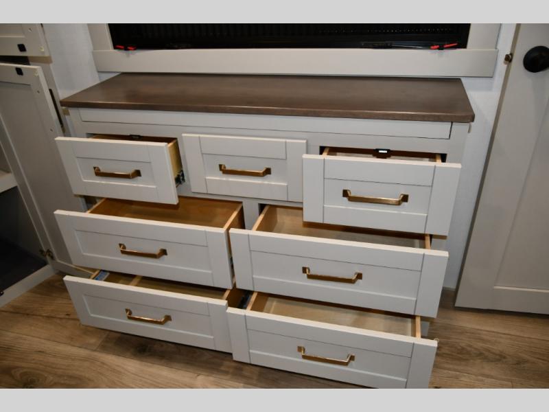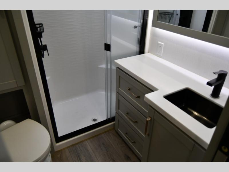 The Brinkley mid-profile Model Z fifth wheels bring you clean lines and an upscale look with plenty of style and exciting new features like the industry first brass plumbing connections. These units also feature an automotive grade front cap, plenty of exterior storage, exterior hot and cold showers, and wide stance leveling jacks for easy set up. Residential frameless windows provide a clean look and beautiful views, and ample electrical outlets and 6 USB/USB-C outlets allow all of your electronics and appliances to easily be used and charged.