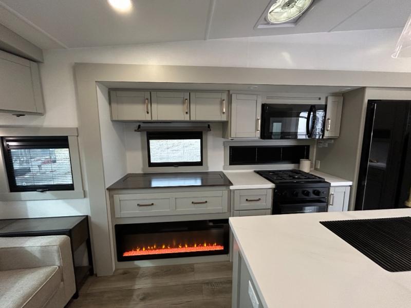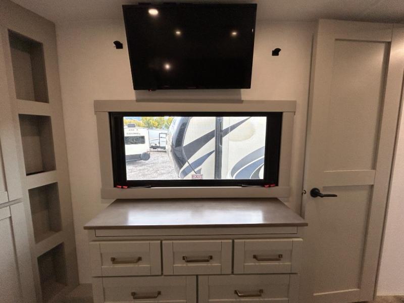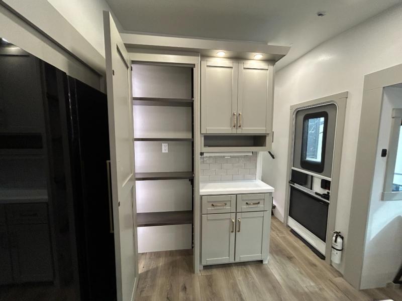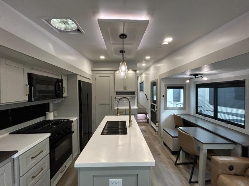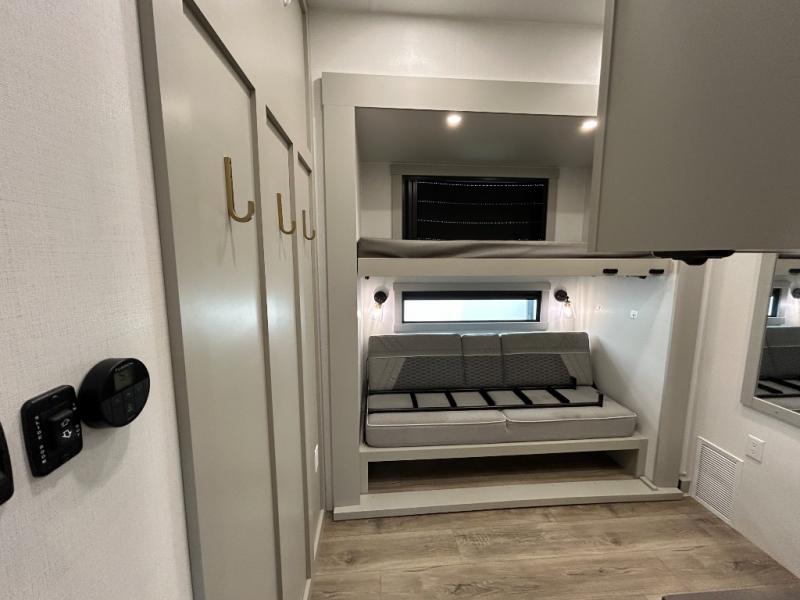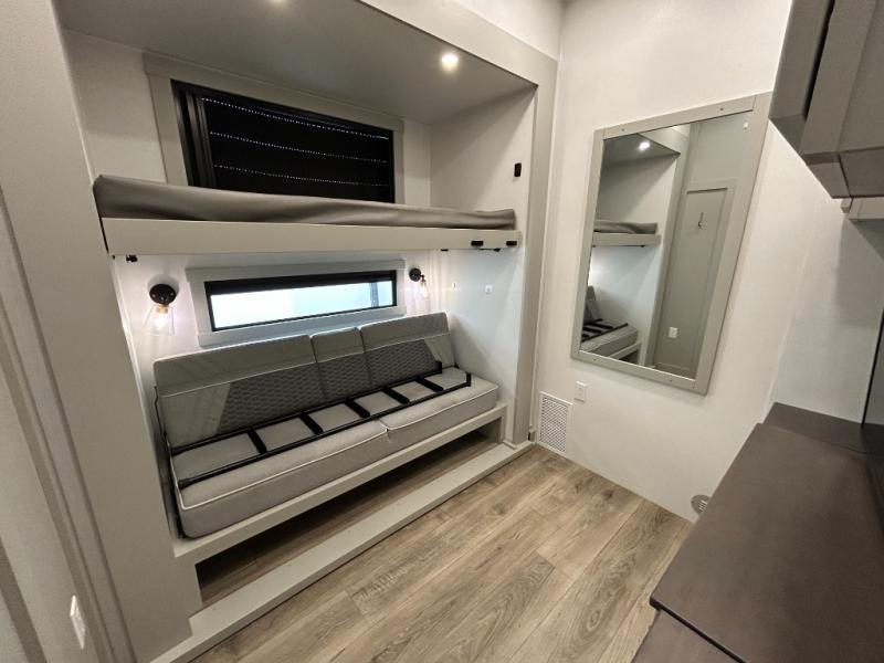 The perfect unit for your family that needs sleeping space for eight! This Model Z luxury fifth wheel is bright and modern on the inside, with loads of amenities that will make all of your adventures comfortable Enter and find a spacious combined living/kitchen space thanks to dual opposing slides. There is ample seating with a free standing dinette that includes a built-in utensil drawer, 62" theater seating, and a 72" tri-fold sofa along the rear wall. You can easily relax and enjoy the telescoping TV with a cozy fireplace below. The kitchen offers all that you need to prepare and cook meals just like home with a 16 cu. ft. refrigerator for your perishables, a 30" residential microwave oven, and three burner range top and oven. You will love the kitchen island all outfitted with pull-out pet bowls and double pull out trash bins with an integrated Stow & Go paper towel holder. There is also an 84" pantry with adjustable shelves for all of your canned and dry goods. Mid-coach, just ahead through the main entry, is a bonus room that can be used as a bedroom featuring a sofa bed with flip-up overhead bunk and trundle below, or an office with pull-out desk so that you can work easily while you travel, or it could also be used as a gaming room since there is also a 50" Smart TV. Head up the steps to a bathroom on your left and a private master suite with king bed slide all the way up front. You can opt for the queen bed if you like. A sliding dresser top features hidden storage which is perfect for jewelry and other personal belongings. The front wardrobe features mirrored doors and the corner closet has been prepped for a stackable washer and dryer if you choose to add that option. Relax and enjoy a large bath featuring a linen cabinet, a 30" x 42" shower, and vanity with sink, plus medicine cabinet. You will also appreciate having dual showers on the outside of this unit, one on each side, and a rear baggage door and mid-coach pass-through storage.
