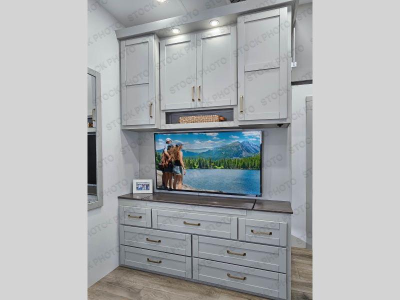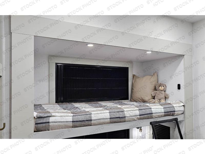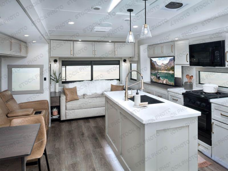 The perfect unit for your family that needs sleeping space for eight! This Model Z luxury fifth wheel is bright and modern on the inside, with loads of amenities that will make all of your adventures comfortable Enter and find a spacious combined living/kitchen space thanks to dual opposing slides. There is ample seating with a free standing dinette that includes a built-in utensil drawer, 62" theater seating, and a 72" tri-fold sofa along the rear wall. You can easily relax and enjoy the telescoping TV with a cozy fireplace below. The kitchen offers all that you need to prepare and cook meals just like home with a 16 cu. ft. refrigerator for your perishables, a 30" residential microwave oven, and three burner range top and oven. You will love the kitchen island all outfitted with pull-out pet bowls and double pull out trash bins with an integrated Stow & Go paper towel holder. There is also an 84" pantry with adjustable shelves for all of your canned and dry goods. Mid-coach, just ahead through the main entry, is a bonus room that can be used as a bedroom featuring a sofa bed with flip-up overhead bunk and trundle below, or an office with pull-out desk so that you can work easily while you travel, or it could also be used as a gaming room since there is also a 50" Smart TV. Head up the steps to a bathroom on your left and a private master suite with king bed slide all the way up front. You can opt for the queen bed if you like. A sliding dresser top features hidden storage which is perfect for jewelry and other personal belongings. The front wardrobe features mirrored doors and the corner closet has been prepped for a stackable washer and dryer if you choose to add that option. Relax and enjoy a large bath featuring a linen cabinet, a 30" x 42" shower, and vanity with sink, plus medicine cabinet. You will also appreciate having dual showers on the outside of this unit, one on each side, and a rear baggage door and mid-coach pass-through storage.