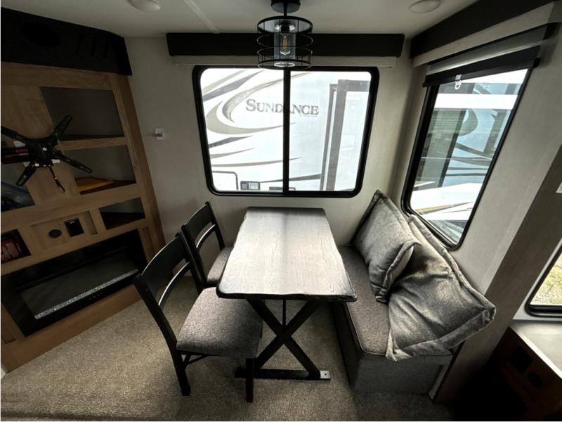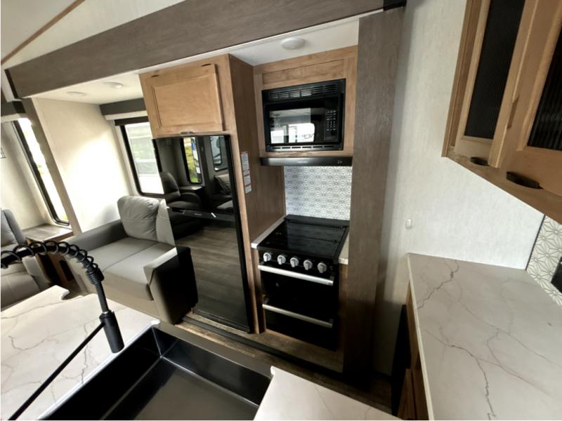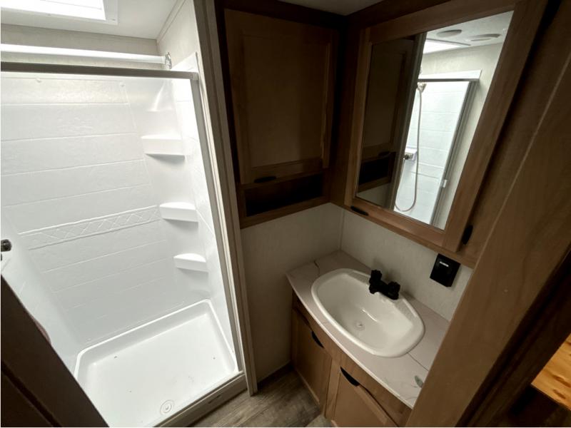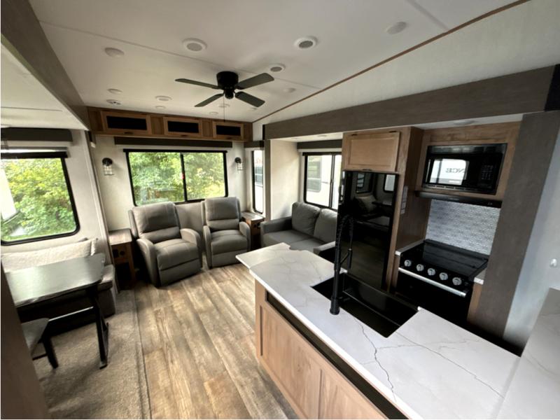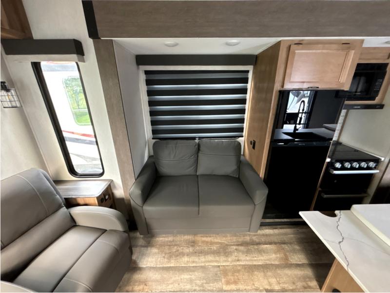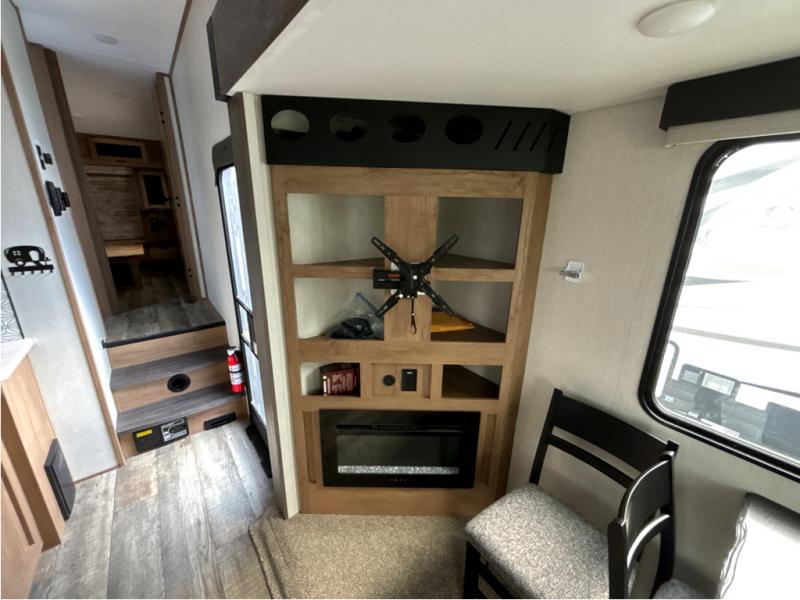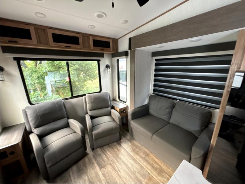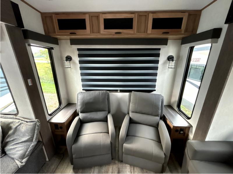 This fifth wheel is perfect for couple's but also has enough space for company too! The rear living area features two recliners with end tables on either side to set your cup of coffee, a tri-fold sofa that can transform into an extra sleeping space, and free standing table with chairs and storage ottoman seat to enjoy your meals by the electric fireplace. The fully equipped kitchen has everything you need including a convenient wine rack. After a fun-filled day at the beach, rinse off in the full bathroom with the shower and hang your swimsuit up to dry on the removable shower rod when you're done. The front private bedroom has a queen bed to lay your head on at night and there is even USB ports on either side to charge your electronics!