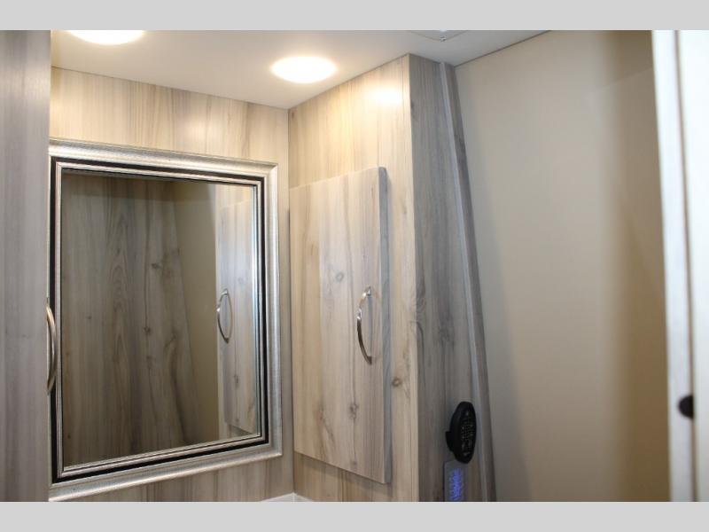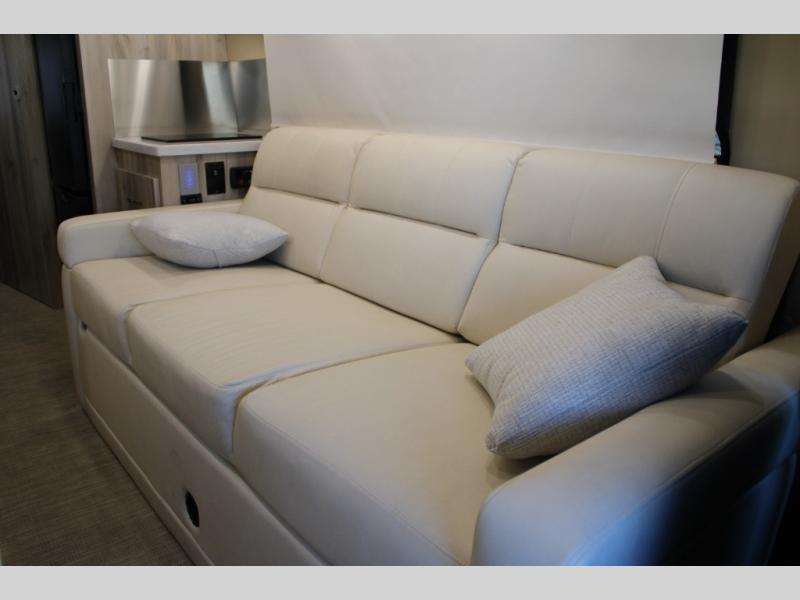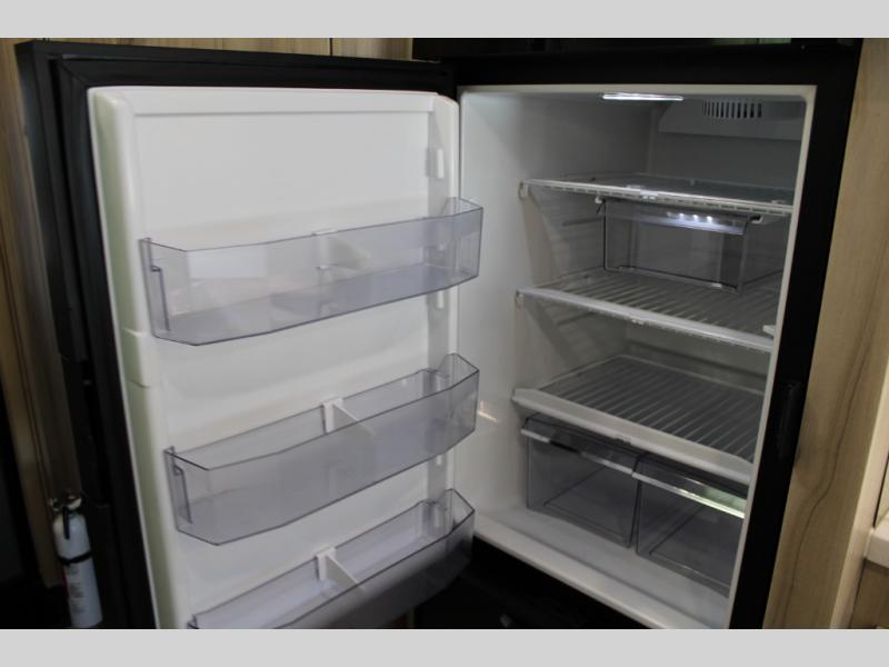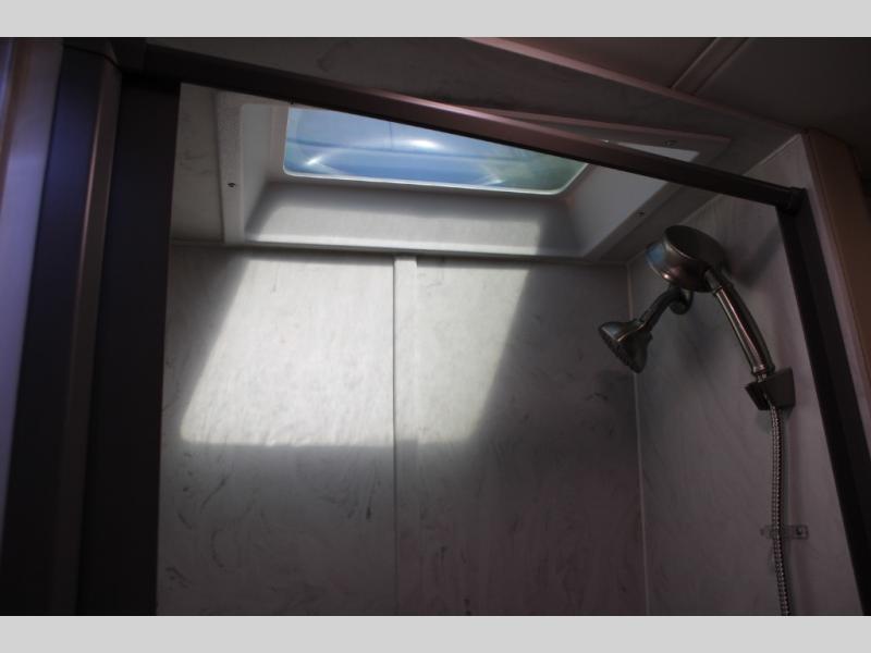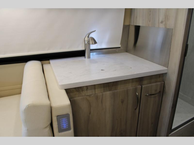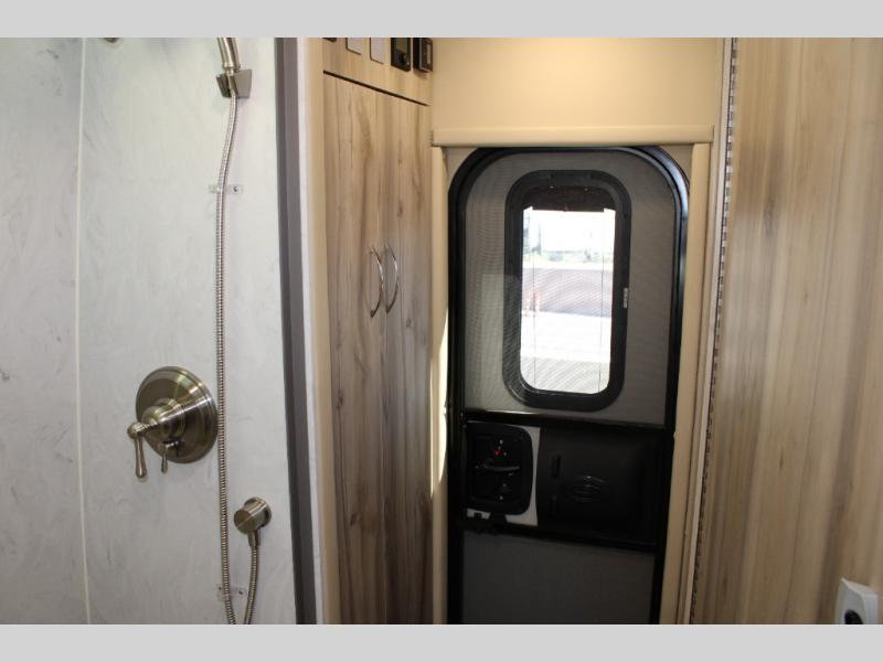 Hit the road in true luxury with this motorhome! The separated bathroom makes it convenient for one to use the private toilet and sink while another cleans up in the 39" x 29" shower. There is also a wardrobe to keep your towels close by and a powered vent fan for ventilation with a rain sensor and reversible functions. This model includes a single sofa and a booth dinette that can convert to a 76" x 84" bed for a great night's rest. You can prepare delicious home cooked meals with a single induction cooktop which can be removed for exterior cooking, a Dometic 6 cu. ft. dual-swing motion doors refrigerator to store any leftovers, and a 1.1 cu. ft. stainless steel convection microwave to heat them up. The Entertainment Center package not only includes a 32" Samsung TV, but also a high performance JBL by Harman Aura in-wall media center with a JBL sub-woofer and JBL 6.5" Coaxial ceiling speakers.