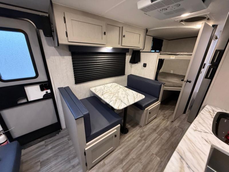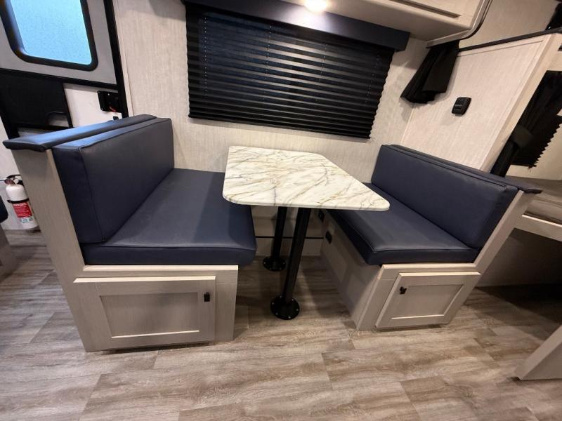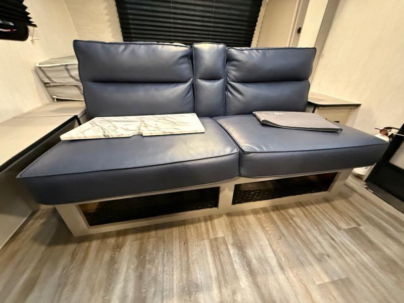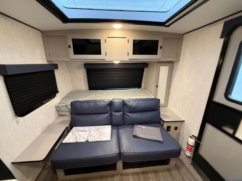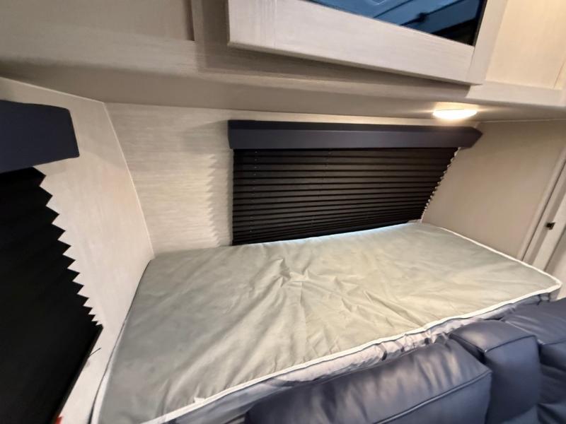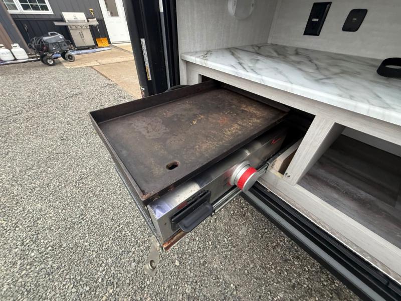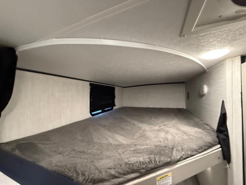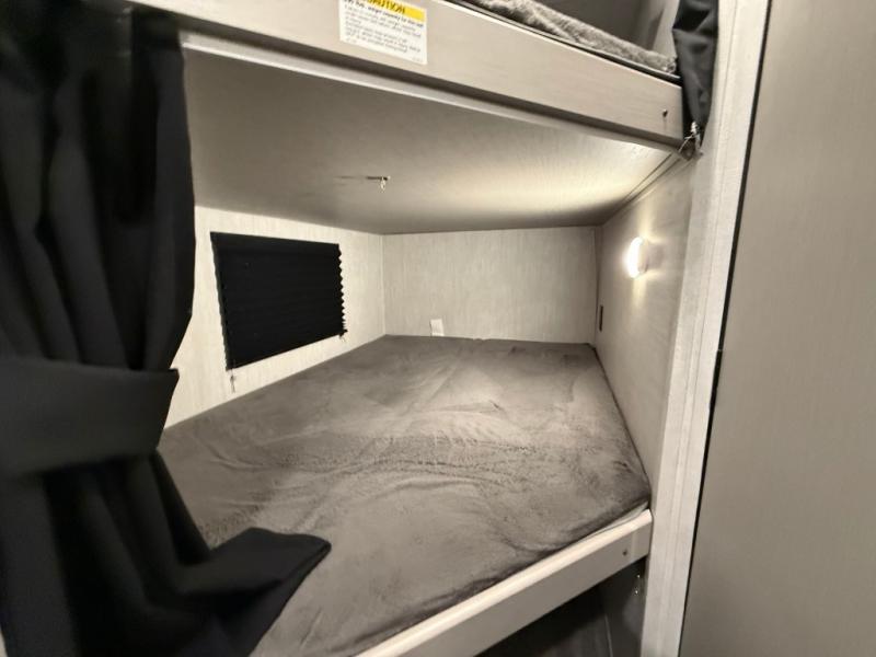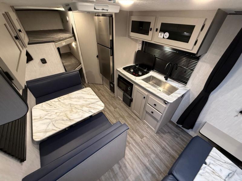 This travel trailer offers versatility with a front Murphy bed! Depending on what time of day you enter the unit will determine whether you see the bed or the sofa. There is a rear corner double bed bunk above a lower flip up double bed and a booth dinette that can transform into an extra sleeping space when you're not using it to enjoy a meal or play a card game. Everyone can stay clean with tub/shower in the rear corner bathroom and keep their bellies full with the two burner cooktop and 8 cu. ft. 12V refrigerator. You can even cook outdoors with the exterior camp kitchen while staying protected by the power awning with LED lighting!