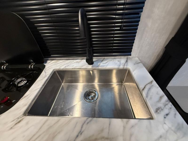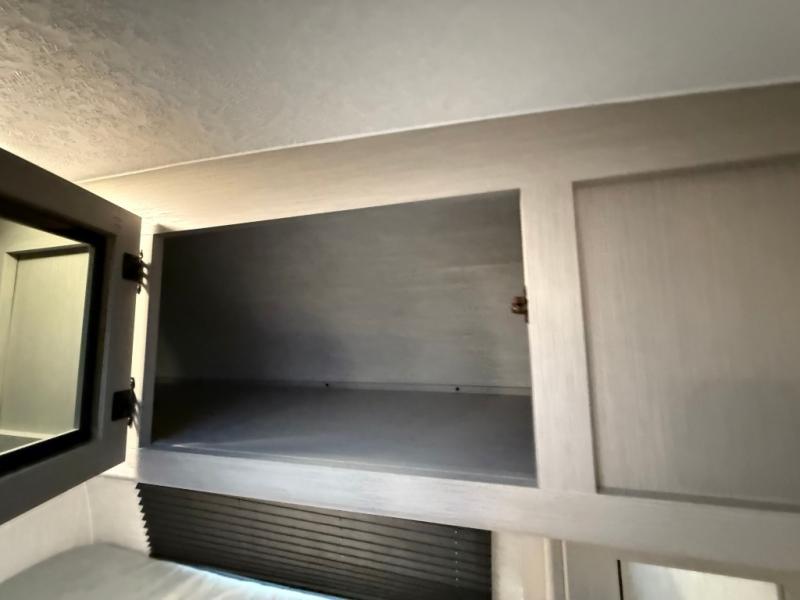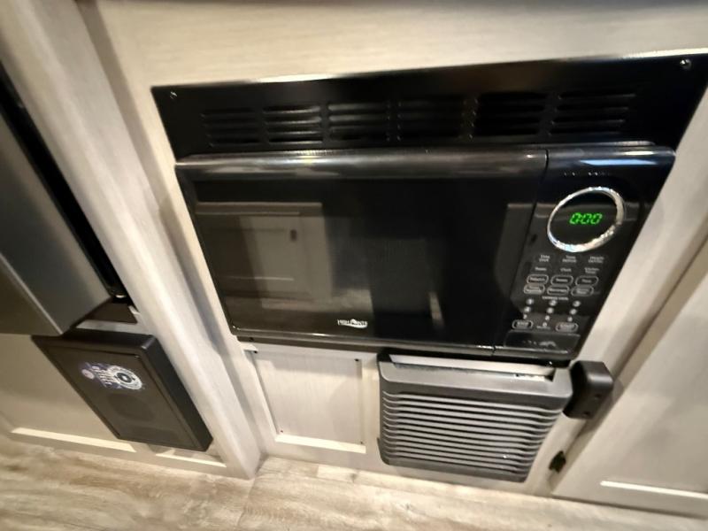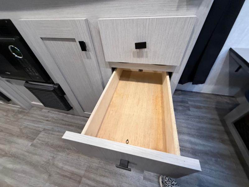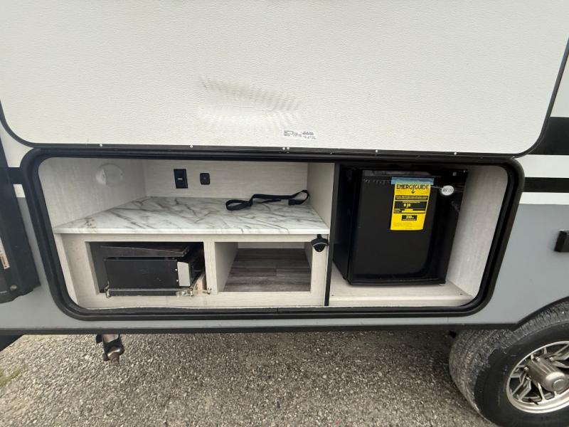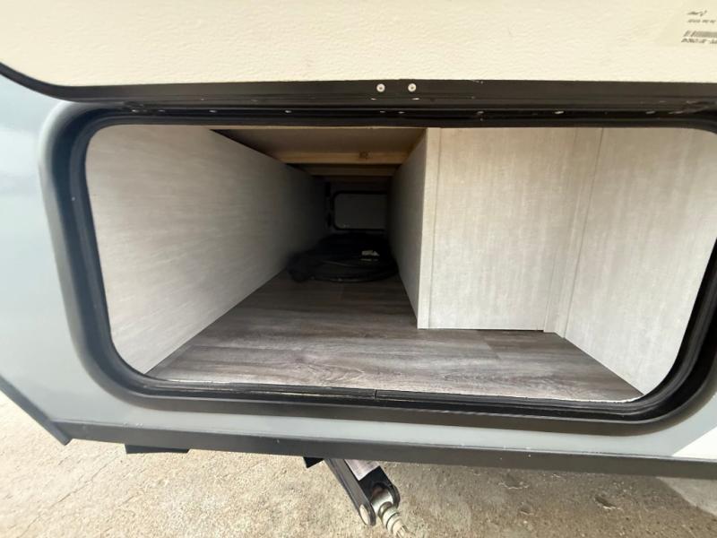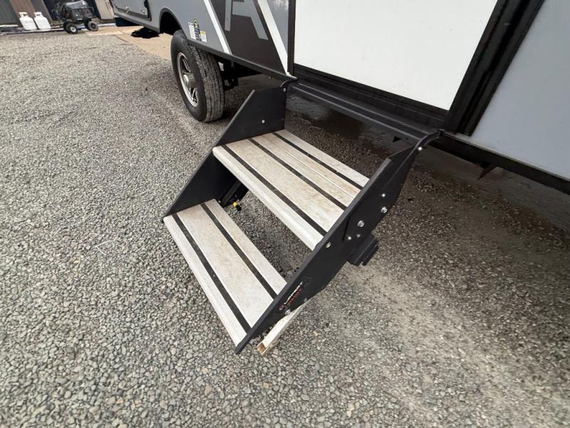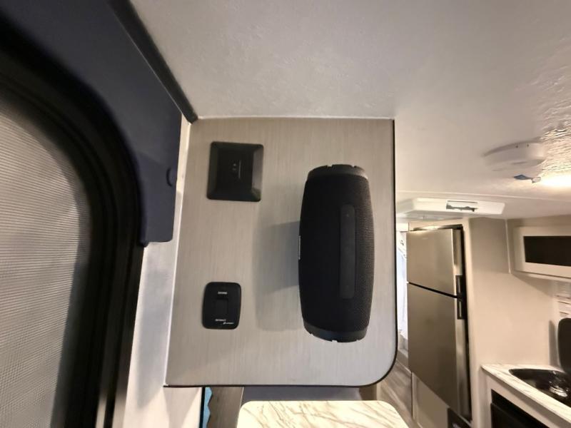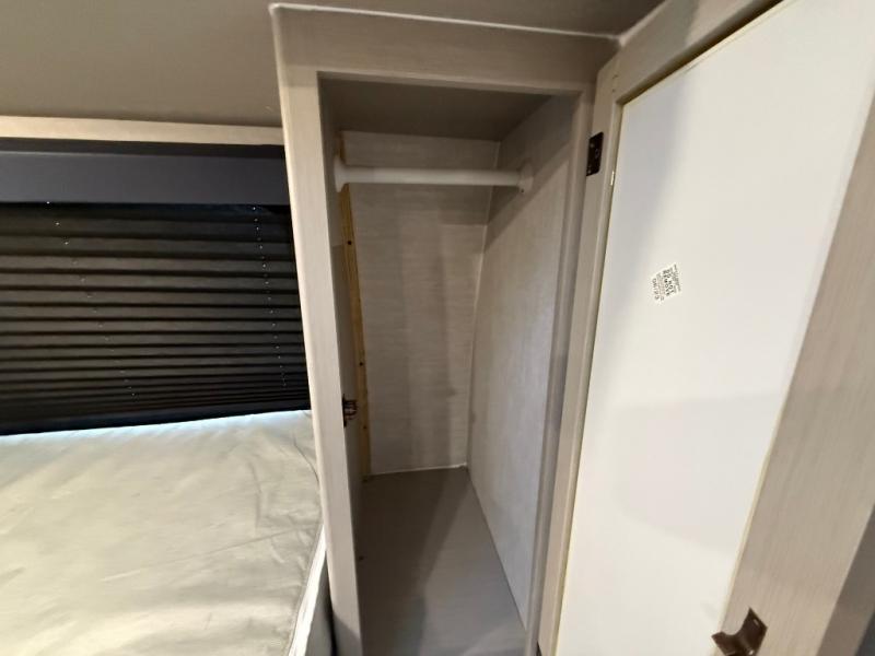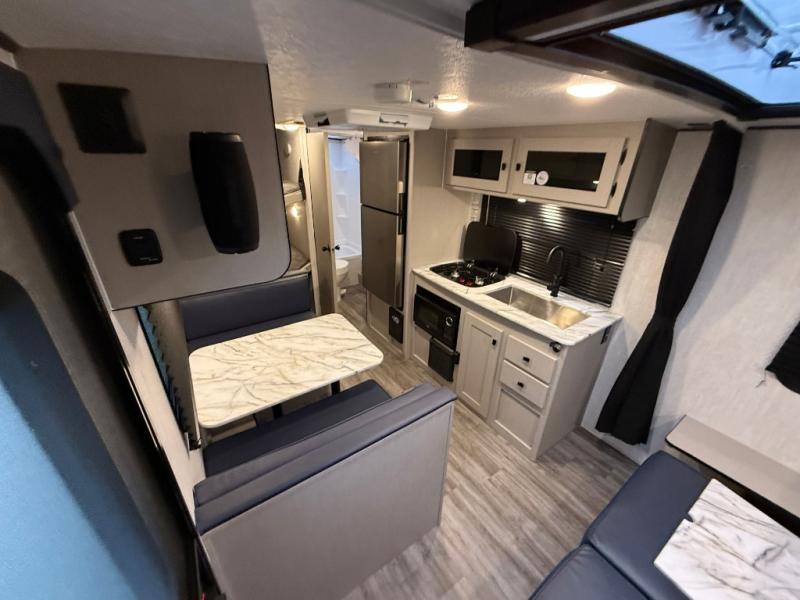 This travel trailer offers versatility with a front Murphy bed! Depending on what time of day you enter the unit will determine whether you see the bed or the sofa. There is a rear corner double bed bunk above a lower flip up double bed and a booth dinette that can transform into an extra sleeping space when you're not using it to enjoy a meal or play a card game. Everyone can stay clean with tub/shower in the rear corner bathroom and keep their bellies full with the two burner cooktop and 8 cu. ft. 12V refrigerator. You can even cook outdoors with the exterior camp kitchen while staying protected by the power awning with LED lighting!
